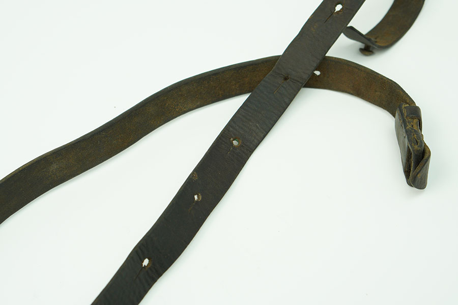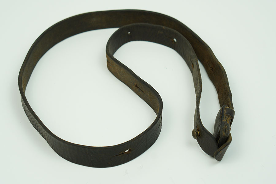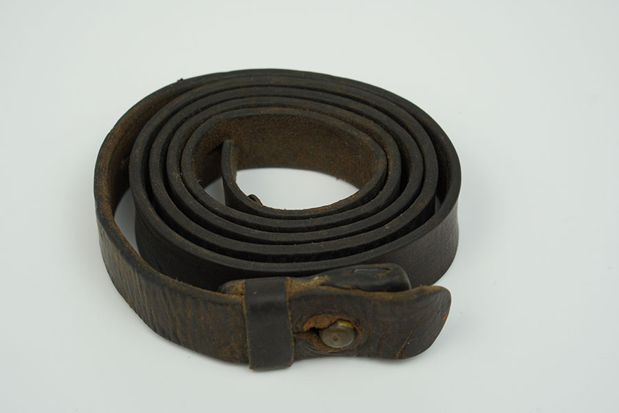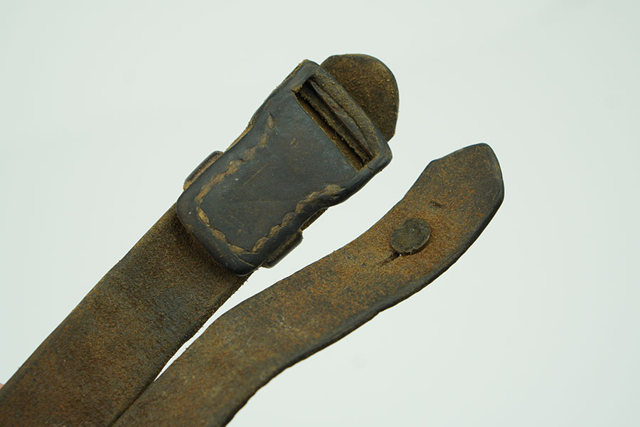1/17/24 – Unmarked leather sling for the MP40 Sub machine gun. Shows honest use and wear on the surface. The buckle is missing, however, the stud button is present. 44″ in length.