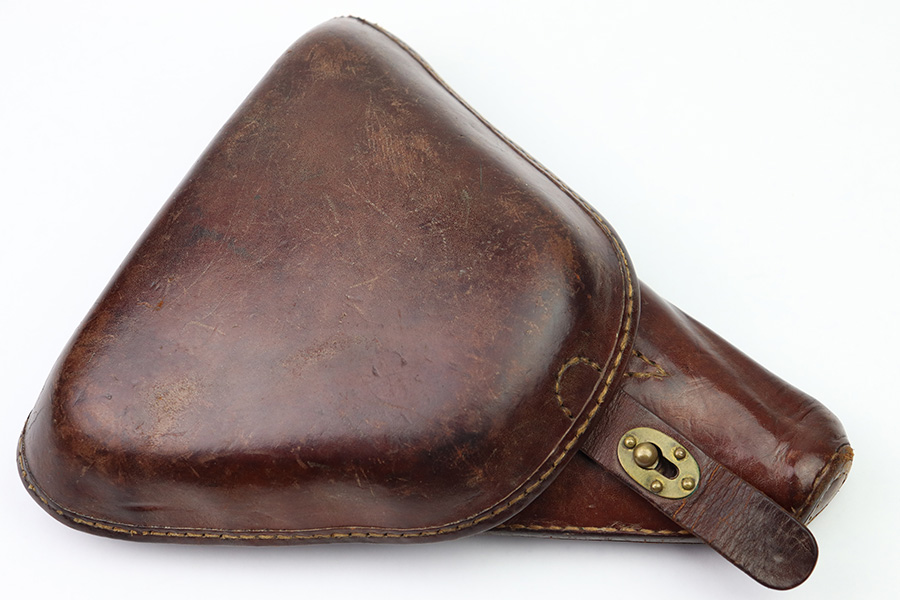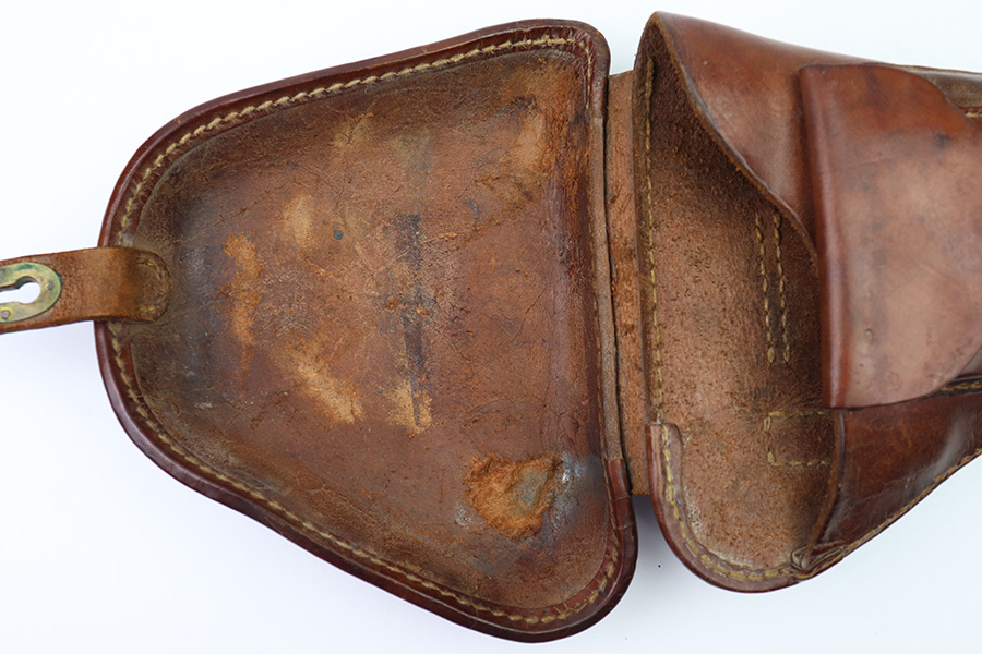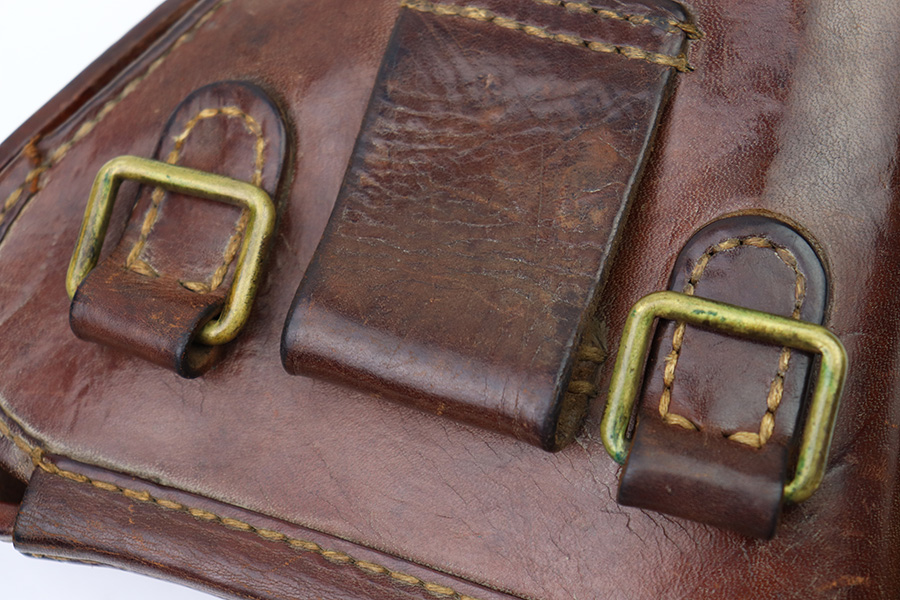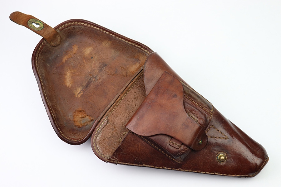 8/3/22 – This is an original leather Type 14 Nambu holster from WW2. The holster is all leather construction, which is fairly scarce as Japan ran low on supplies fairly quickly. The leather is in great condition and all the original stitching is intact. Nice bronze fixtures as well. There’s some typical signs of use and aging on the exterior, and the interior leather has some scuffing as shown.