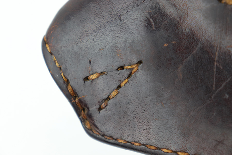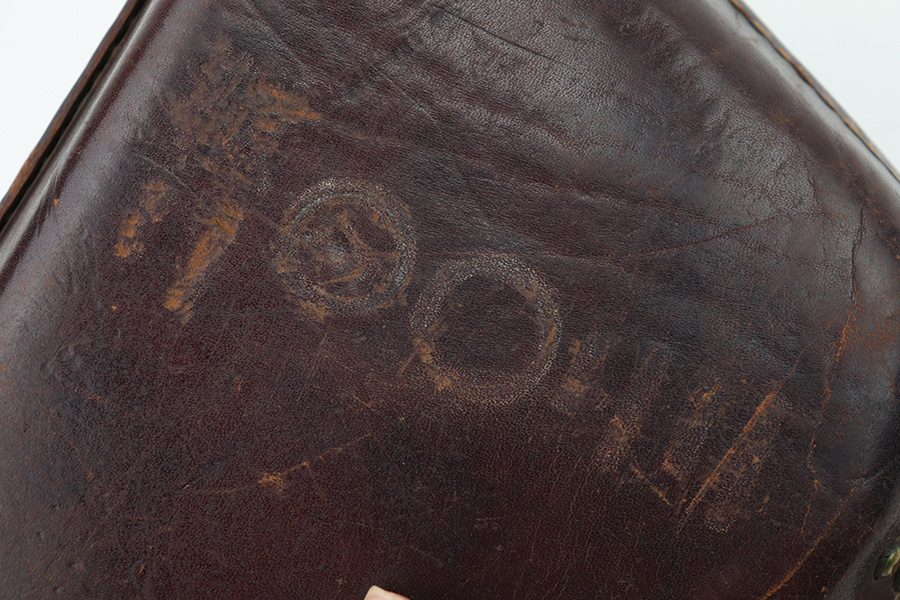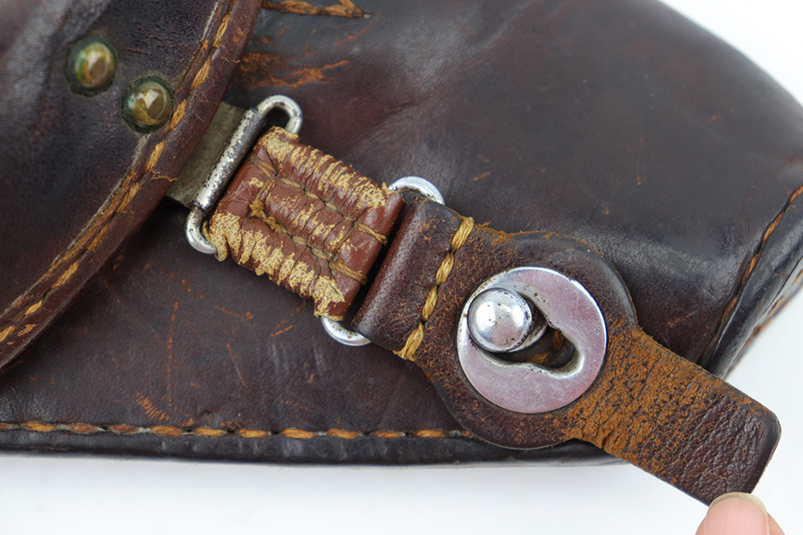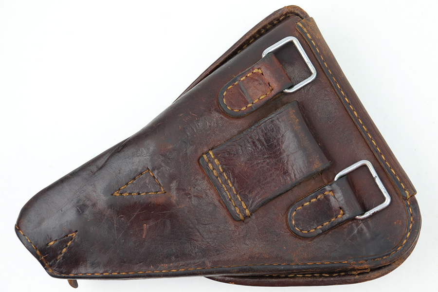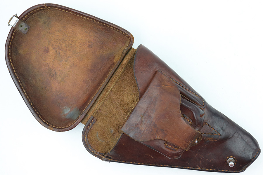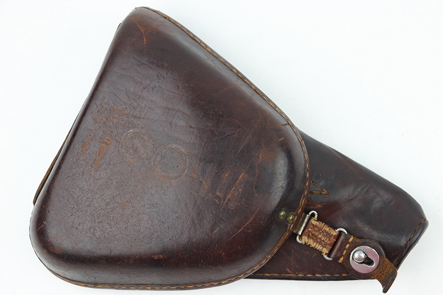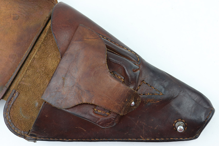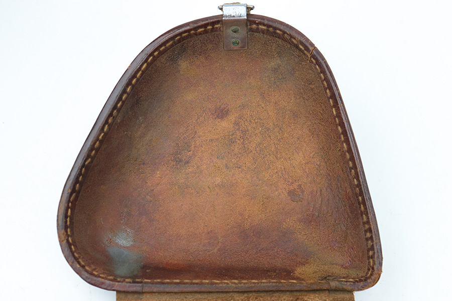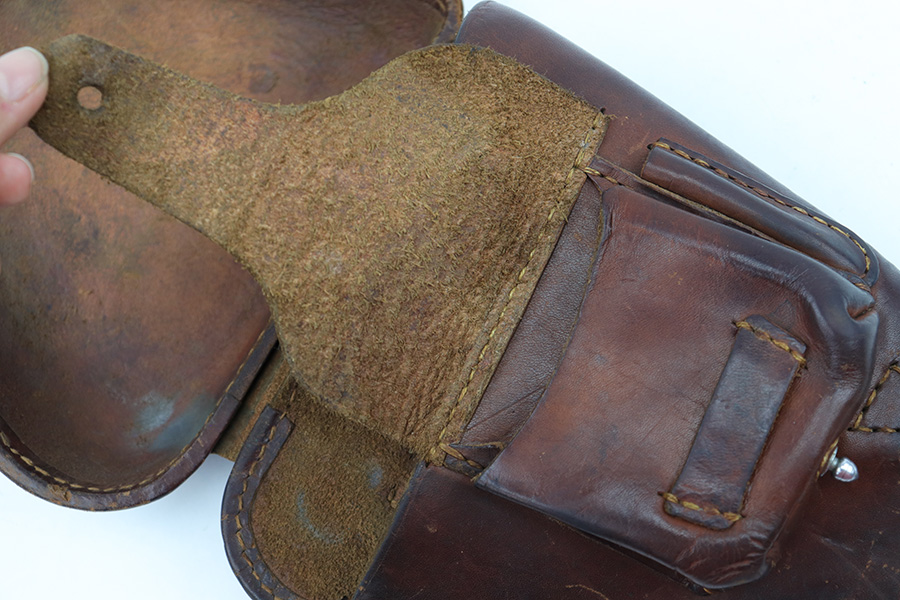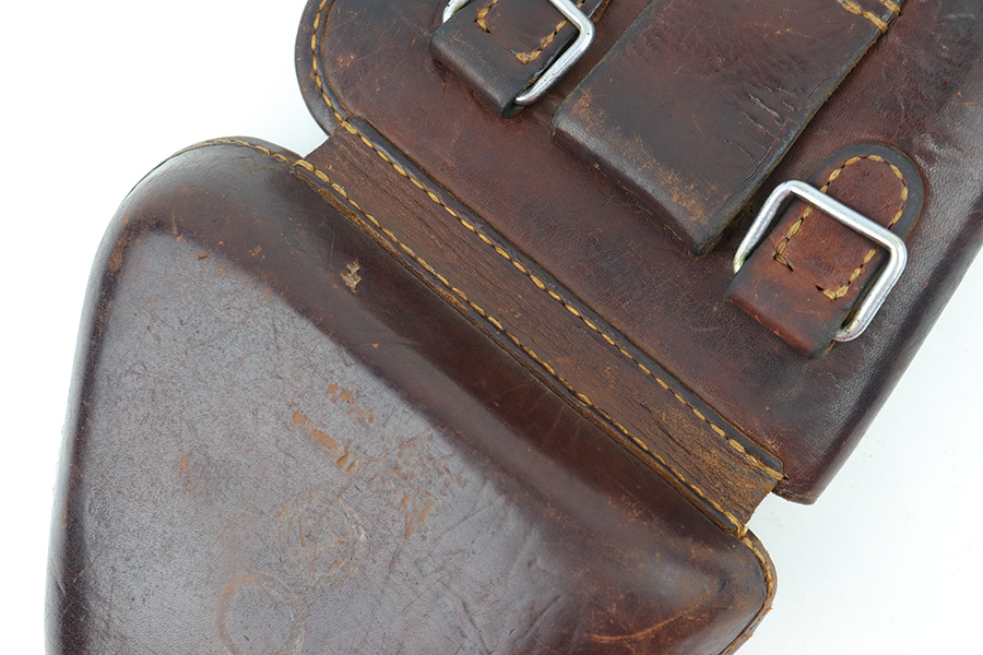 7/21/23 – This is an original leather Type 14 Nambu holster from WW2. The holster is earlier WW2 production with all leather construction and nickel fittings. The leather is in great overall condition despite some pliability and surface wear throughout the leather. The interior leather is fairly clean with typical signs of previous use. The stitching is all original and intact. There’s some light scratching on the front lid of the holster which looks like Japanese characters but we’re not sure.