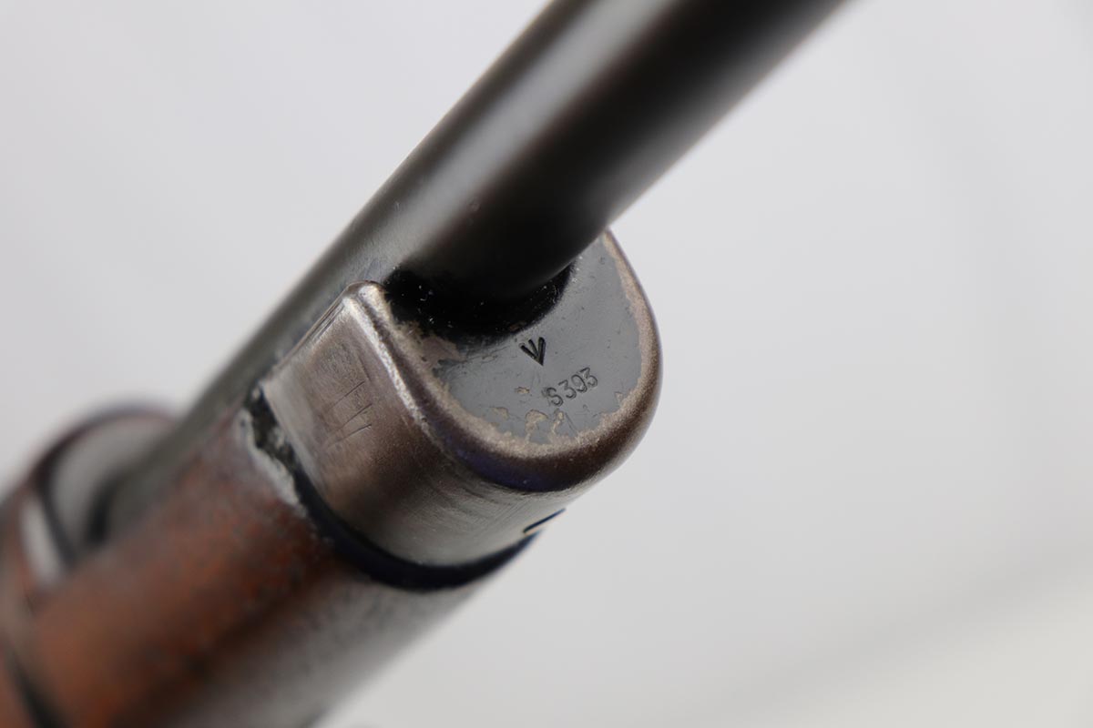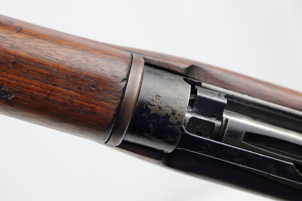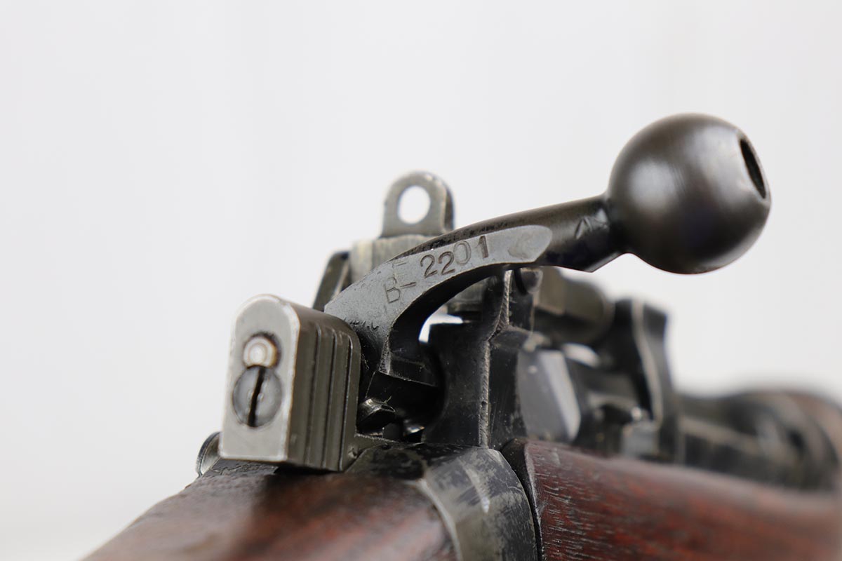 1/7/20 – The Lee-Enfield No.5 MkI gained its nickname, “Jungle Carbine,” from British troops who used the weapon in the Pacific Theater, but the name was never officially used by the military. The Jungle Carbine is a lighter, shorter variation of the No. 4 Mk I and was designed for use by British airborne forces. It is easily identifiable by the prominent flash hider that was designed to compensate for the increased flash that came with the shorter barrel. The rifle was only produced from 1944-1947 as it was ultimately seen as a flawed gun because it had a large recoil due to the short barrel and soldiers complained it had a “wandering zero.” Only about 250,000 of these rifles were produced. This particular Jungle Carbine was produced by BSA in 1945 and is in good condition with handling wear visible on most parts of the gun, but no major issues. Finish loss is prevalent on metal parts, especially the barrel. The wooden stock shows a number of scuffs and nicks, but no major chips or cracks. The bright, shiny bore is in excellent 9.5 out of 10 condition with very strong rifling and the mechanics are great. This makes it a great gun to take to the range. There is an export mark on the top of the barrel. The rifle is chambered for .303 British.
