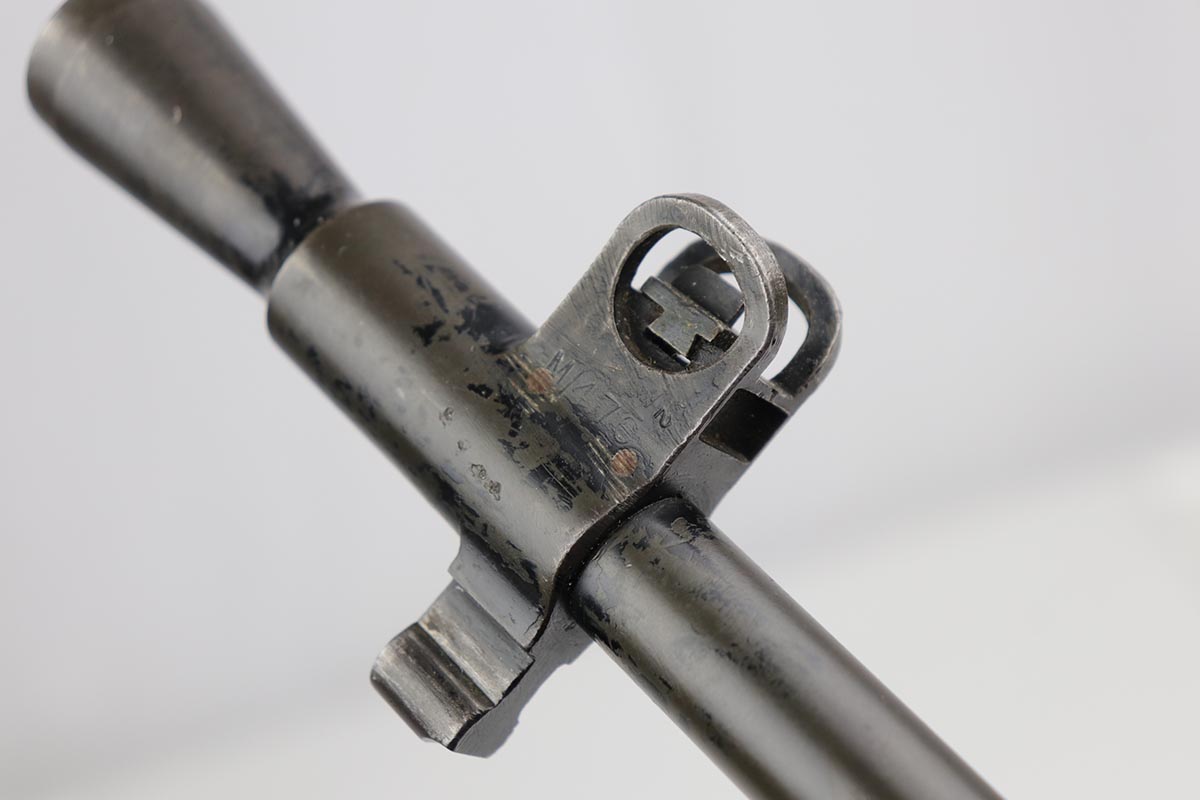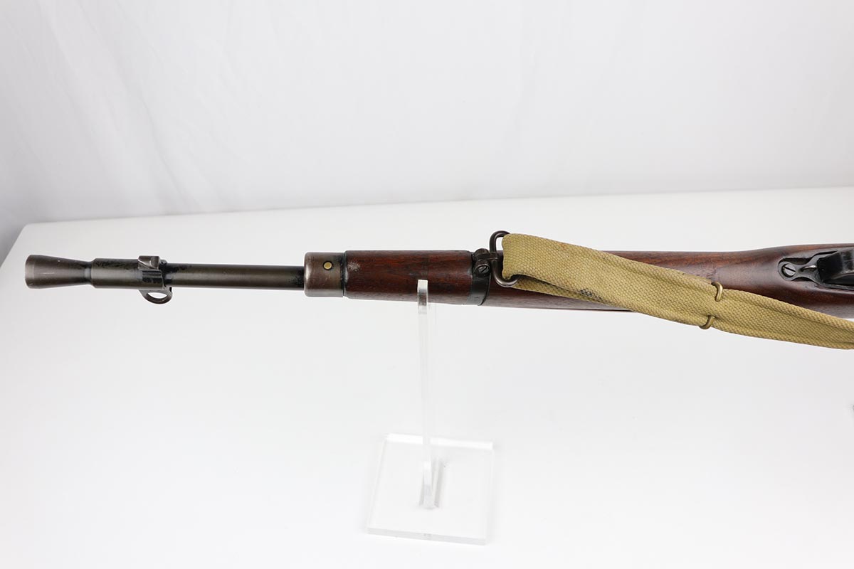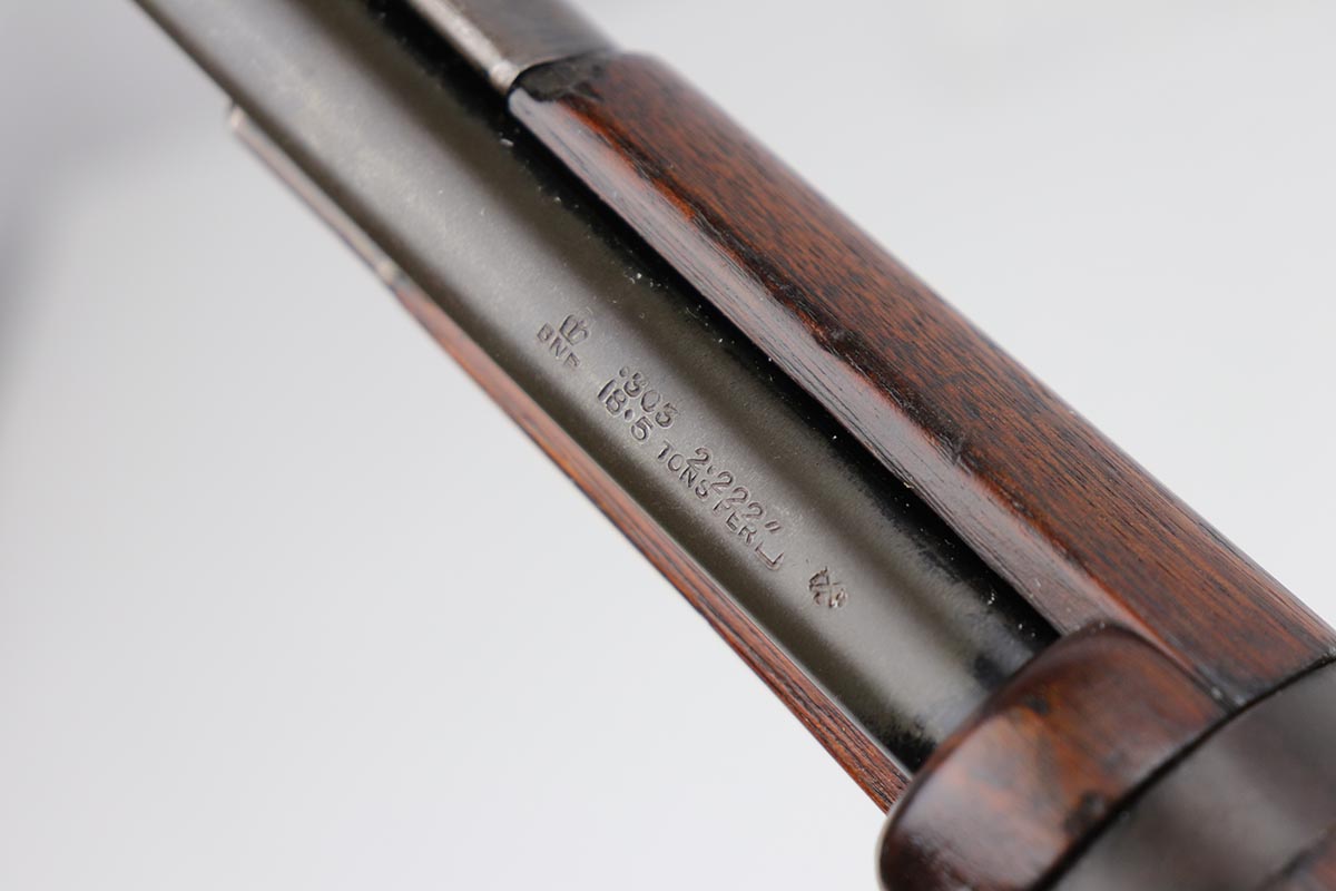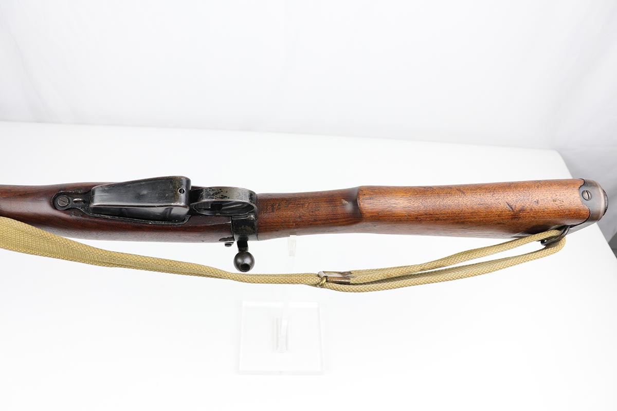 1/7/20 – The Lee-Enfield No.5 MkI gained its nickname, “Jungle Carbine,” from British troops who used the weapon in the Pacific Theater, but the name was never officially used by the military. The Jungle Carbine is a lighter, shorter variation of the No. 4 Mk I and was designed for use by British airborne forces. It is easily identifiable by the prominent flash hider that was designed to compensate for the increased flash that came with the shorter barrel. The rifle was only produced from 1944-1947 as it was ultimately seen as a flawed gun because it had a large recoil due to the short barrel and soldiers complained it had a “wandering zero.” Only about 250,000 of these rifles were produced. This particular Jungle Carbine was produced by BSA in 1945 and is in good condition with handling wear visible on most parts of the gun, but no major issues. Finish loss is prevalent on metal parts, especially the barrel. The wooden stock shows a number of scuffs and nicks, but no major chips or cracks. The bright, shiny bore is in excellent 9.5 out of 10 condition with very strong rifling and the mechanics are great. This makes it a great gun to take to the range. There is an export mark on the top of the barrel. The rifle is chambered for .303 British.