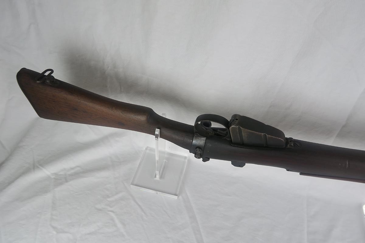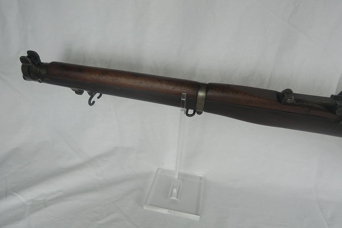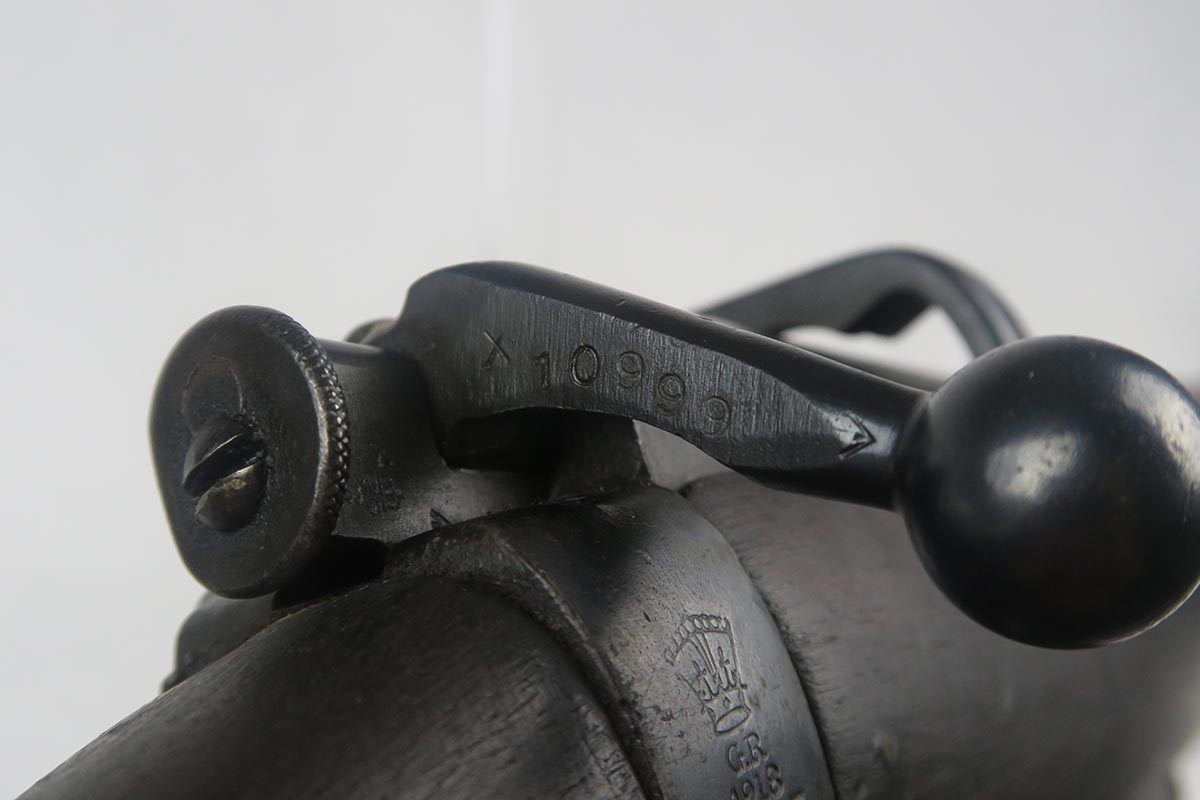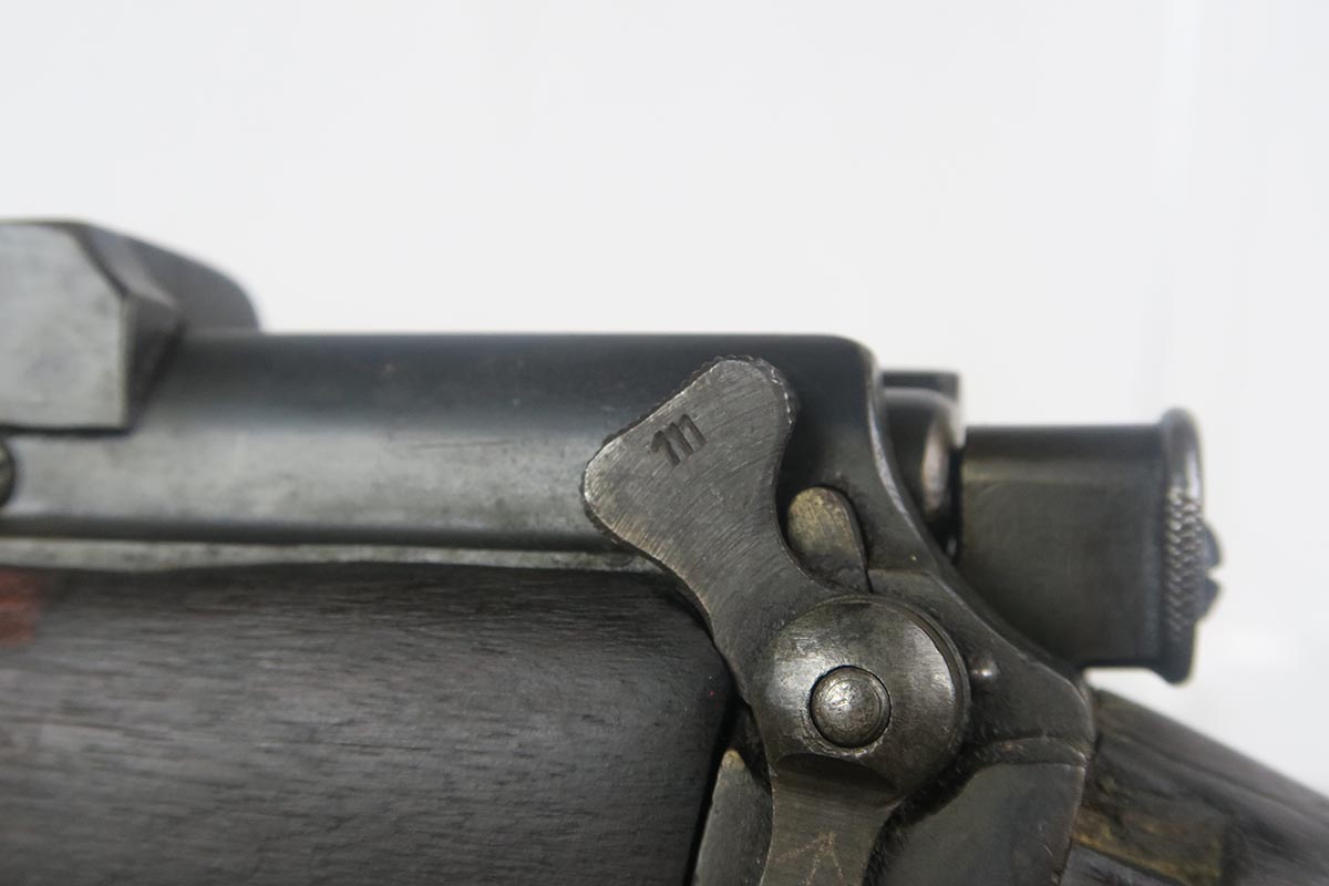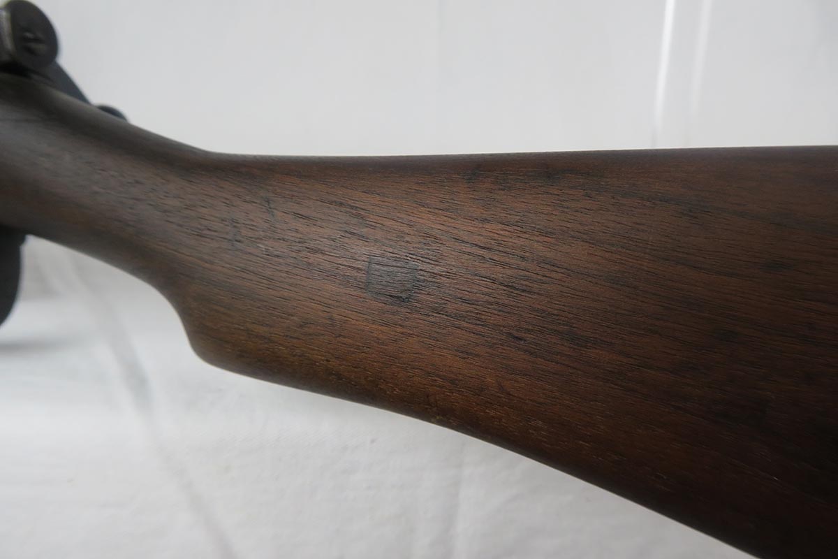 8/4/17 – This is a Lee-Enfield SMLE Mk.III*, manufactured in 1918. The iconic Lee-Enfield Rifle, the SMLE Mk.III, was first released at the start of 1907. It had several improved features that included a chamber adapted to fire .303 and newly designed handguards and magazines. During WWI, the rifle was found to be too complicated to manufacture at a rate that could meet demand, so the Mk.III* was introduced. It incorporated several changes, the most prominent of which were the deletion of the magazine cut-off mechanism and the long-range volley sights. The windage adjustment of the rear sight was also dispensed with, and the cocking piece was changed from a round knob to a serrated slab. This particular rifle is all original and matching. The wood has no major cracks or chips and the bore is excellent.