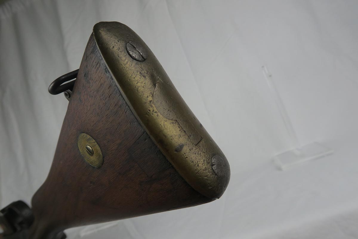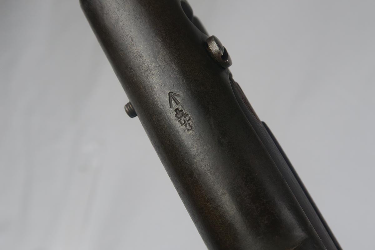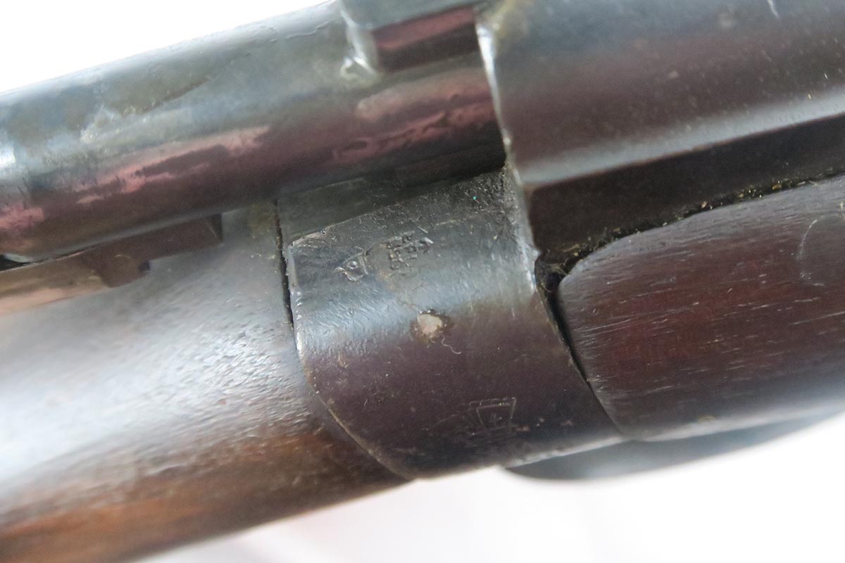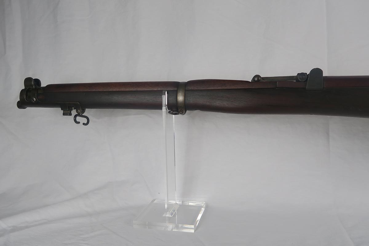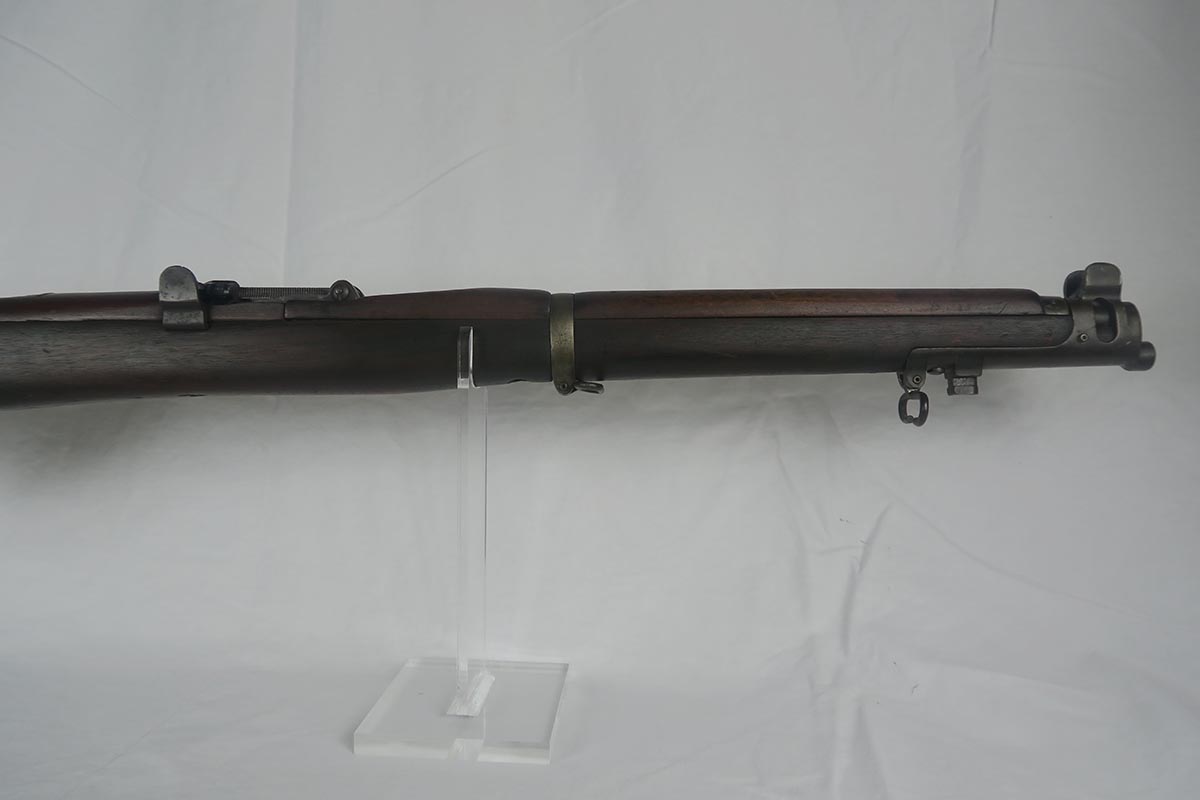 8/4/17 – This is a Lee-Enfield SMLE Mk.III*, manufactured in 1918. The iconic Lee-Enfield Rifle, the SMLE Mk.III, was first released at the start of 1907. It had several improved features that included a chamber adapted to fire .303 and newly designed handguards and magazines. During WWI, the rifle was found to be too complicated to manufacture at a rate that could meet demand, so the Mk.III* was introduced. It incorporated several changes, the most prominent of which were the deletion of the magazine cut-off mechanism and the long-range volley sights. The windage adjustment of the rear sight was also dispensed with, and the cocking piece was changed from a round knob to a serrated slab. This particular rifle is all original and matching. The wood has no major cracks or chips and the bore is excellent.