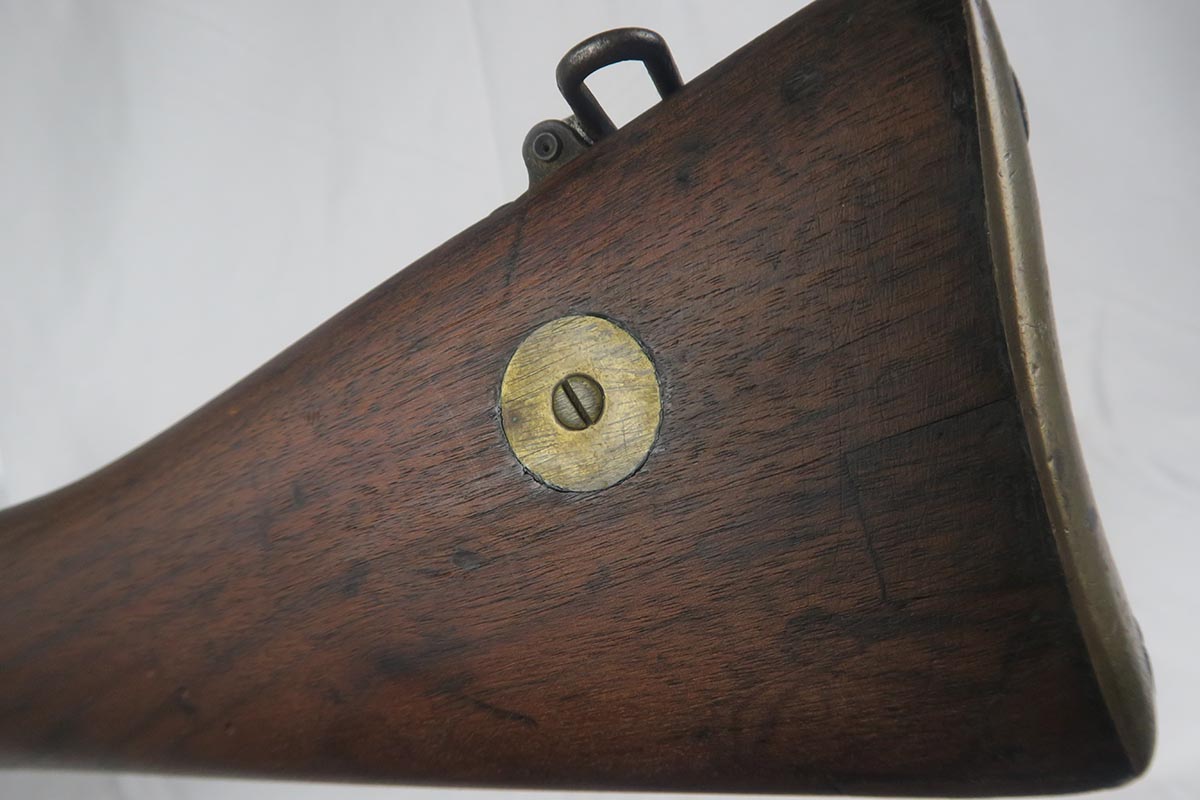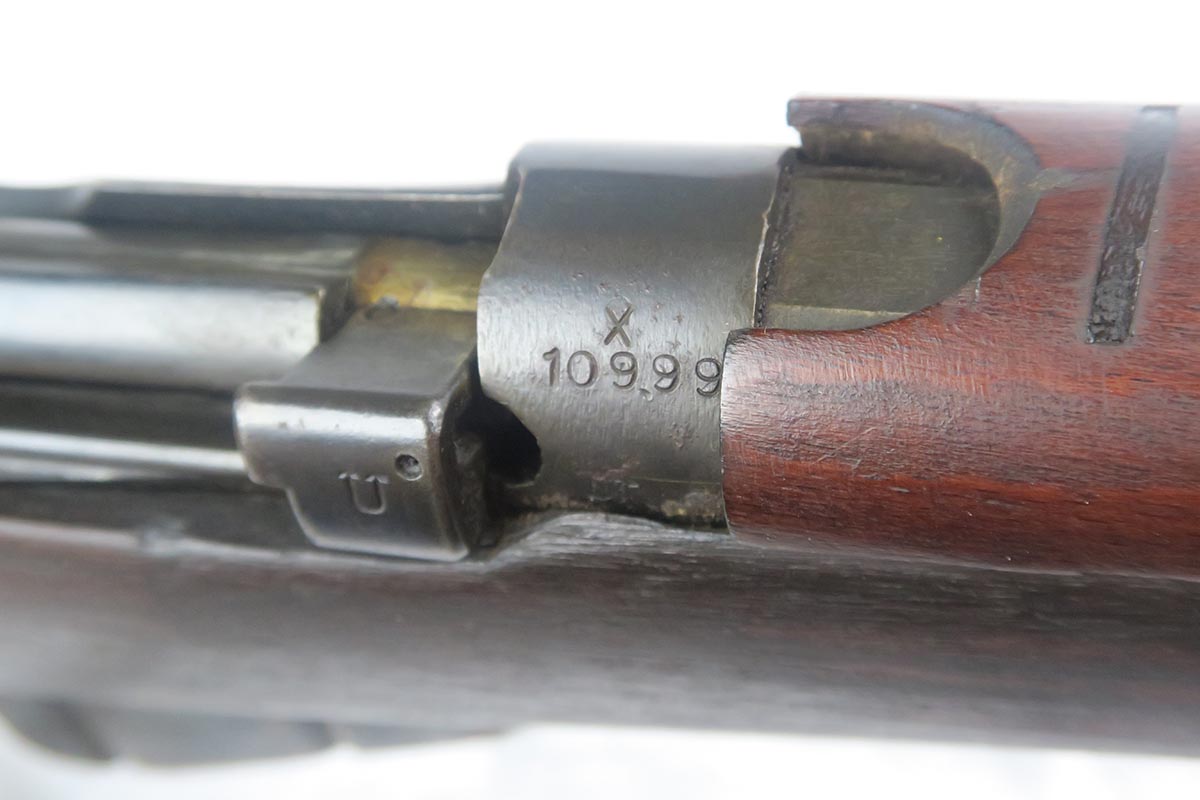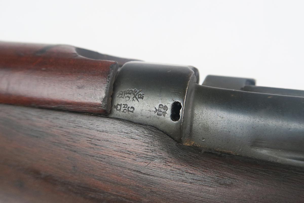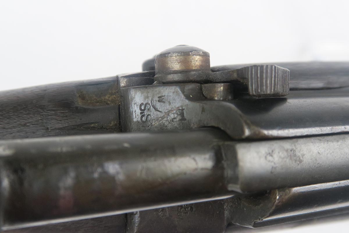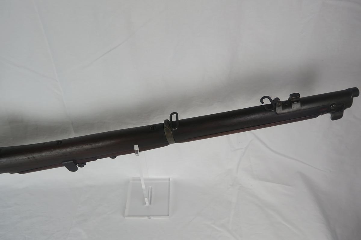 8/4/17 – This is a Lee-Enfield SMLE Mk.III*, manufactured in 1918. The iconic Lee-Enfield Rifle, the SMLE Mk.III, was first released at the start of 1907. It had several improved features that included a chamber adapted to fire .303 and newly designed handguards and magazines. During WWI, the rifle was found to be too complicated to manufacture at a rate that could meet demand, so the Mk.III* was introduced. It incorporated several changes, the most prominent of which were the deletion of the magazine cut-off mechanism and the long-range volley sights. The windage adjustment of the rear sight was also dispensed with, and the cocking piece was changed from a round knob to a serrated slab. This particular rifle is all original and matching. The wood has no major cracks or chips and the bore is excellent.