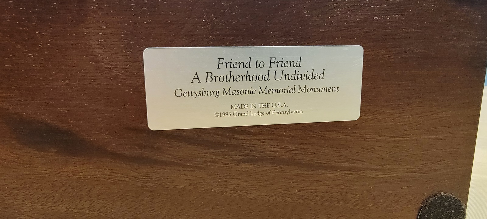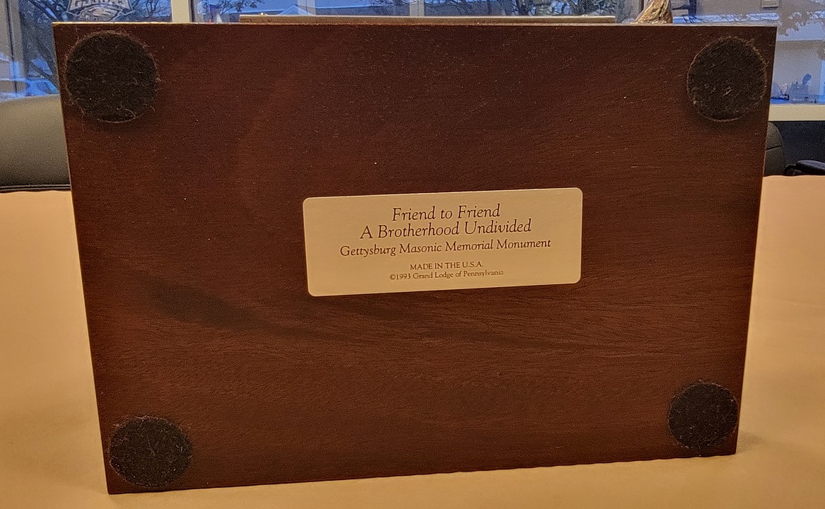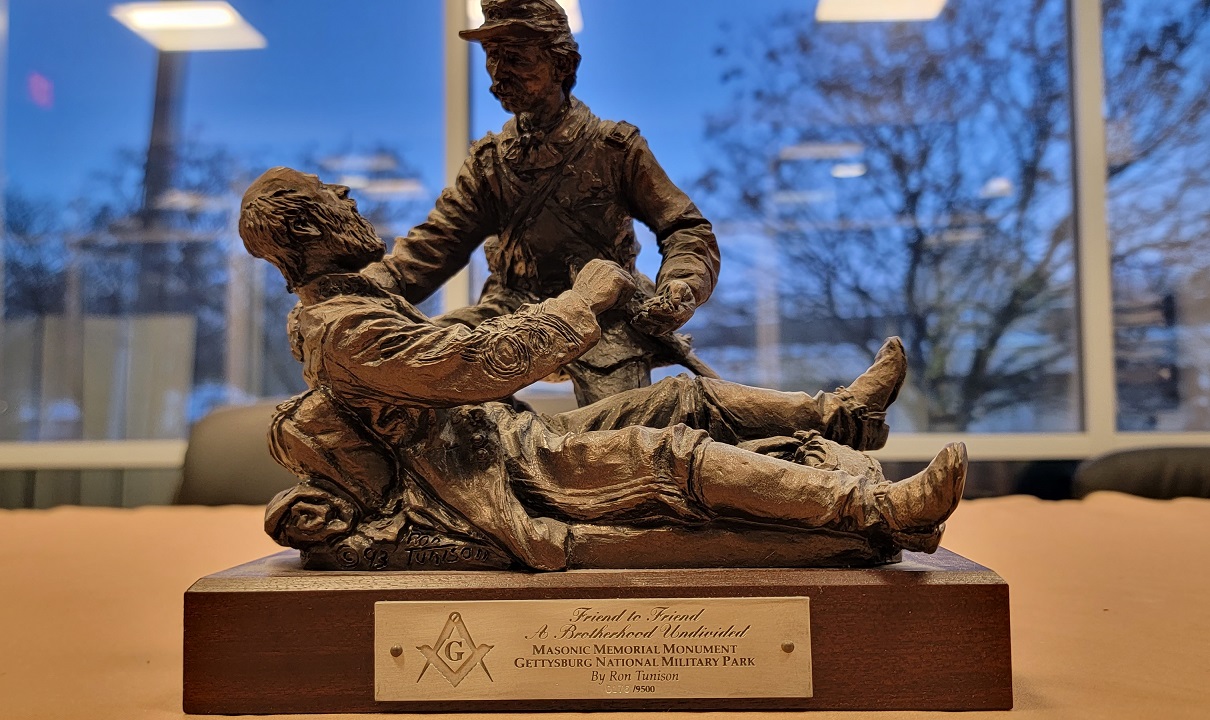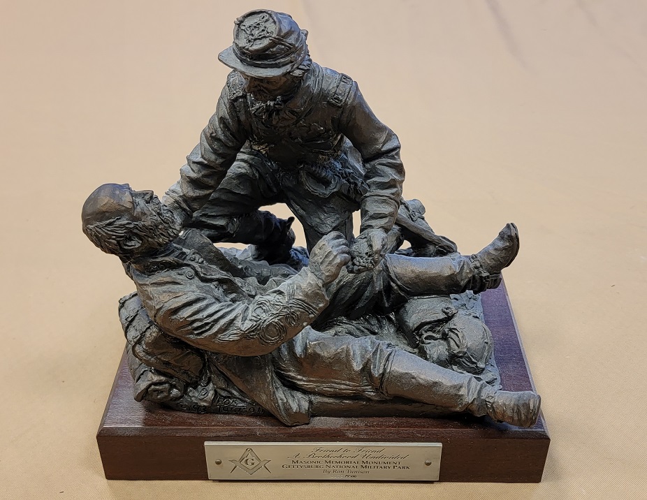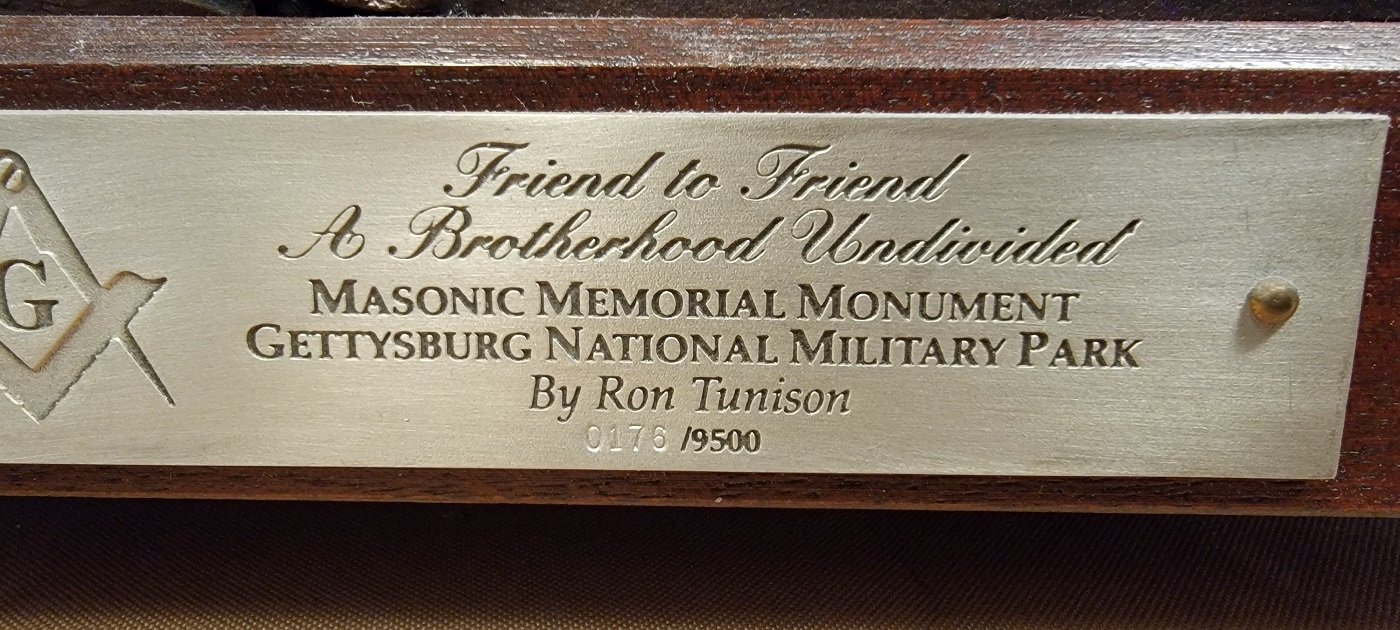 11/29/23 – This is a limited edition Civil War Gettysburg Masonic sculpture titled, “Friend to Friend; A Brotherhood Undivided” by the renowned military sculptor Ron Tunison. This sculpture is made of bronzed porcelain and is individually numbered 0176 of 9500. The sculpture is in excellent condition and measures 8.75 x 6 inches at the base. Height is approximately 8.5 inches. Marked with a front name plate and a sticker on the underside which shows the copyright date of 1993. A great display and collectible statue.