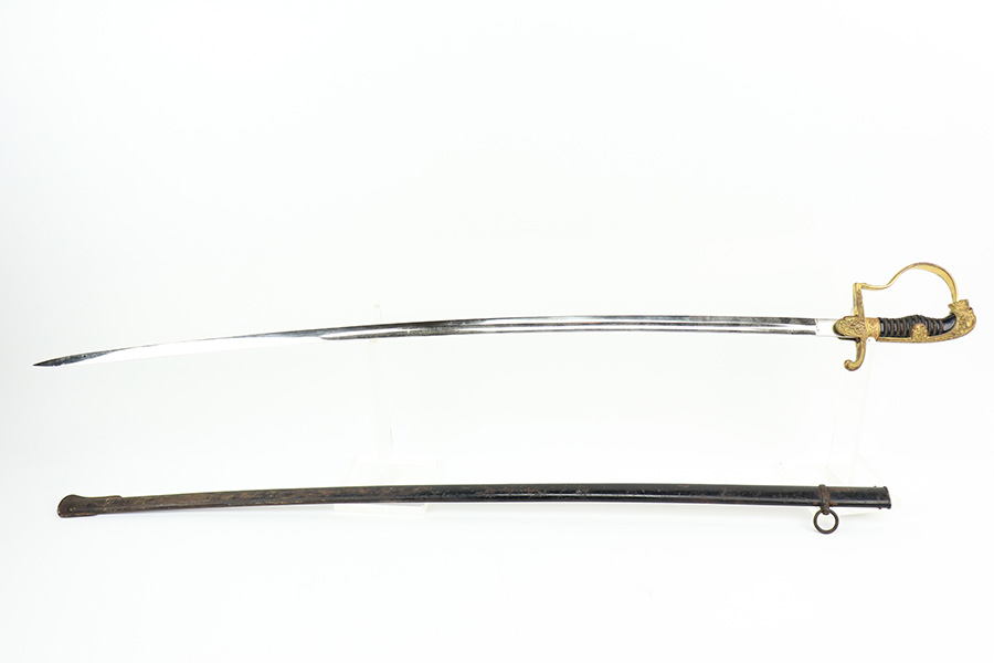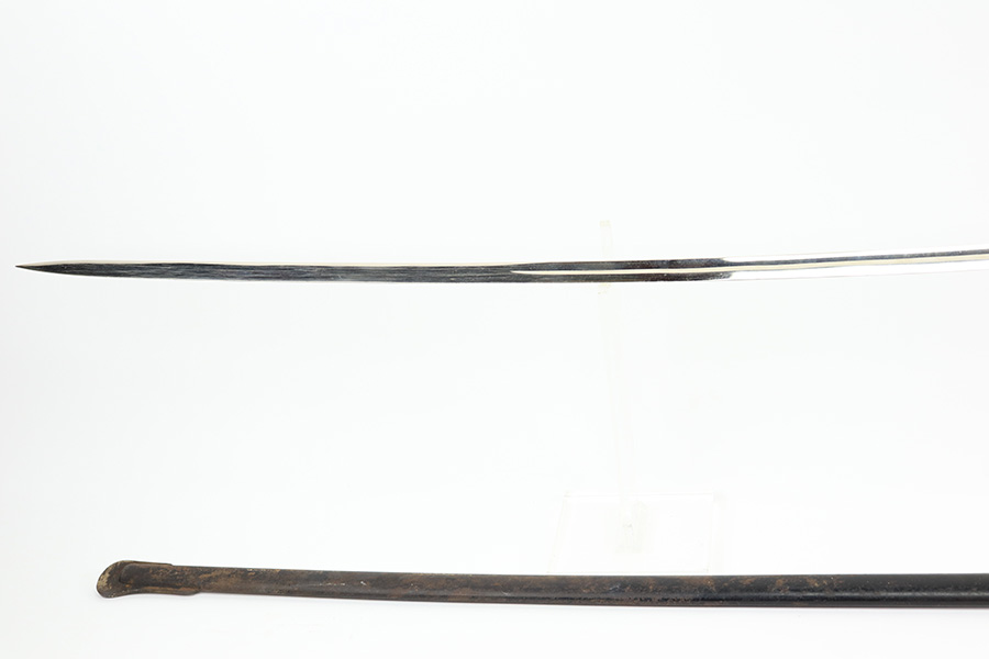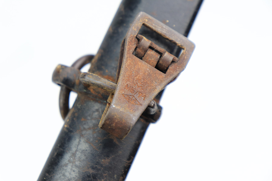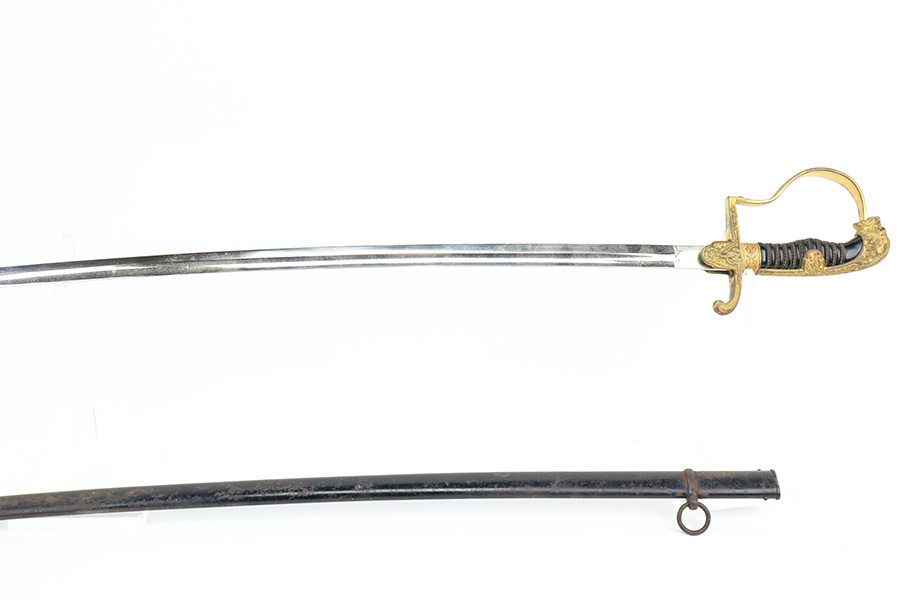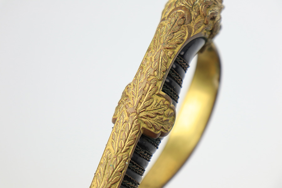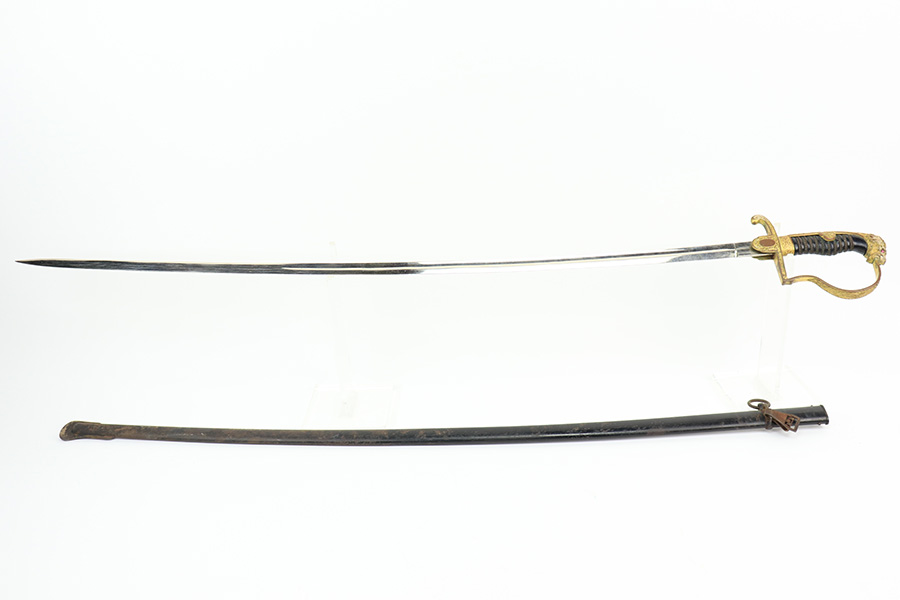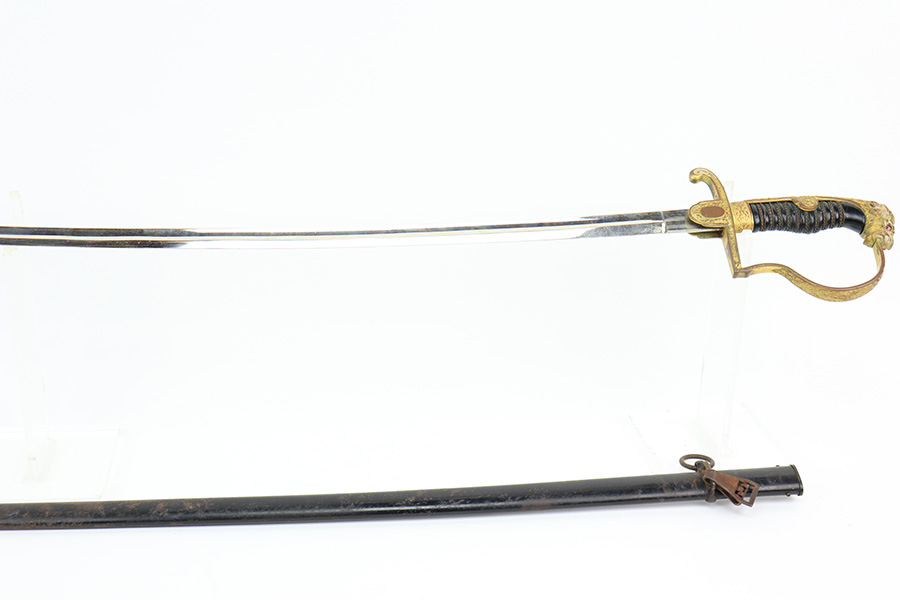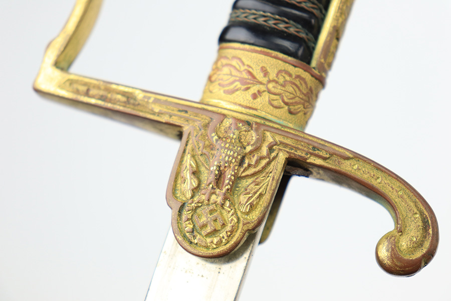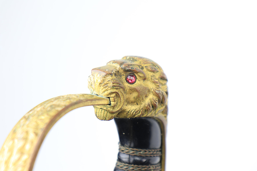 4/15/22 – This is an original WW2 German Lion’s Head Officer’s Sword. The sword blade is in great condition with no rust, pitting, or sharpening. There’s some light surface oxidation throughout, but this is normal aging wear. No maker markings or stamps on the blade. The hand guard and pommel have a fair amount of gold finish loss, and there’s surface patina / edge wear throughout. There is some light brown residue on the Lion’s head, but this can be removed if desired. The lion’s head has ruby eyes intact. Comes with an original scabbard. The scabbard has surface rust and finish loss throughout, but no dents or major issues.