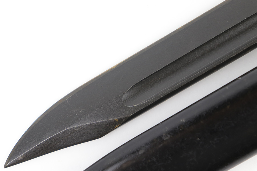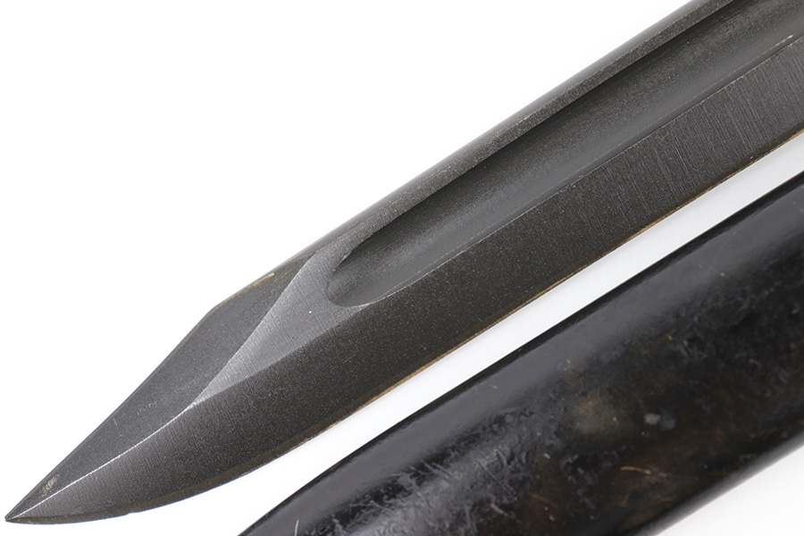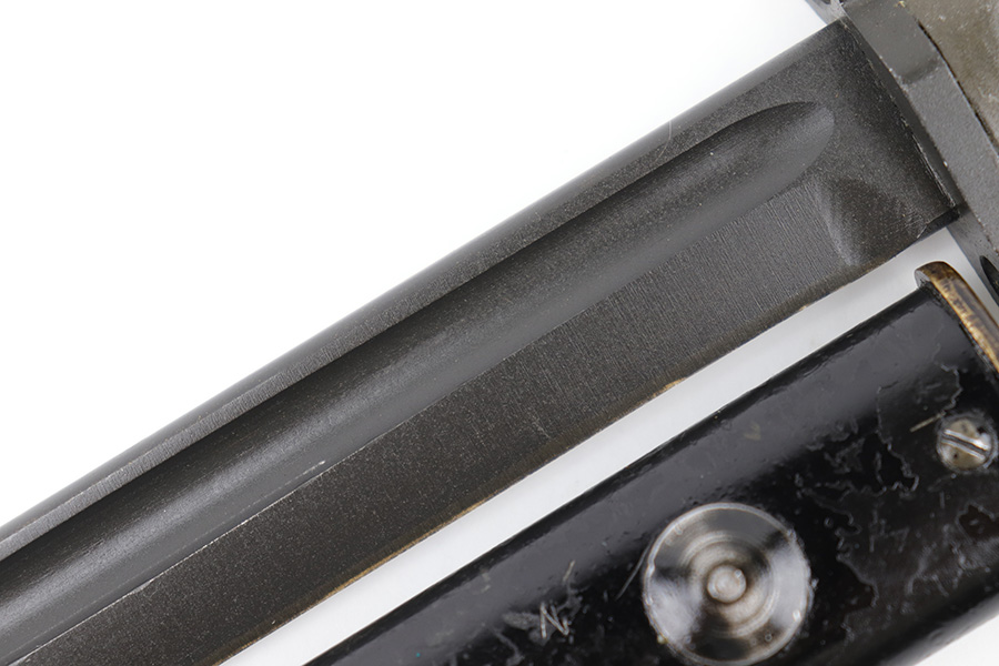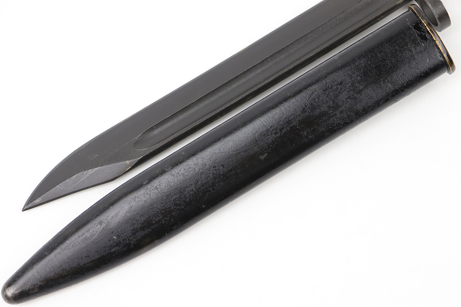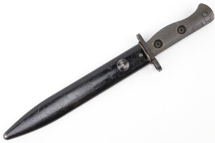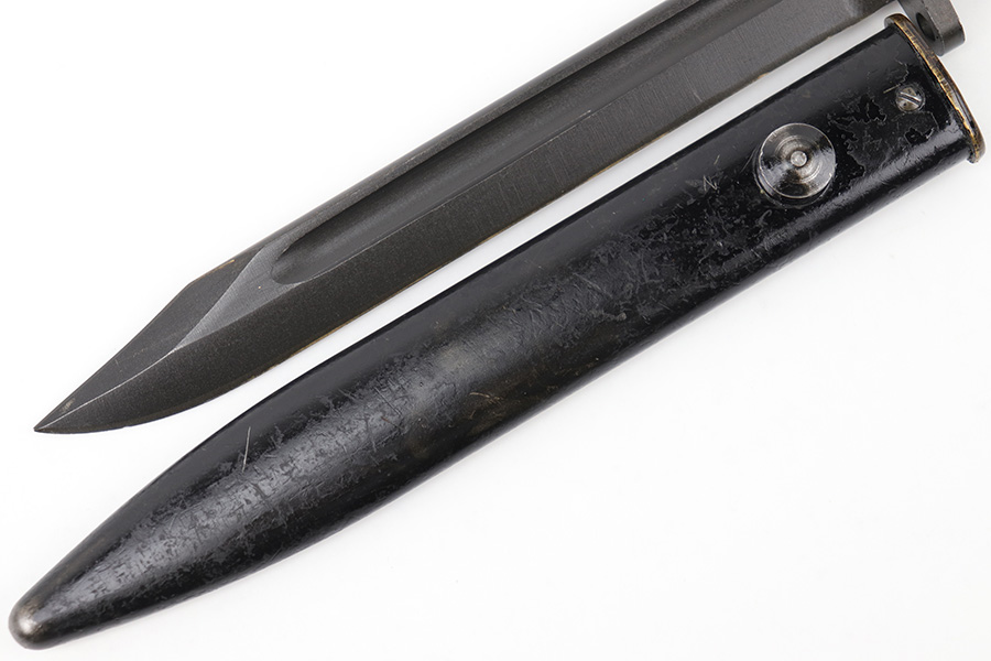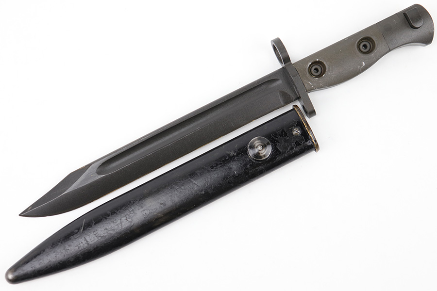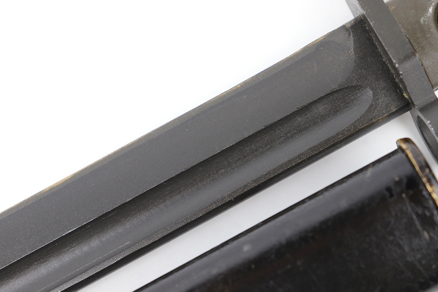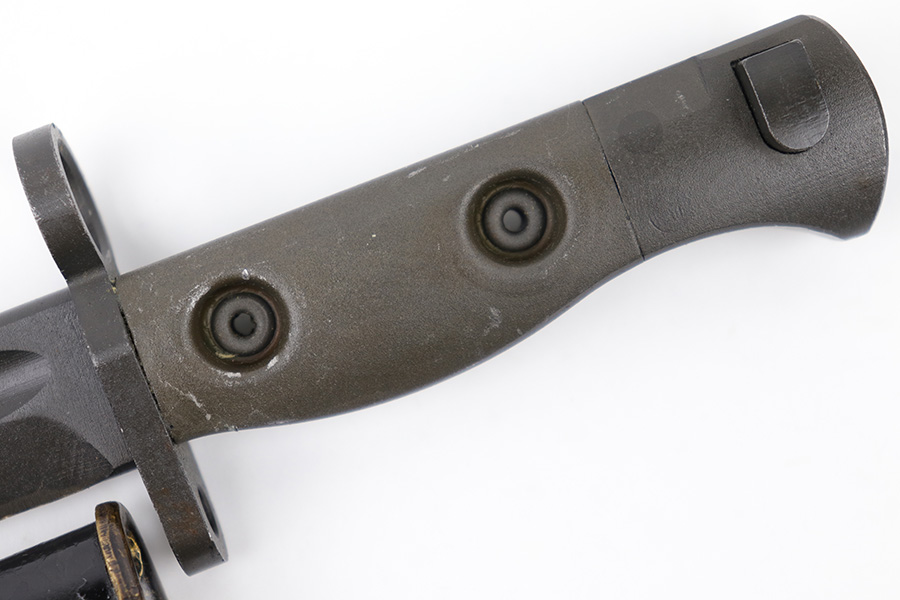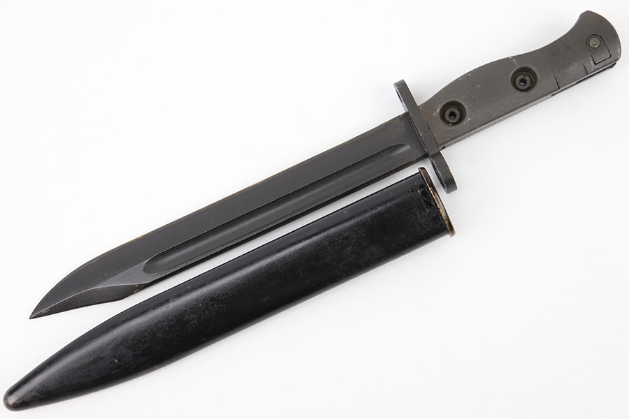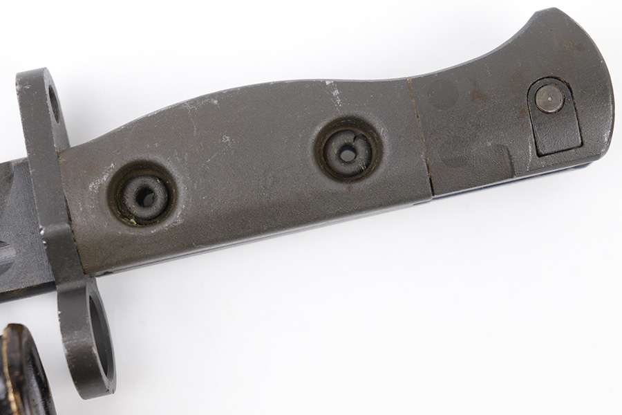 4/6/23 – This is a 1950s production Australian Army Lithgow L1A2 bayonet. Used with the L1A1 SLR, FN FAL, or F1 submachine gun. The blade is in minty condition with a parkerized finish, and measures about 8″ long. The hilt and handle is all metal and parkerized as well with minimal surface wear. Excellent overall condition. Overall length is just under 12″, not including the scabbard. The scabbard has a black painted finish and shows some mild surface wear but no major issues nor any dents.