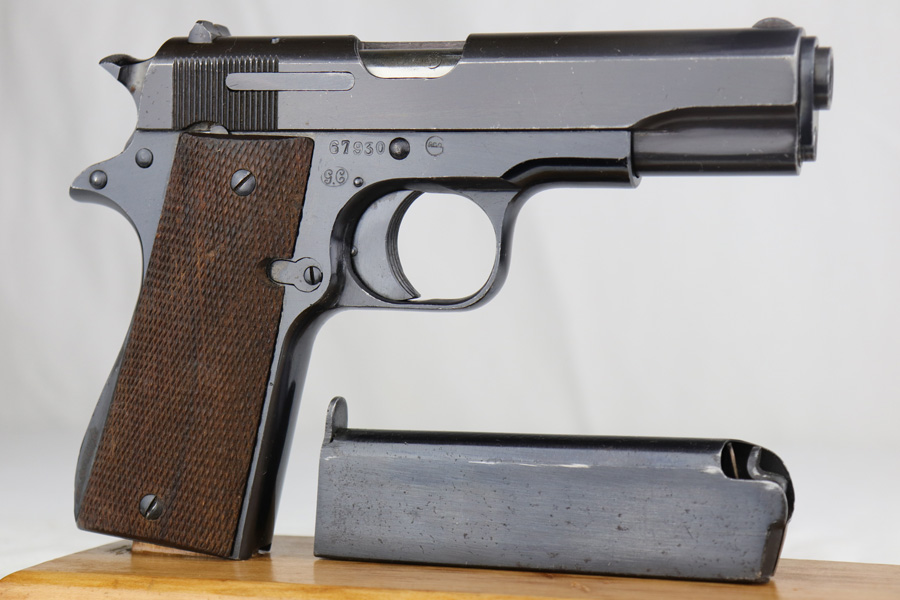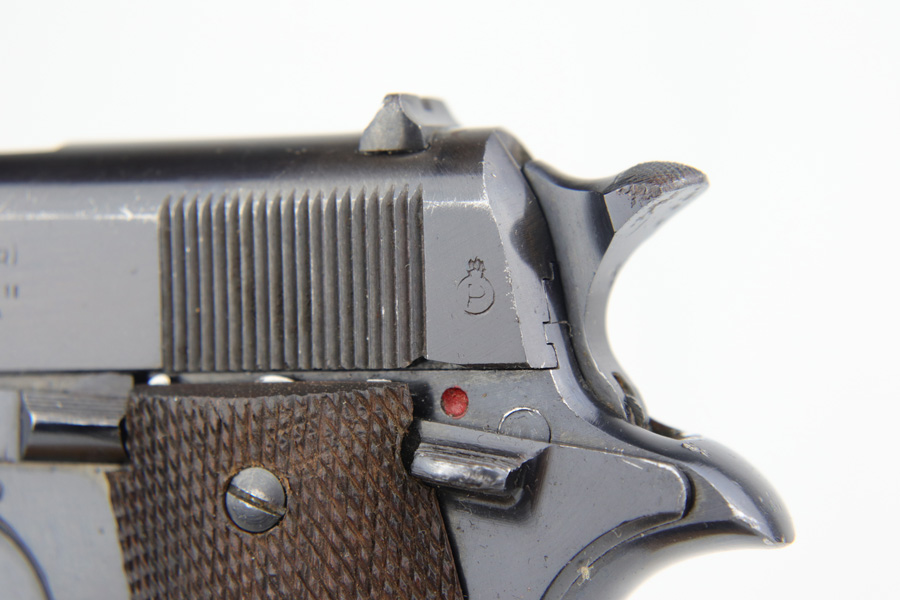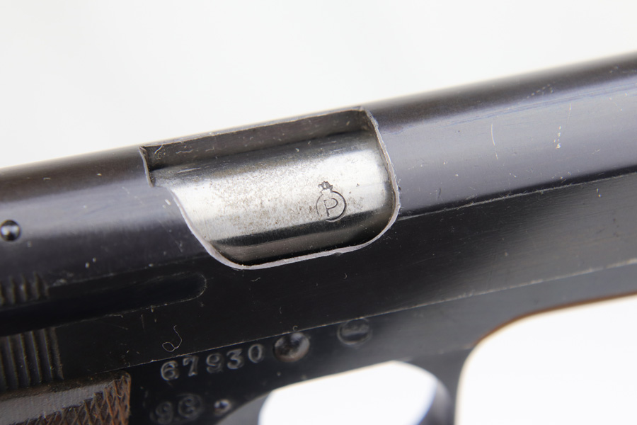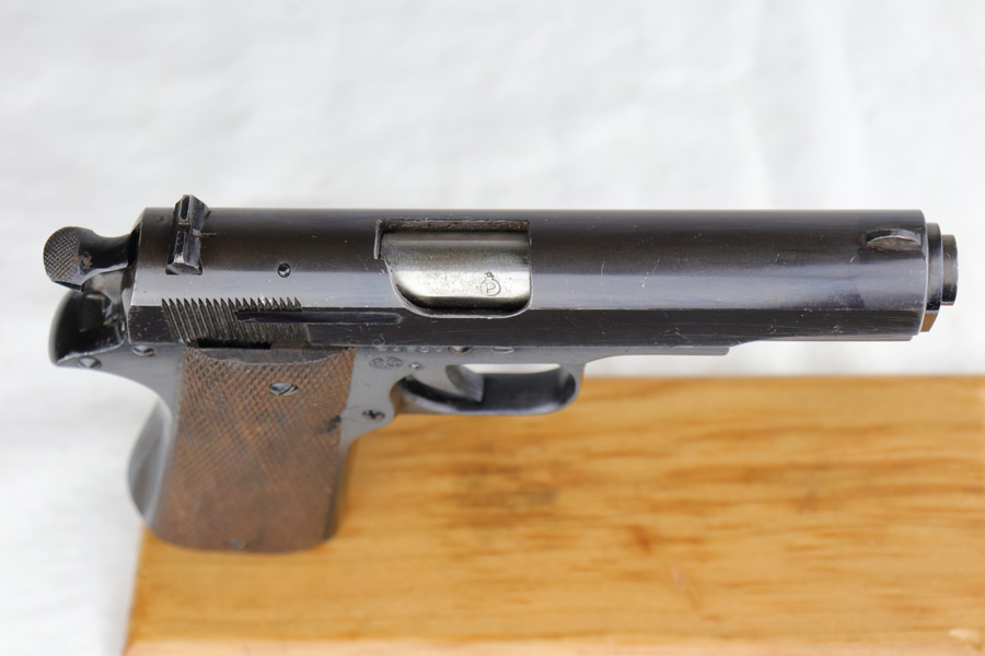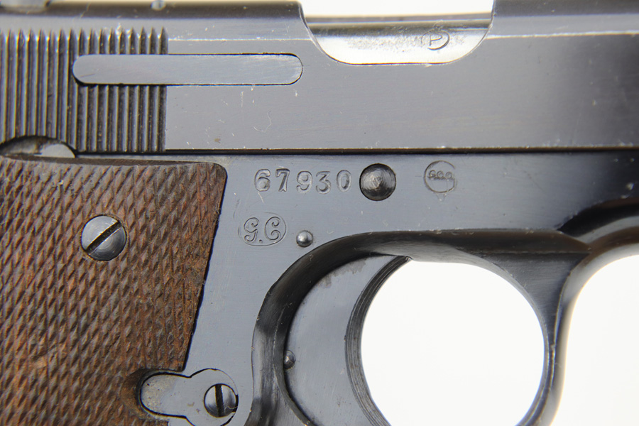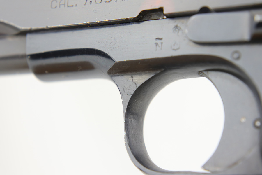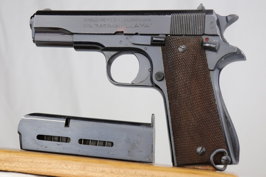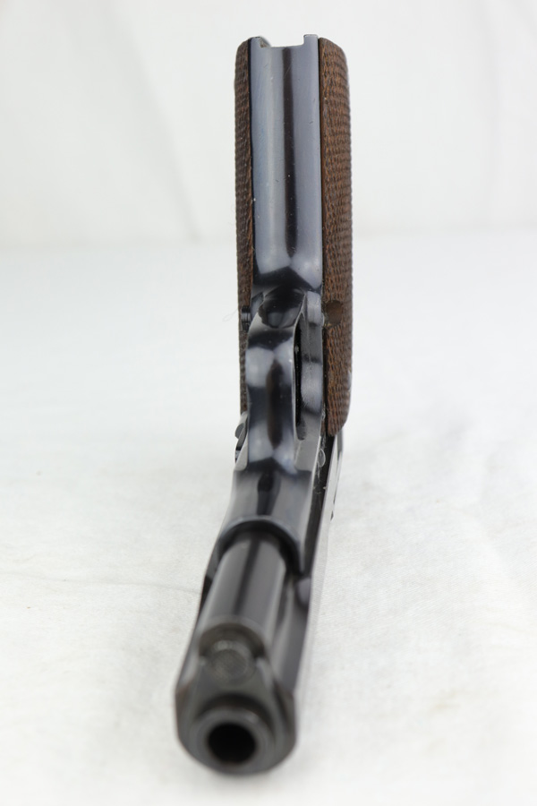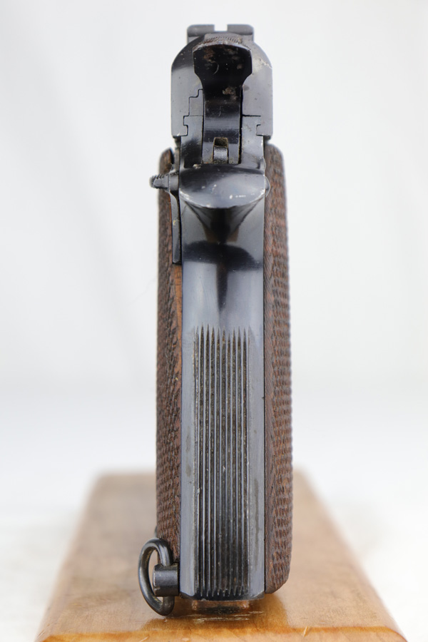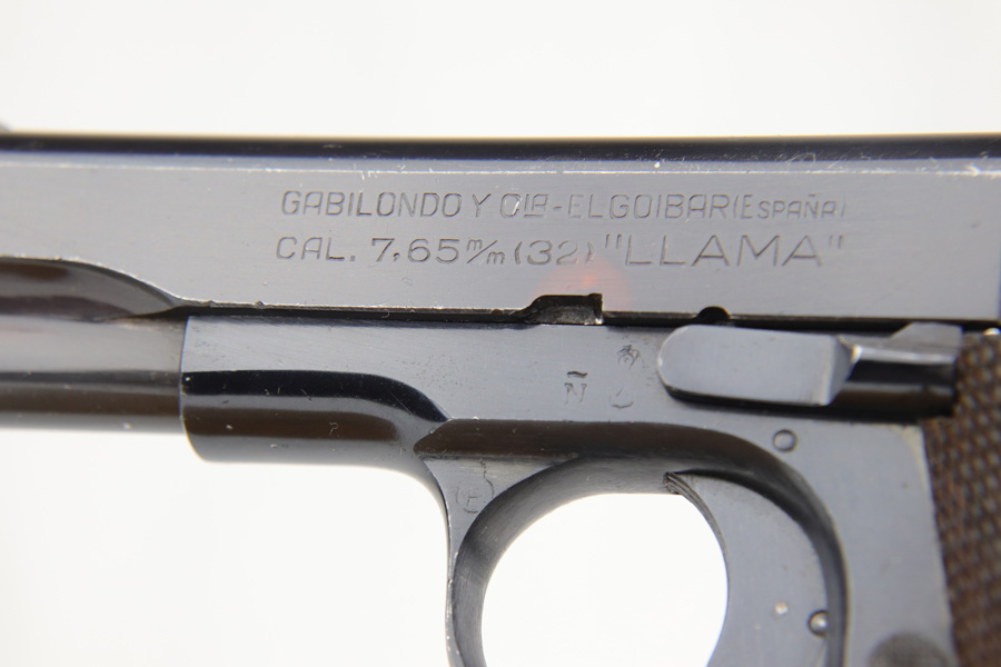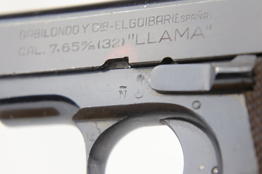 1/8/19 – This is an original Spanish Llama pistol made in the early 1940s and was later exported into Germany by Geco in 1943. This is shown from the “Geco” import stamp on the right side of the frame next to the serial number, and the “N” proof stamp on the left side of the frame. Research tells us that the “N” import proof was used by the Germans in 1943. Since this was during WW2, any pistols imported into Germany would only be meant for nazi party members, as they were they only citizens authorized to have guns. We suspect it was a rich officer who would have gone through the trouble to have such an item as this. The pistol is in excellent condition overall with only a hint of edge wear and some minor surface scratches on the slide. Strong frame and straps leave the overall condition around 97-98%. The bore has some light edge wear in the grooves, leaving the bore as a 9/10. Excellent original brown wood grips and one original magazine included. Guaranteed original.