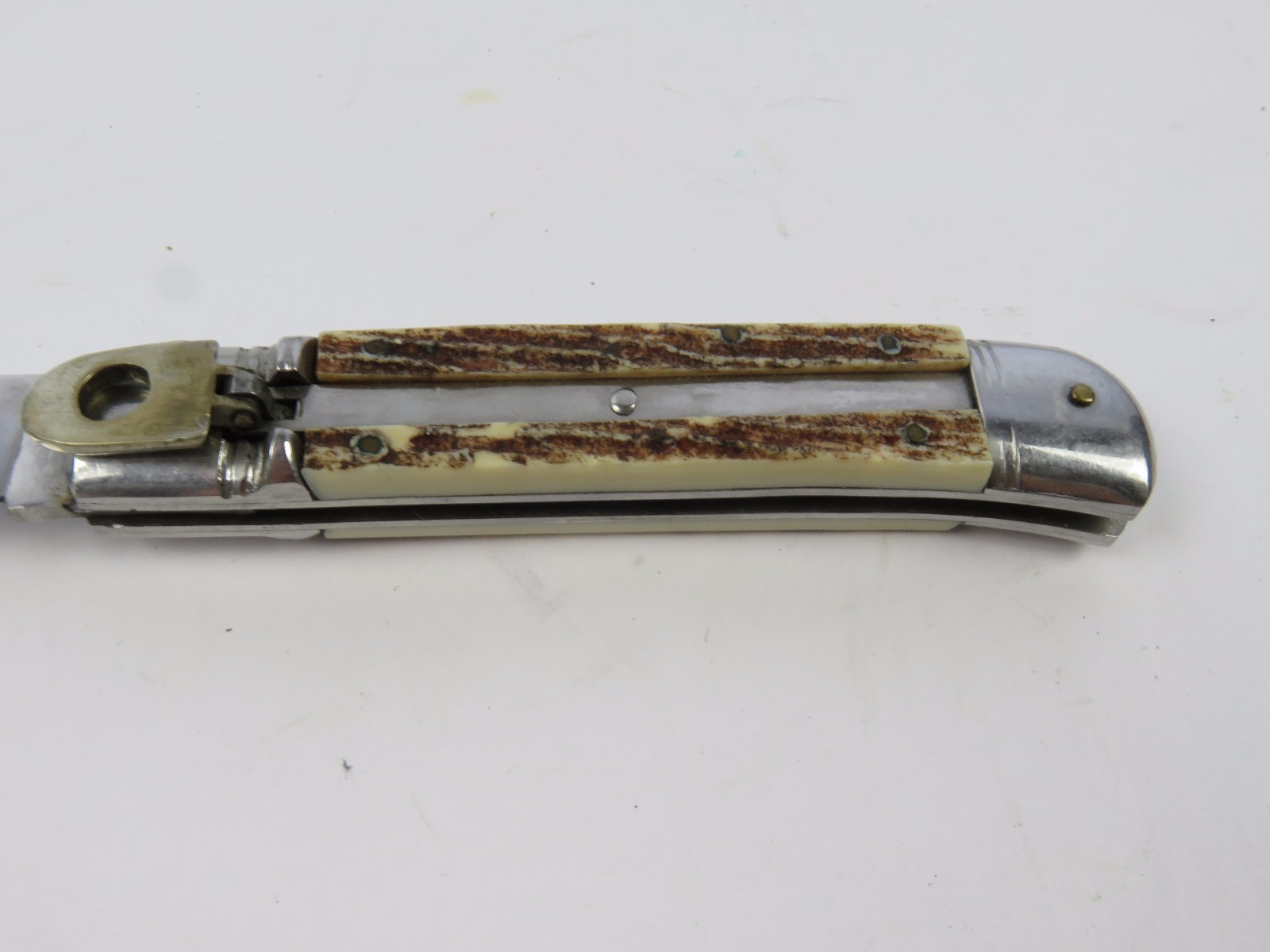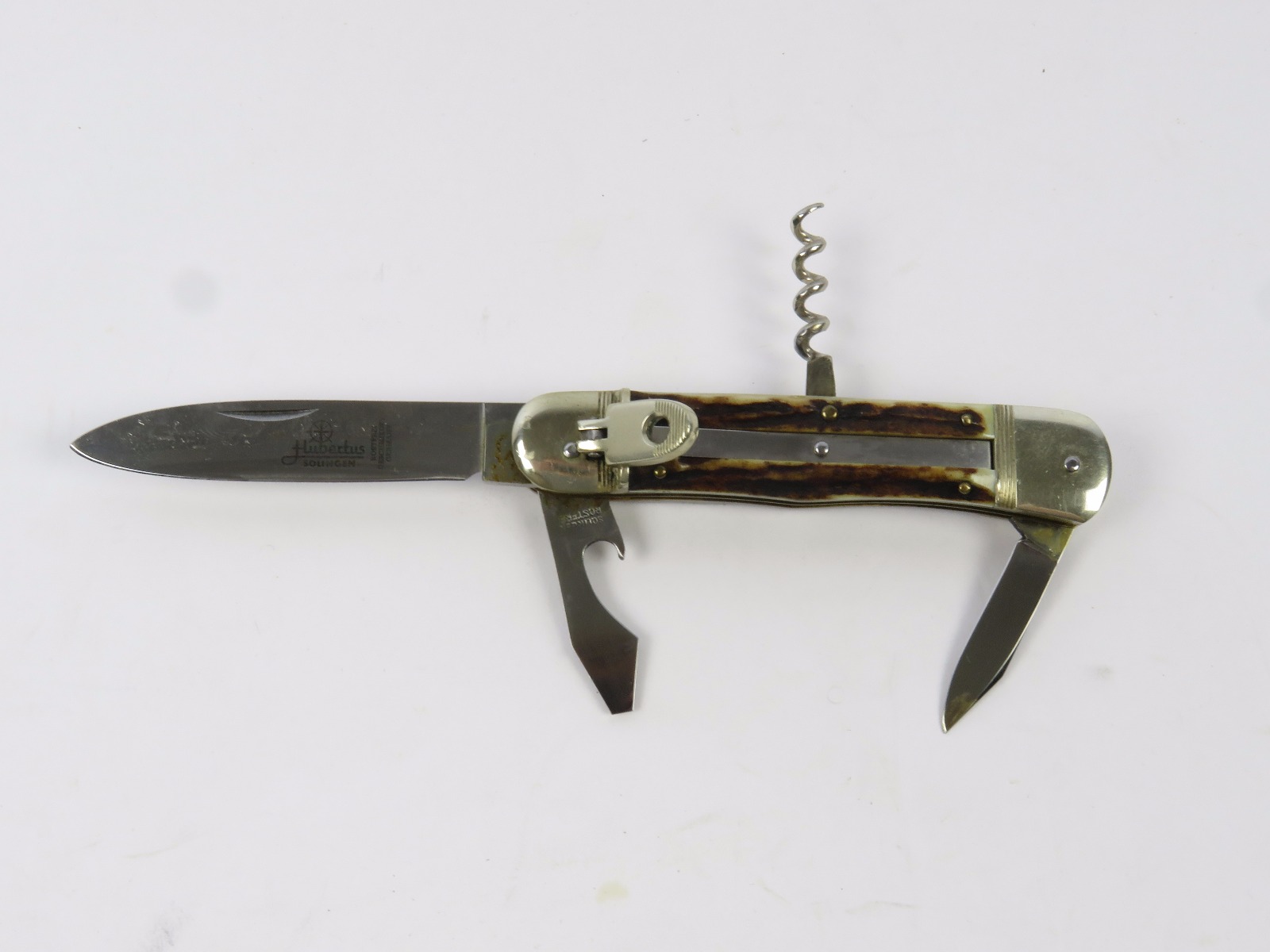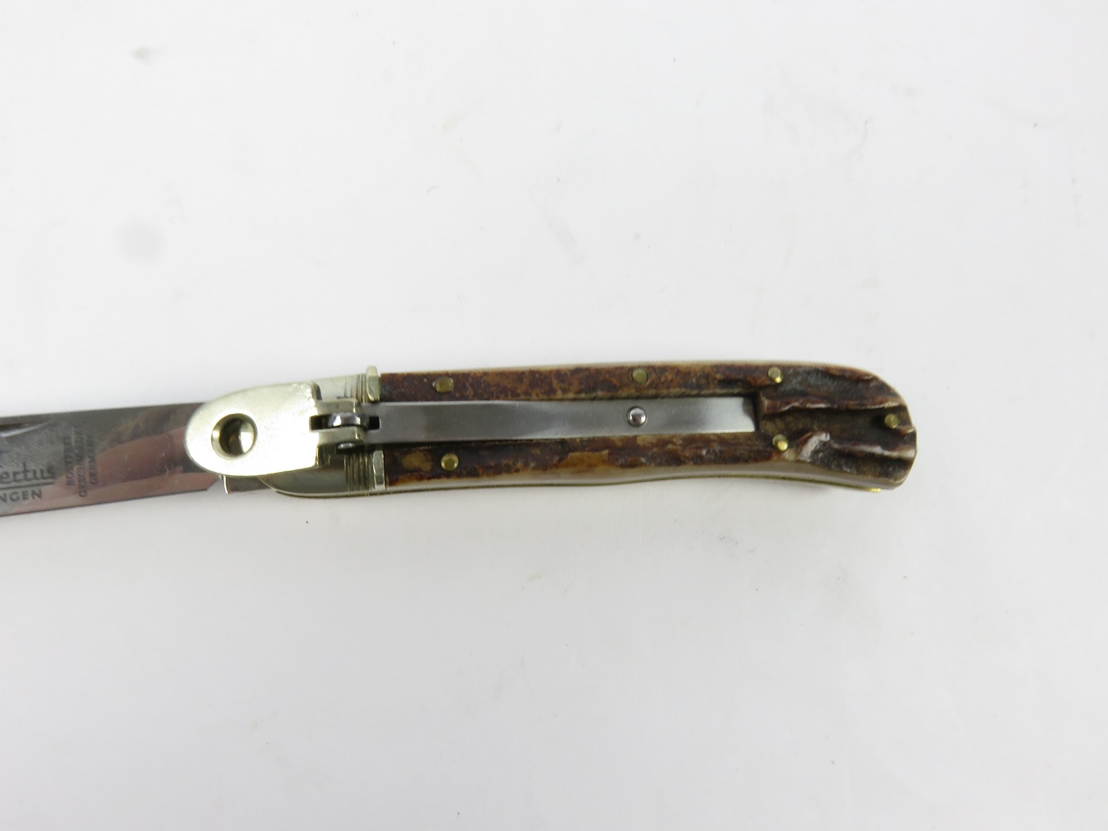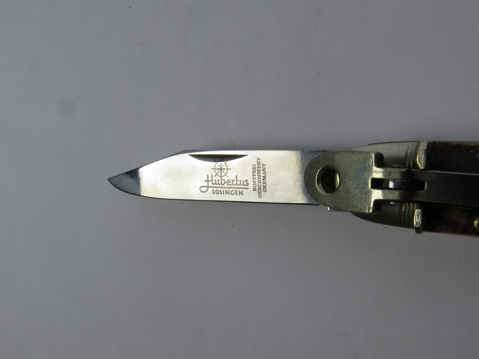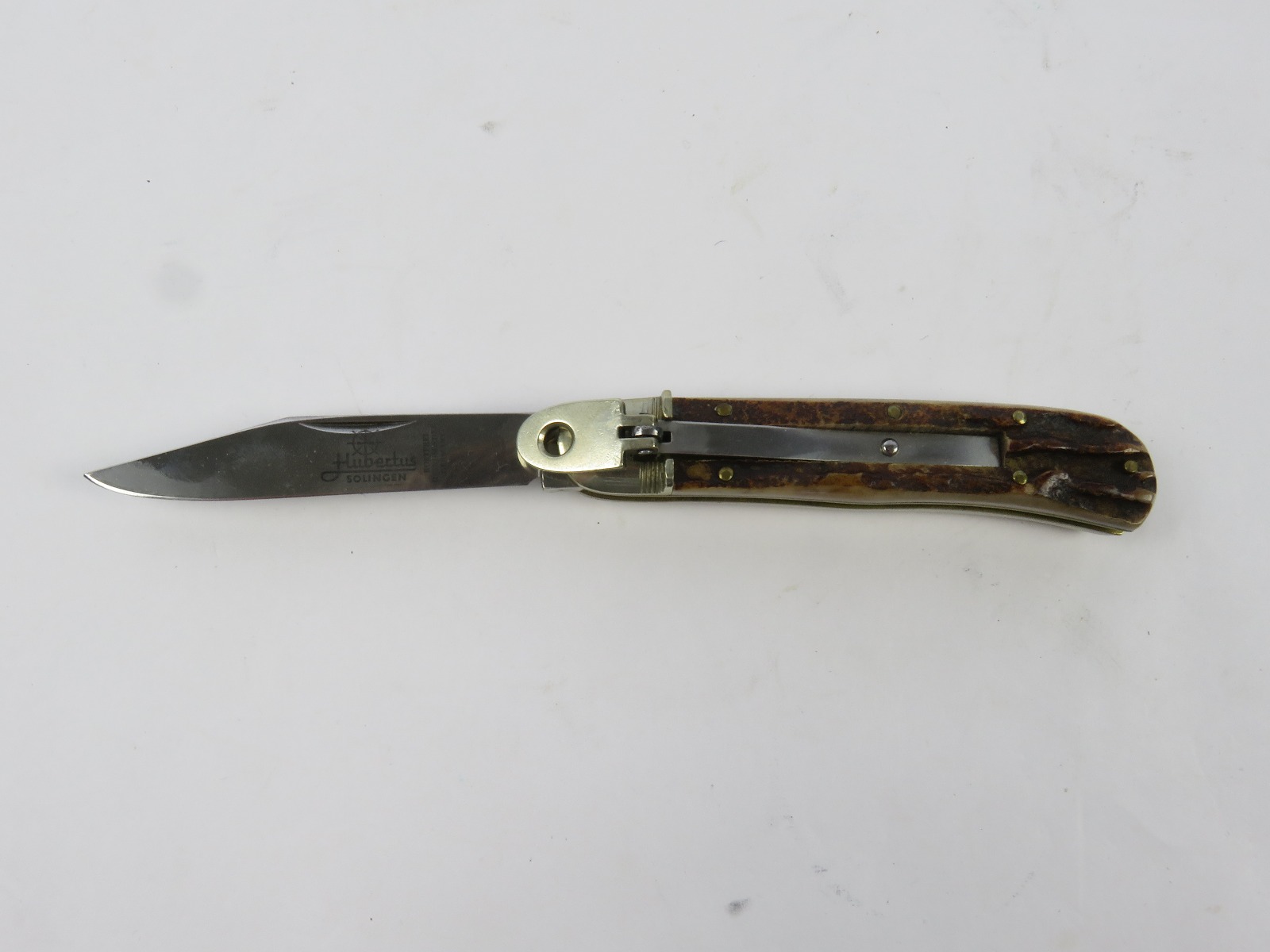 6/29/17 – This is a set of 3 original 1950s production German Hubertus switchblade knives. Each blade has a folding lever that can be flipped and pressed down to spring open the blade. There’s a spring bar on the side of each handle. The three blades are all slightly different styles, one is more of a utility blade with multiple functions, while the other two are blade-only. The action on each is quick and smooth. The utility blade ahs a very nice blade maker marking and is excellent with a “stag” style handle. The blade is 3 inches long. The middle blade photoed has an unmarked blade, but a “Rostfrei” stamp near the base of the blade/pivot area. This blade is also 3 inches long. The smallest blade, and lowest in the grouping shots, is another stag handle with a clean blade and maker marking. The action gets caught up slightly, but can easily be oiled with WD40 for a smoother action (if desired). The handle is stag style on this one as well. All are guaranteed original.