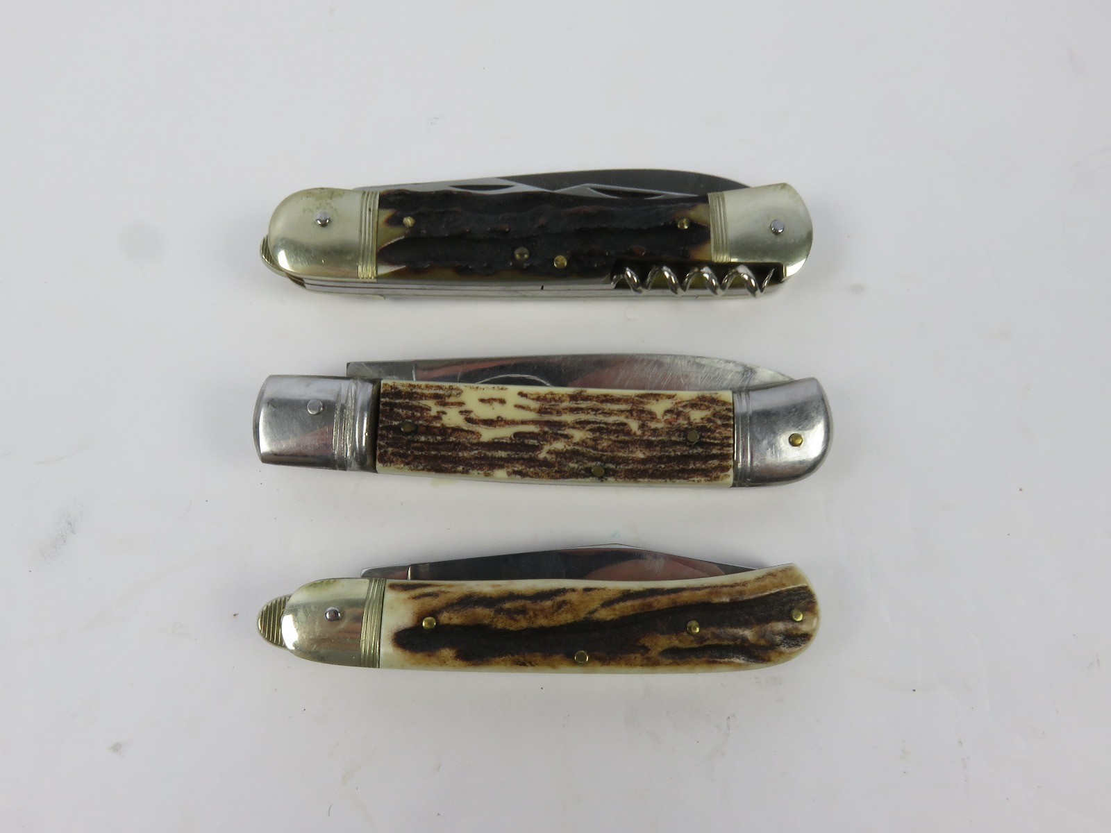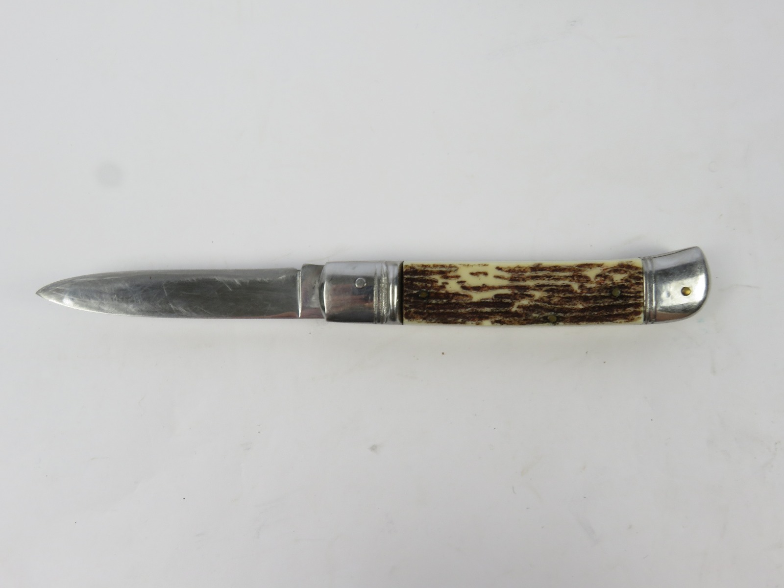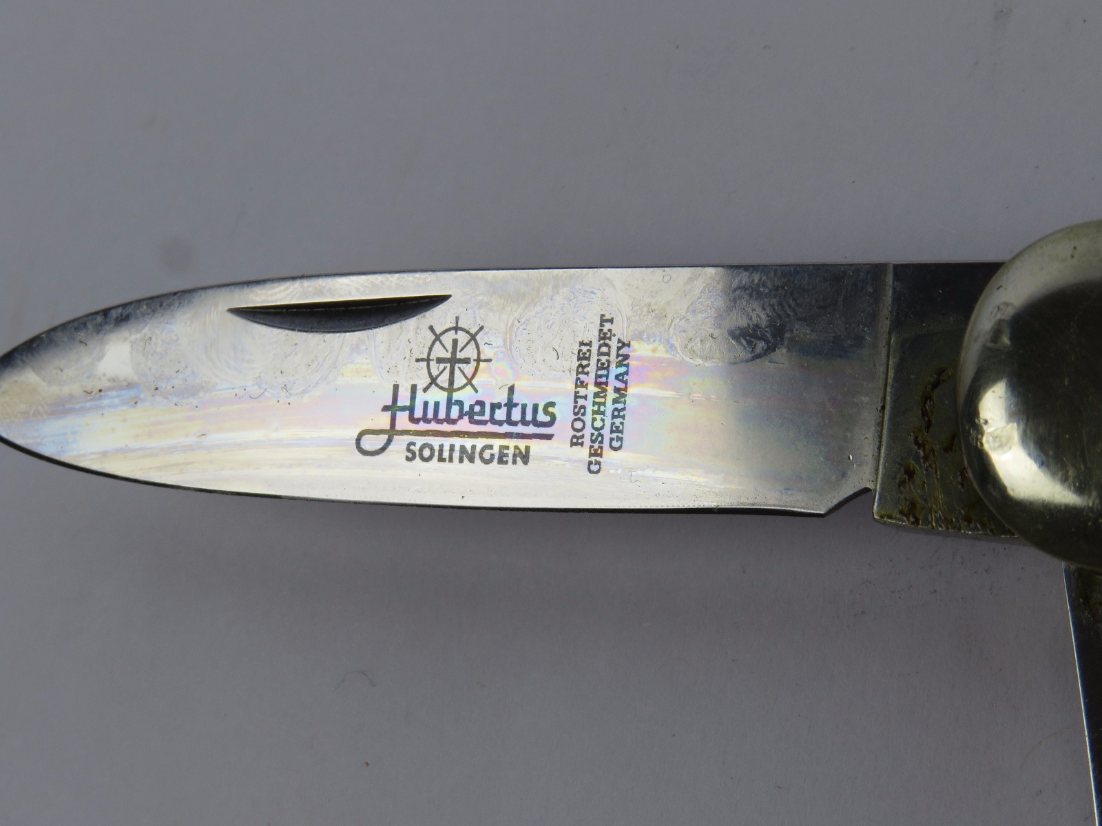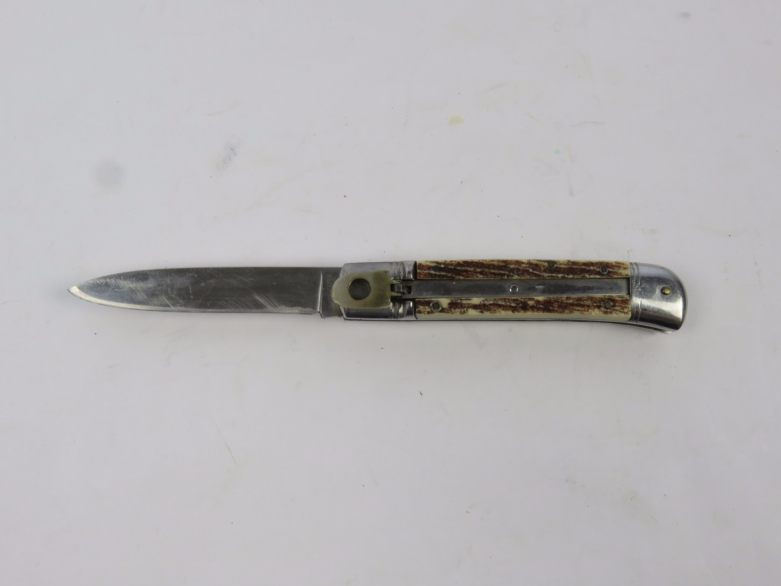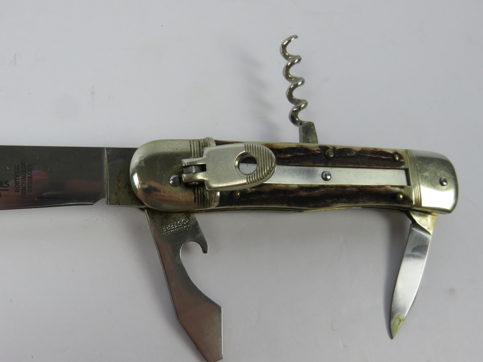 6/29/17 – This is a set of 3 original 1950s production German Hubertus switchblade knives. Each blade has a folding lever that can be flipped and pressed down to spring open the blade. There’s a spring bar on the side of each handle. The three blades are all slightly different styles, one is more of a utility blade with multiple functions, while the other two are blade-only. The action on each is quick and smooth. The utility blade ahs a very nice blade maker marking and is excellent with a “stag” style handle. The blade is 3 inches long. The middle blade photoed has an unmarked blade, but a “Rostfrei” stamp near the base of the blade/pivot area. This blade is also 3 inches long. The smallest blade, and lowest in the grouping shots, is another stag handle with a clean blade and maker marking. The action gets caught up slightly, but can easily be oiled with WD40 for a smoother action (if desired). The handle is stag style on this one as well. All are guaranteed original.