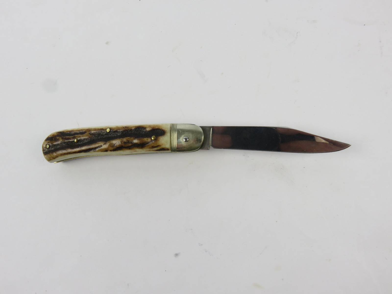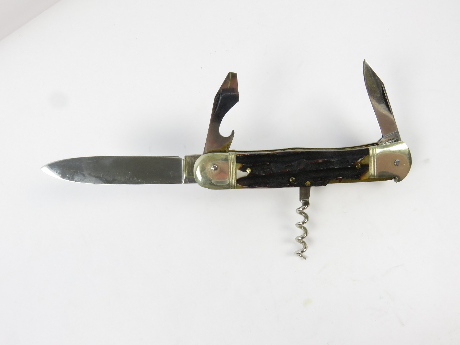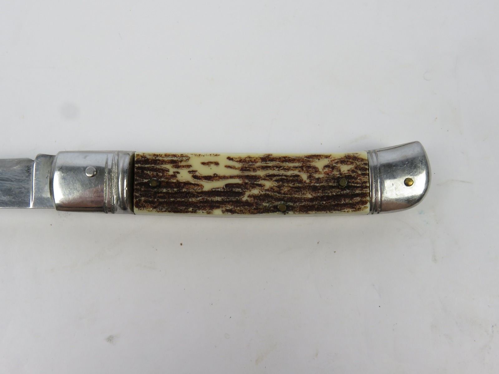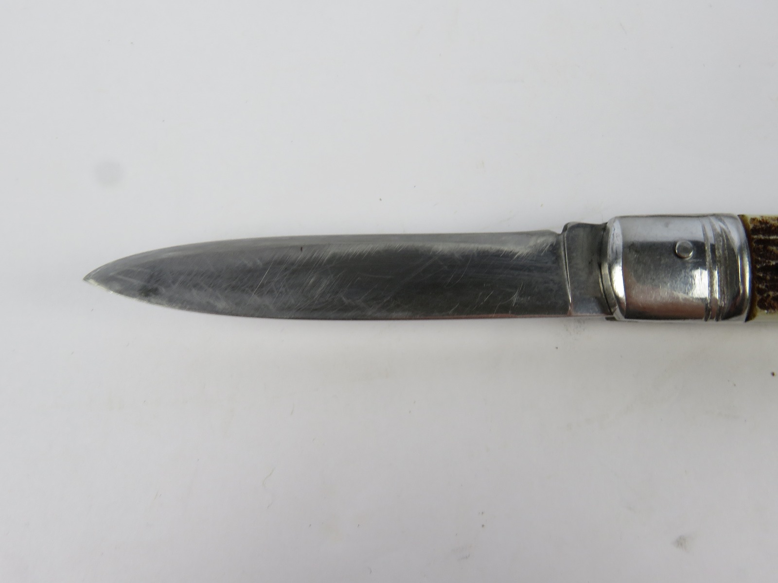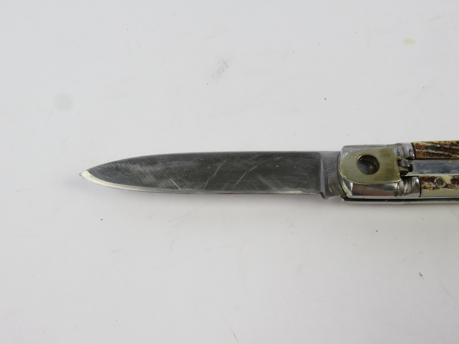6/29/17 – This is a set of 3 original 1950s production German Hubertus switchblade knives. Each blade has a folding lever that can be flipped and pressed down to spring open the blade. There’s a spring bar on the side of each handle. The three blades are all slightly different styles, one is more of a utility blade with multiple functions, while the other two are blade-only. The action on each is quick and smooth. The utility blade ahs a very nice blade maker marking and is excellent with a “stag” style handle. The blade is 3 inches long. The middle blade photoed has an unmarked blade, but a “Rostfrei” stamp near the base of the blade/pivot area. This blade is also 3 inches long. The smallest blade, and lowest in the grouping shots, is another stag handle with a clean blade and maker marking. The action gets caught up slightly, but can easily be oiled with WD40 for a smoother action (if desired). The handle is stag style on this one as well. All are guaranteed original.