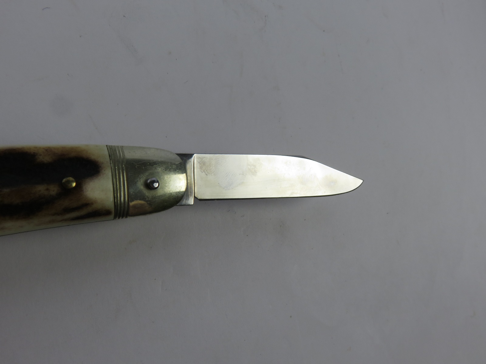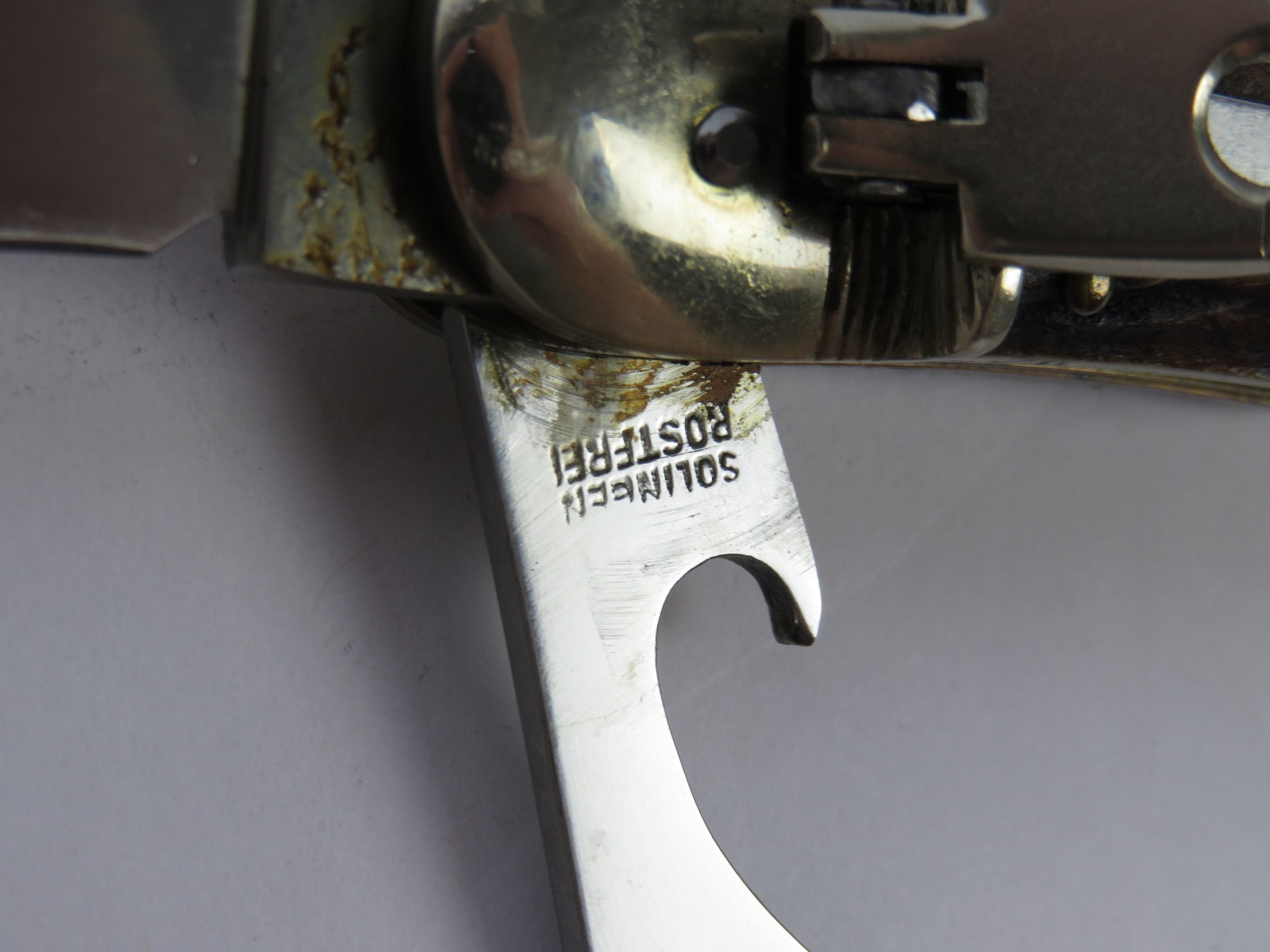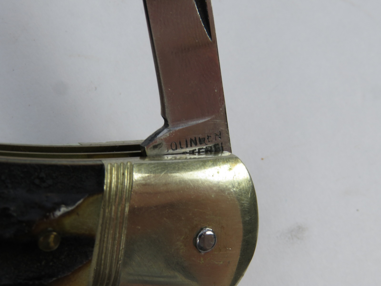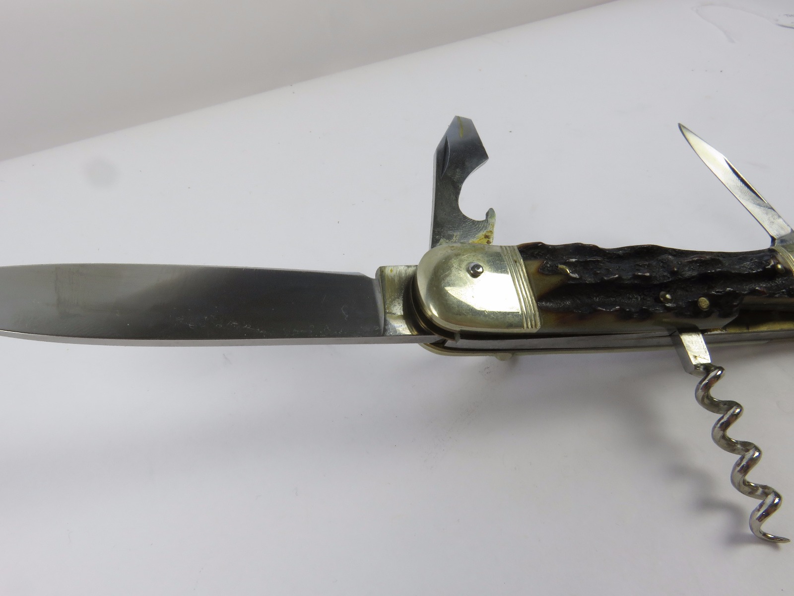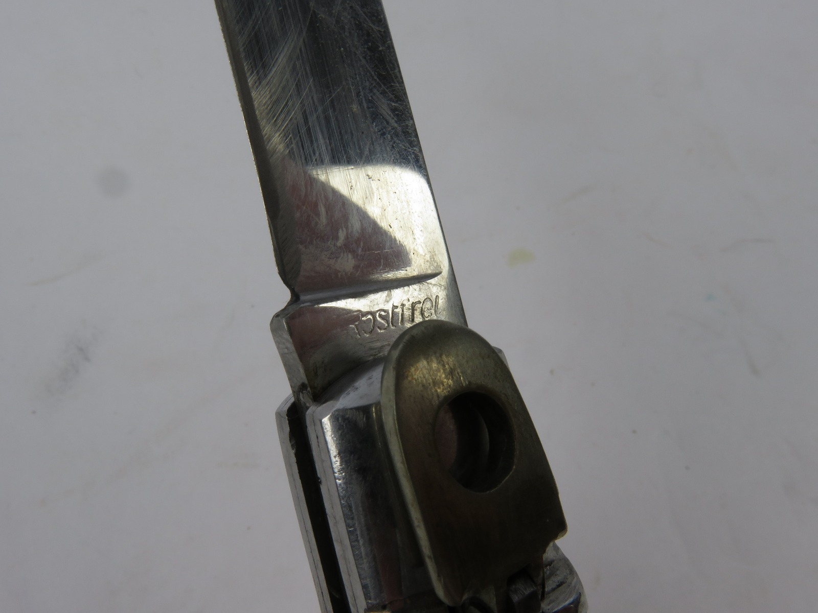 6/29/17 – This is a set of 3 original 1950s production German Hubertus switchblade knives. Each blade has a folding lever that can be flipped and pressed down to spring open the blade. There’s a spring bar on the side of each handle. The three blades are all slightly different styles, one is more of a utility blade with multiple functions, while the other two are blade-only. The action on each is quick and smooth. The utility blade ahs a very nice blade maker marking and is excellent with a “stag” style handle. The blade is 3 inches long. The middle blade photoed has an unmarked blade, but a “Rostfrei” stamp near the base of the blade/pivot area. This blade is also 3 inches long. The smallest blade, and lowest in the grouping shots, is another stag handle with a clean blade and maker marking. The action gets caught up slightly, but can easily be oiled with WD40 for a smoother action (if desired). The handle is stag style on this one as well. All are guaranteed original.