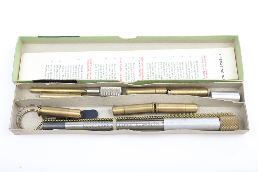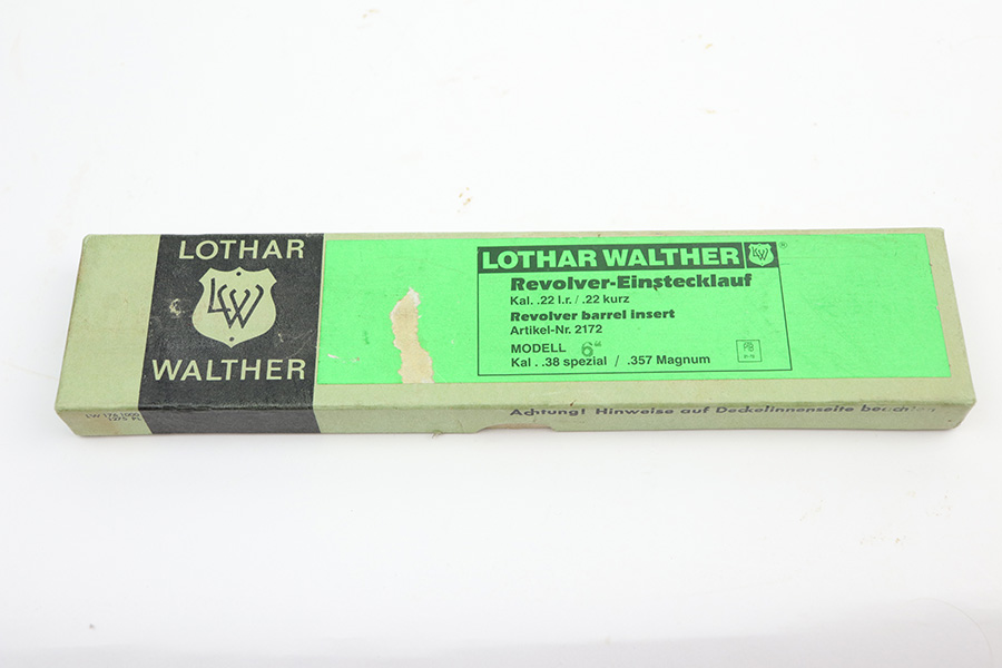 08/19/21 – This conversion kit produced by Lothar Walther is designed for 6″ barrel revolvers that typically use .38 or .357 cartridges and allows for use of .22 LR or .22 Short cartridges. The box is in excellent condition and the barrel rifling is intact though not pronounced. The kit includes 6 cartridge replacements/cylinder inserts, a barrel, and small tools.