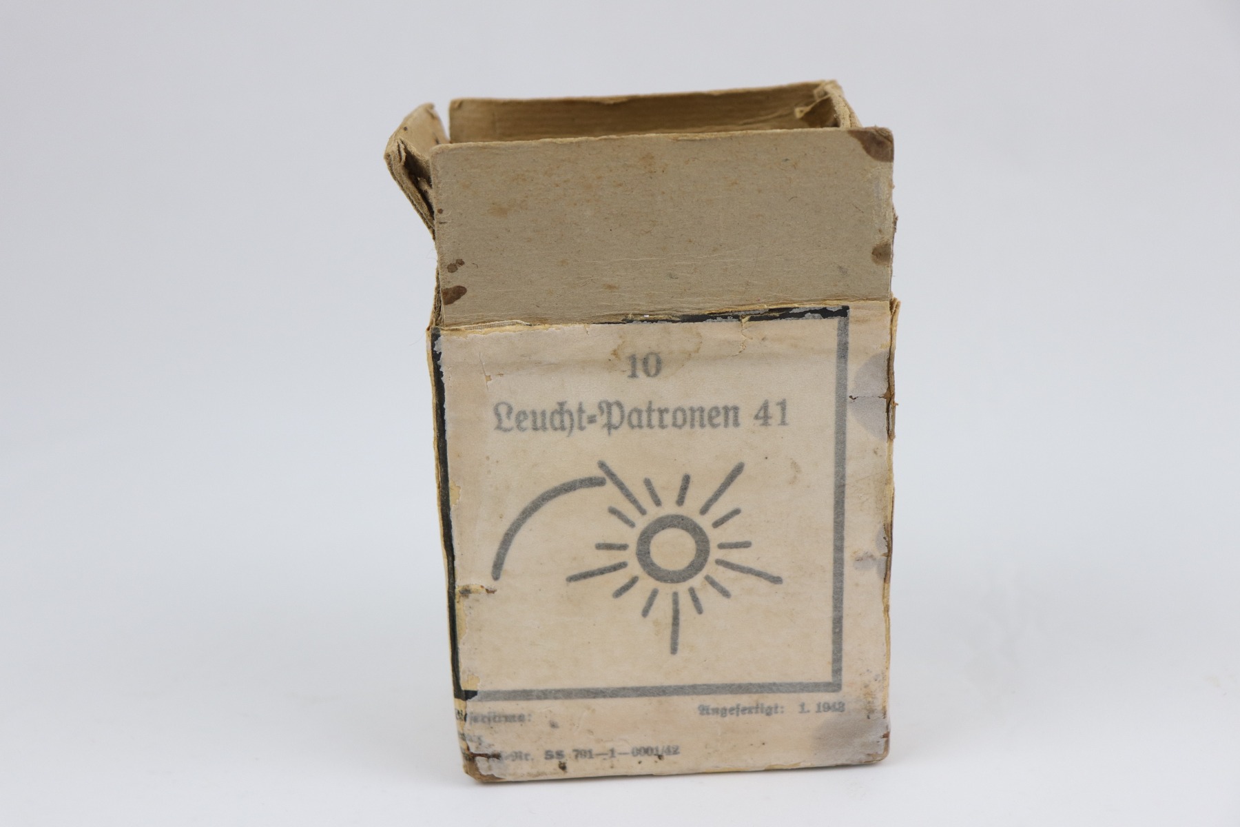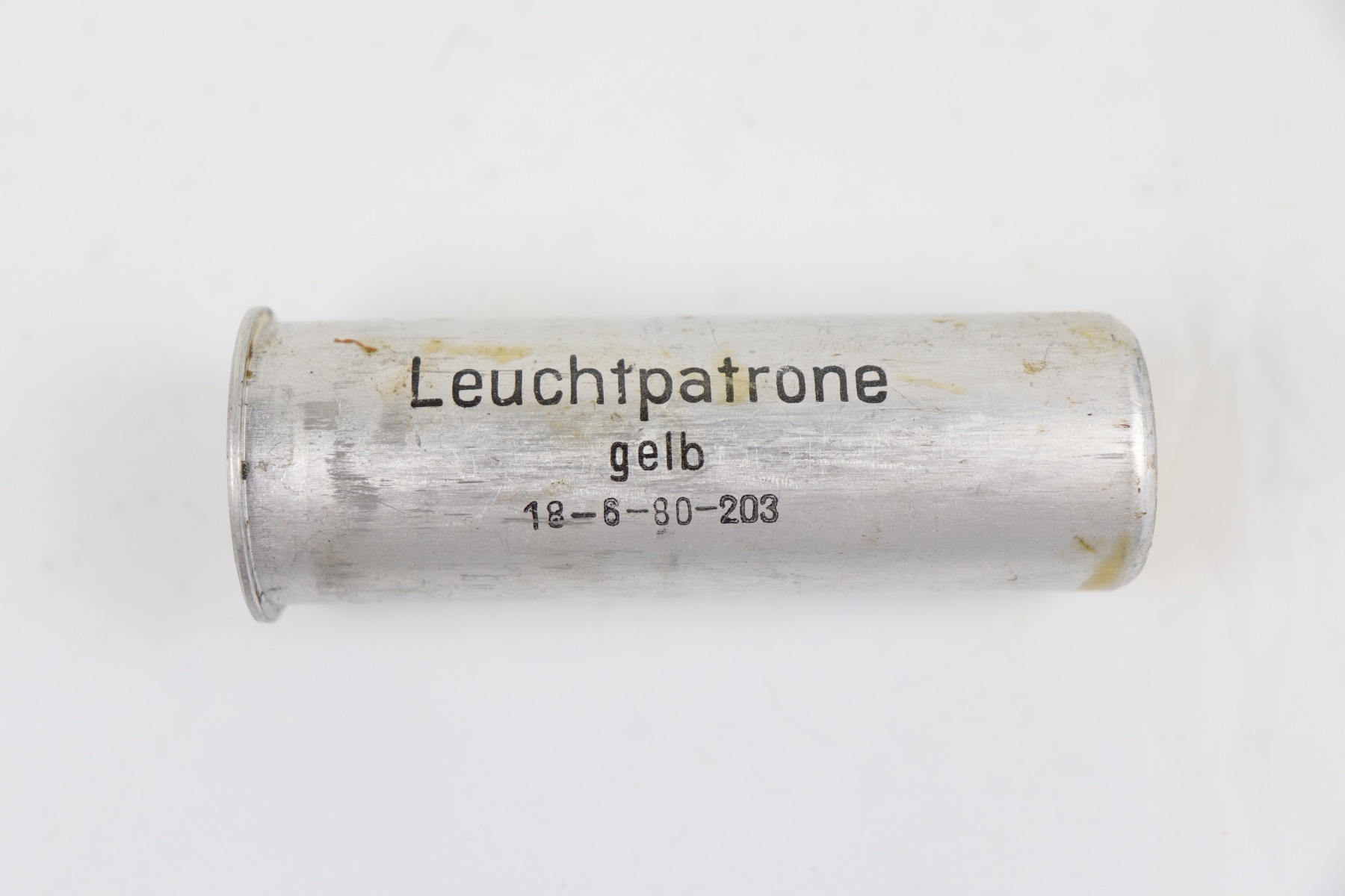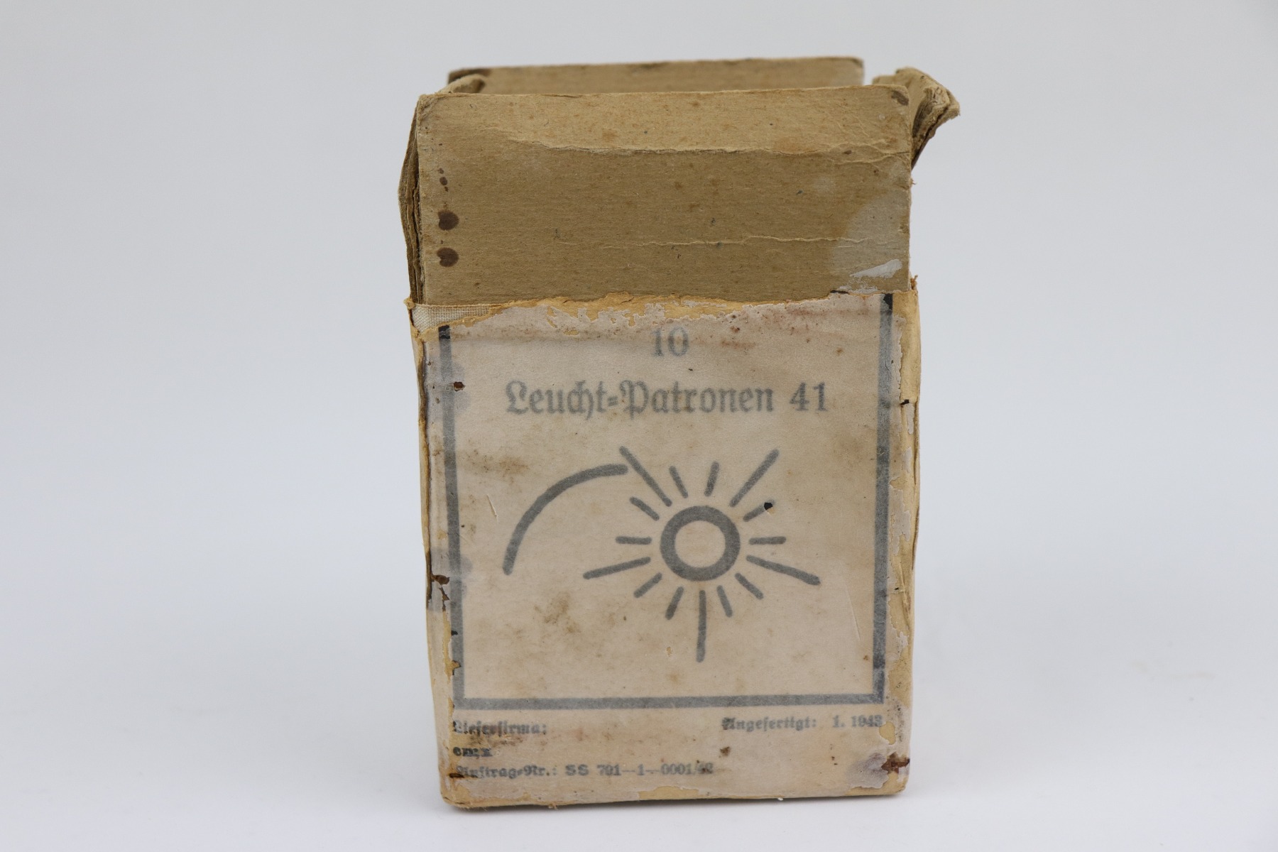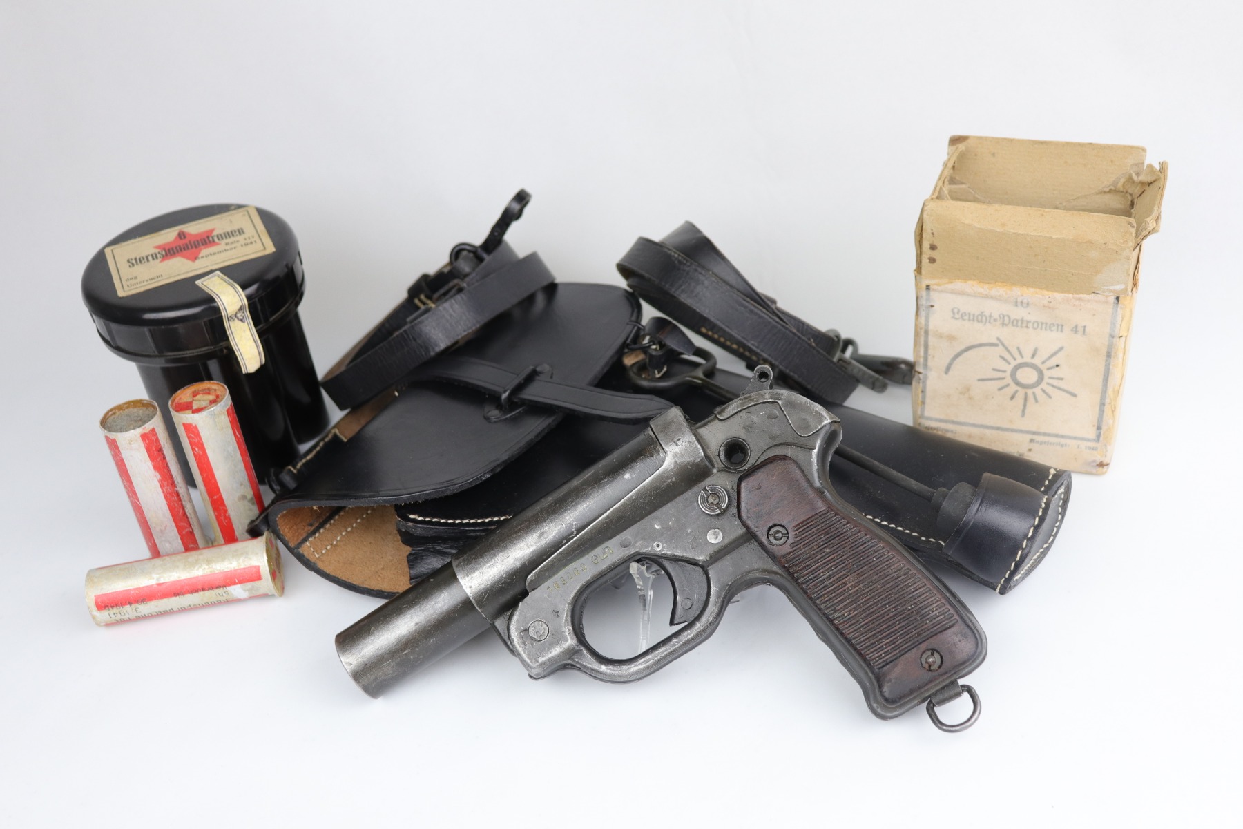 7/20/20 – This is a WW2 Nazi LP-42 Leuchtpistol Flare gun with accessories. The gun comes with two original straps, a round flare transit container, a holster with cleaner rod, and an original cardboard flare box. The gun is mathcing, waffenamt, and “euh” makers-marked. It has retained some of its original finish but there are large areas of wear throughout. There are also small dings here and there. It is mechanically sound. Excellent bore. Nice original wood grips. It comes with a 1940-dated, waffenamt black holster with a cleaning rod. We are not certain of its authenticity, but it is in mint condition. It also comes with two minty, original holster straps. One is dated 1942 and the other is unmarked. The round flare transit case is 1941-dated, waffenamt, and comes with 6 original flares. There is also a bonus yellow flare. The original cardboard box is in good condition and dated 1941. The labels are a little faint but still visible. There are a few tears along the edges. No FFL required.