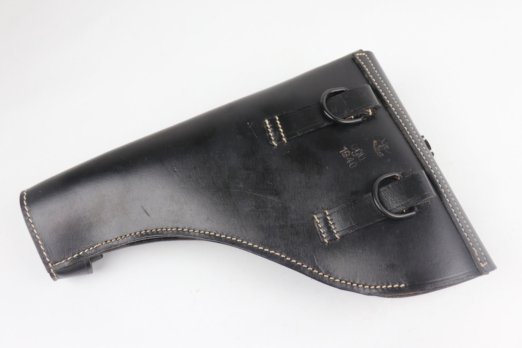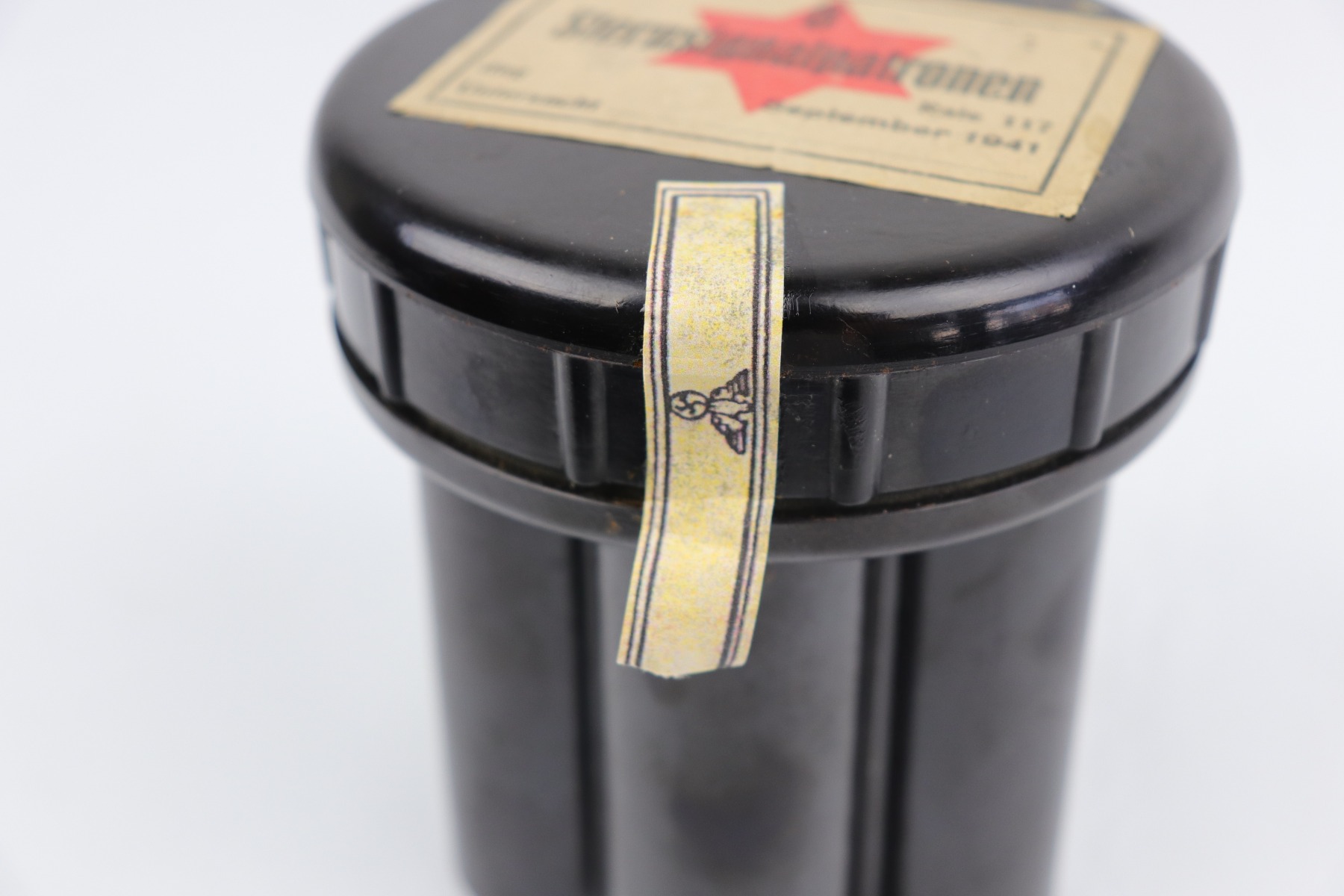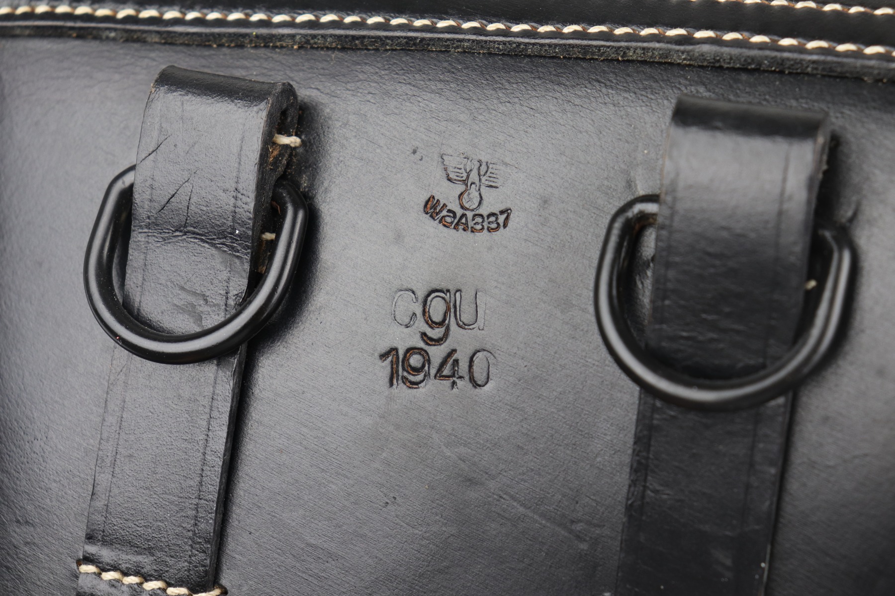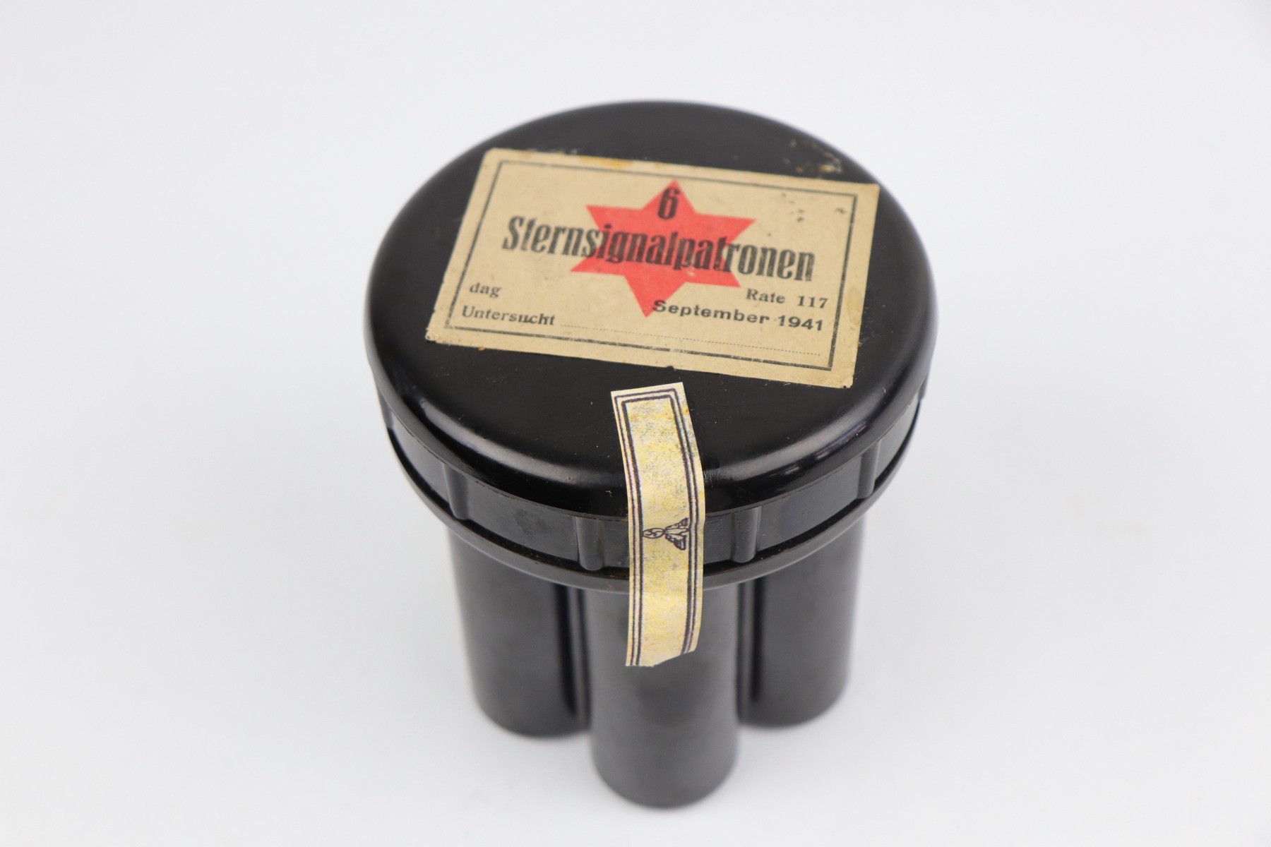 7/20/20 – This is a WW2 Nazi LP-42 Leuchtpistol Flare gun with accessories. The gun comes with two original straps, a round flare transit container, a holster with cleaner rod, and an original cardboard flare box. The gun is mathcing, waffenamt, and “euh” makers-marked. It has retained some of its original finish but there are large areas of wear throughout. There are also small dings here and there. It is mechanically sound. Excellent bore. Nice original wood grips. It comes with a 1940-dated, waffenamt black holster with a cleaning rod. We are not certain of its authenticity, but it is in mint condition. It also comes with two minty, original holster straps. One is dated 1942 and the other is unmarked. The round flare transit case is 1941-dated, waffenamt, and comes with 6 original flares. There is also a bonus yellow flare. The original cardboard box is in good condition and dated 1941. The labels are a little faint but still visible. There are a few tears along the edges. No FFL required.