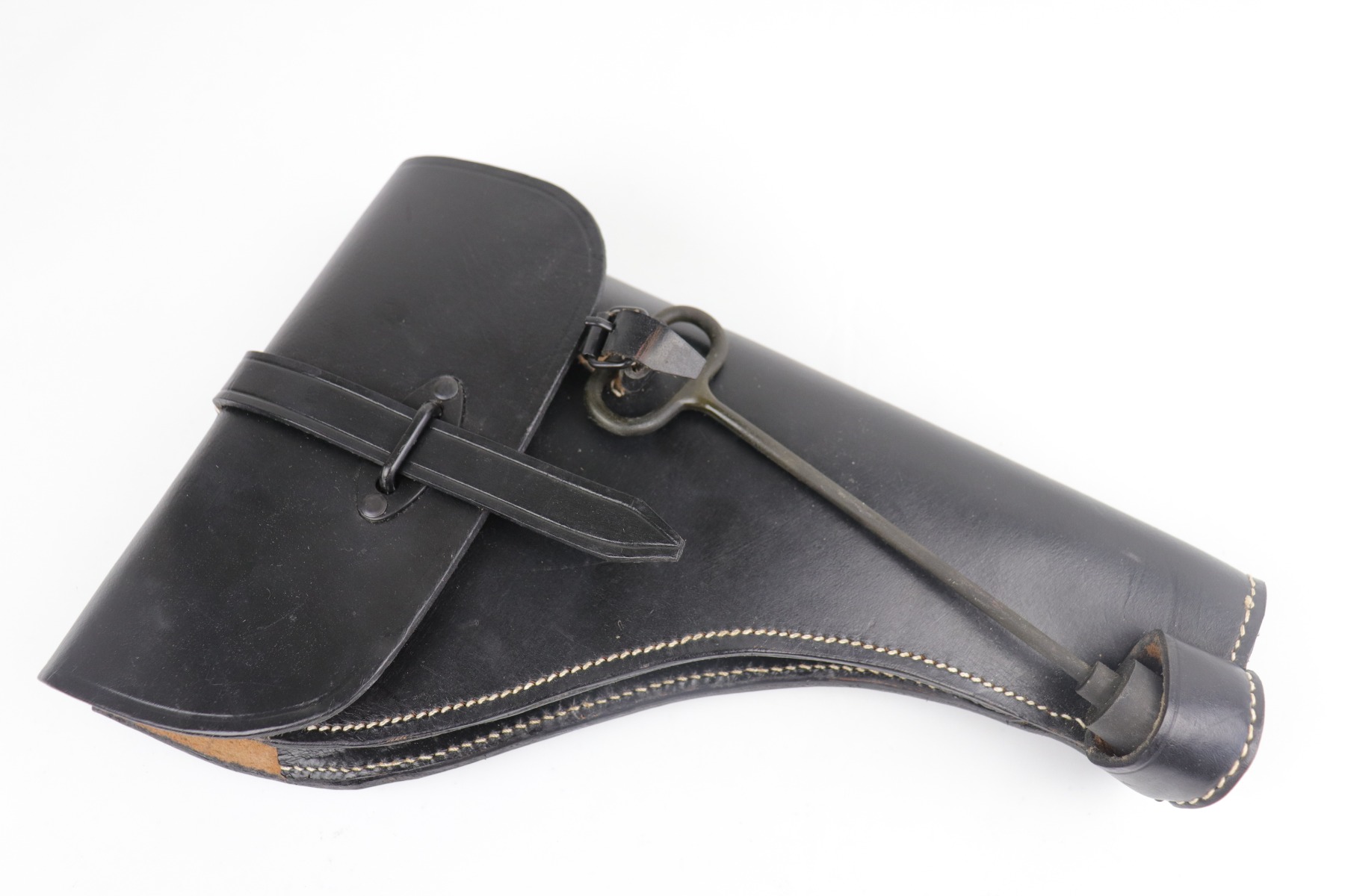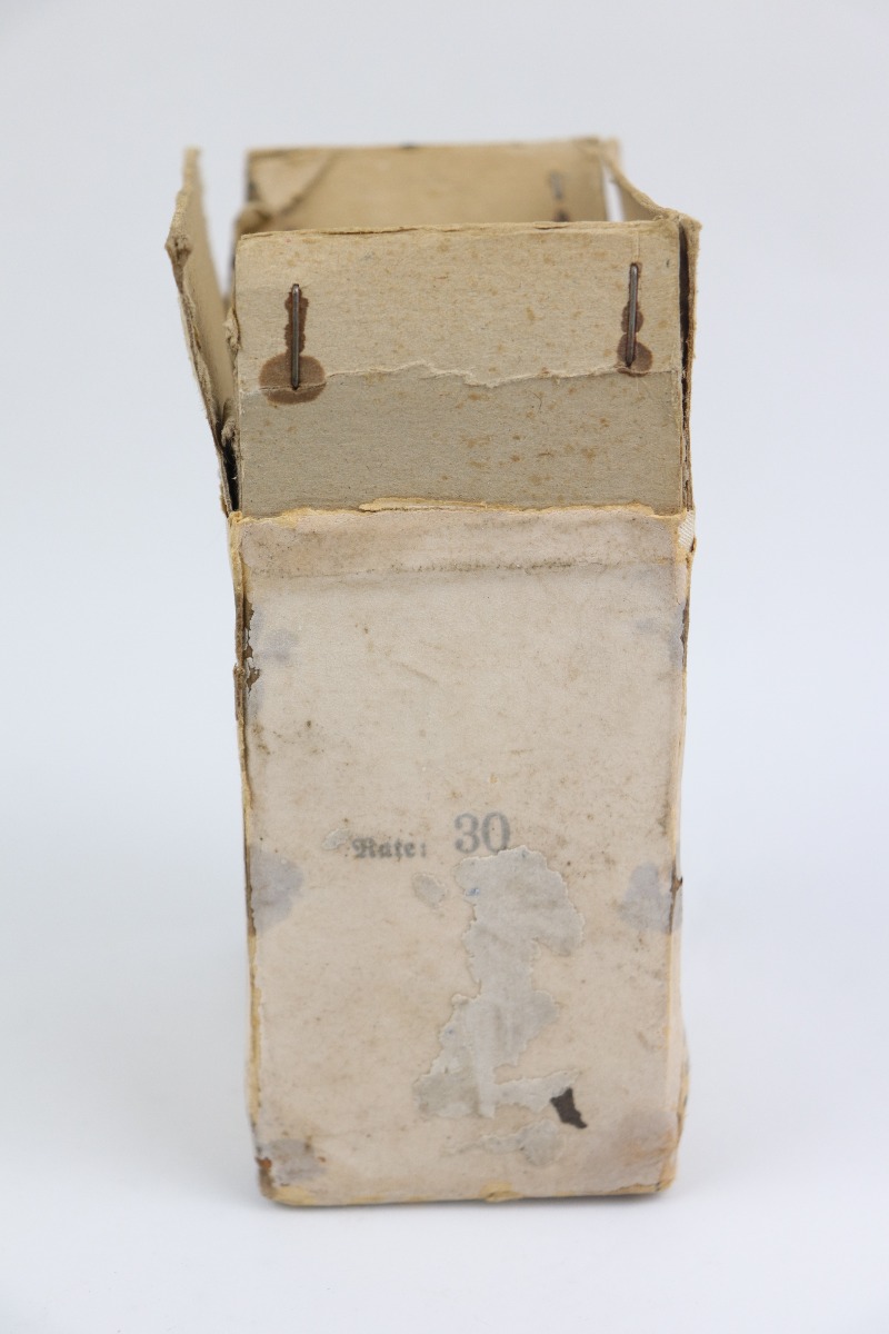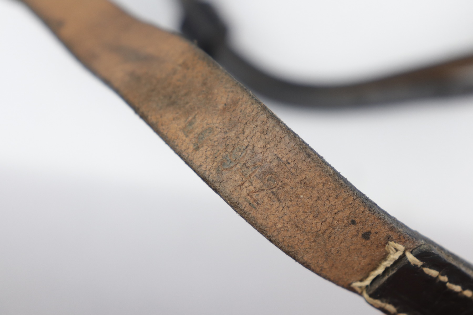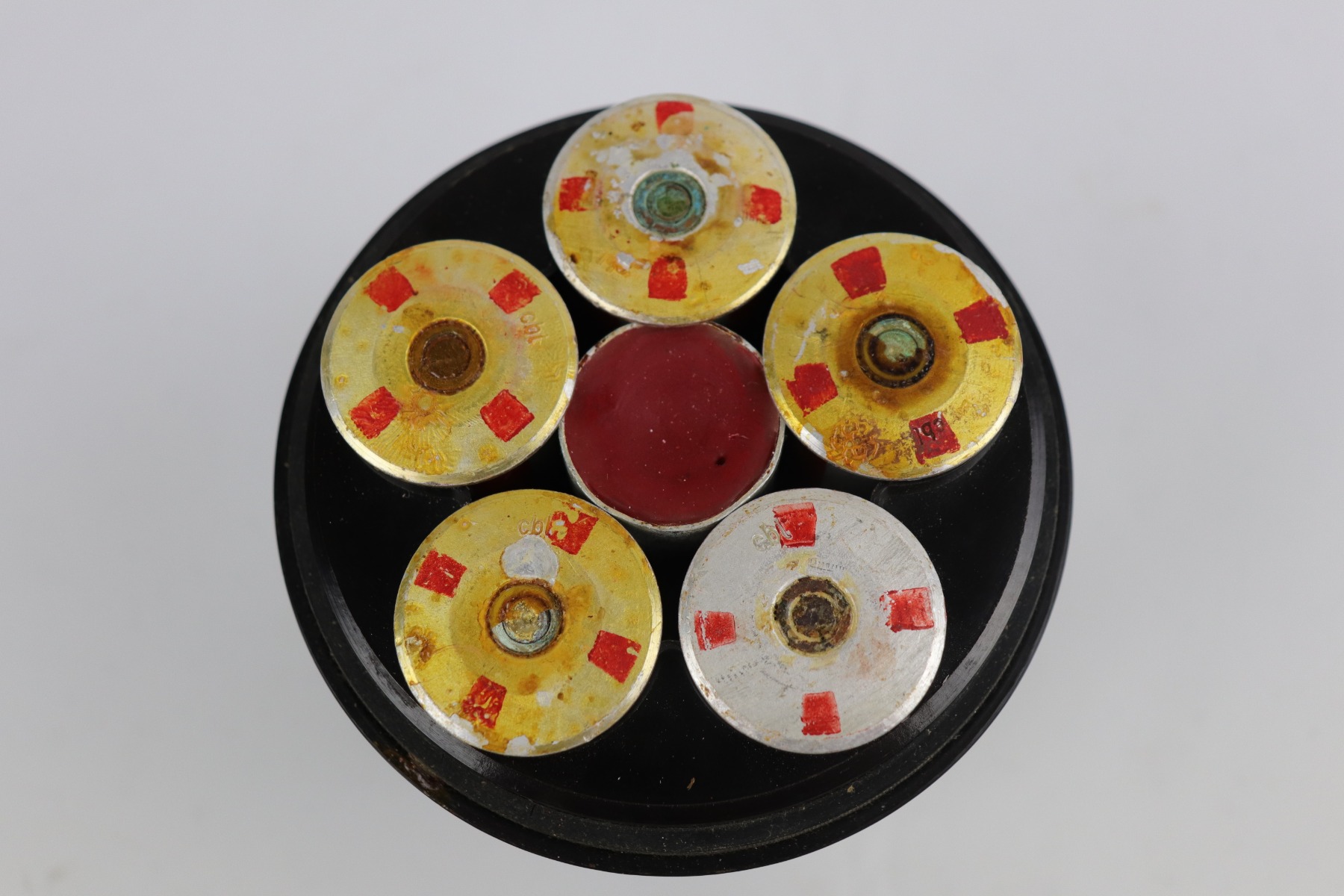7/20/20 – This is a WW2 Nazi LP-42 Leuchtpistol Flare gun with accessories. The gun comes with two original straps, a round flare transit container, a holster with cleaner rod, and an original cardboard flare box. The gun is mathcing, waffenamt, and “euh” makers-marked. It has retained some of its original finish but there are large areas of wear throughout. There are also small dings here and there. It is mechanically sound. Excellent bore. Nice original wood grips. It comes with a 1940-dated, waffenamt black holster with a cleaning rod. We are not certain of its authenticity, but it is in mint condition. It also comes with two minty, original holster straps. One is dated 1942 and the other is unmarked. The round flare transit case is 1941-dated, waffenamt, and comes with 6 original flares. There is also a bonus yellow flare. The original cardboard box is in good condition and dated 1941. The labels are a little faint but still visible. There are a few tears along the edges. No FFL required.