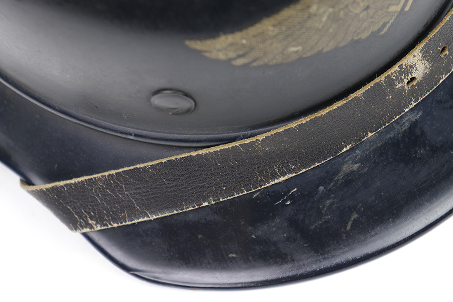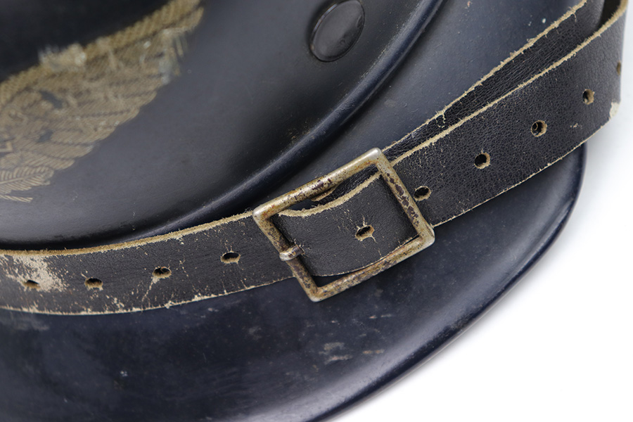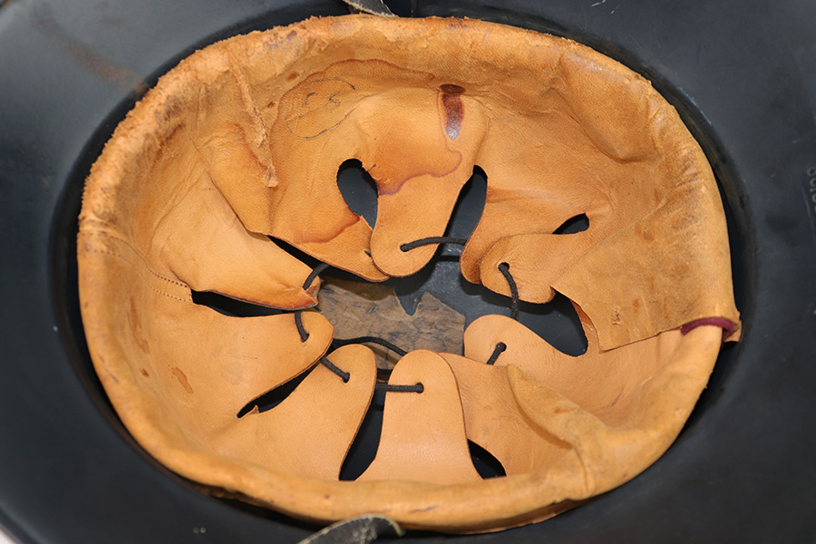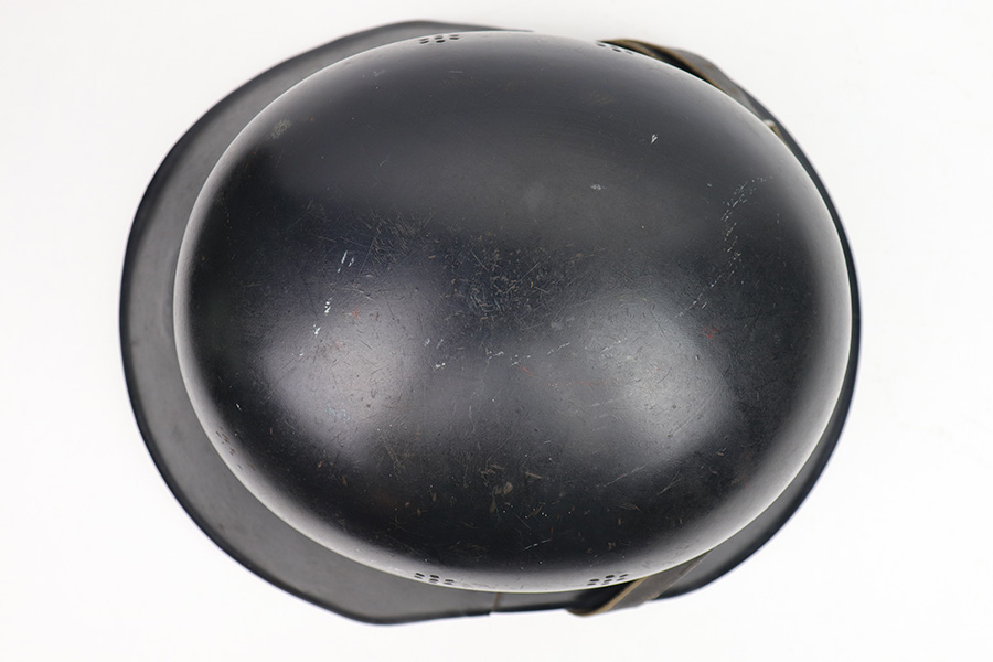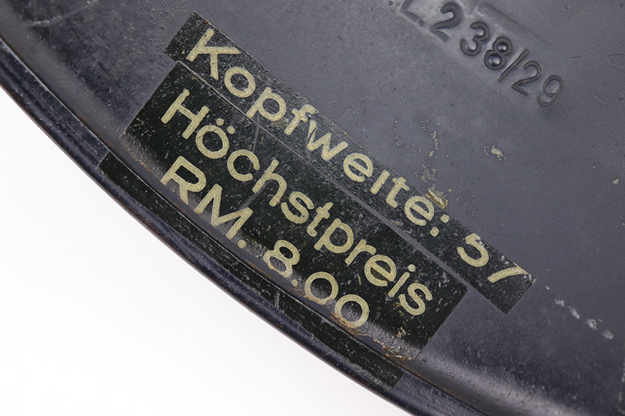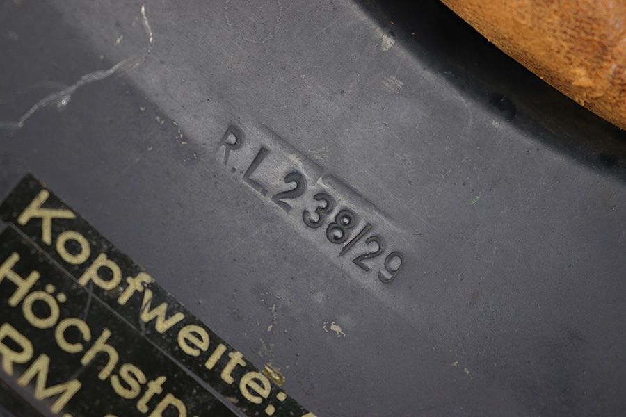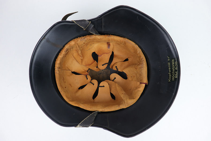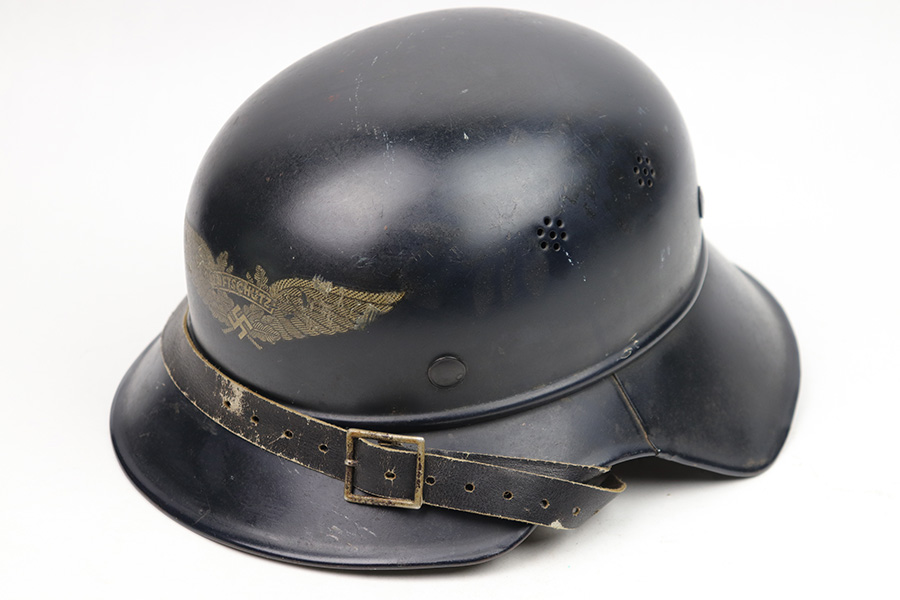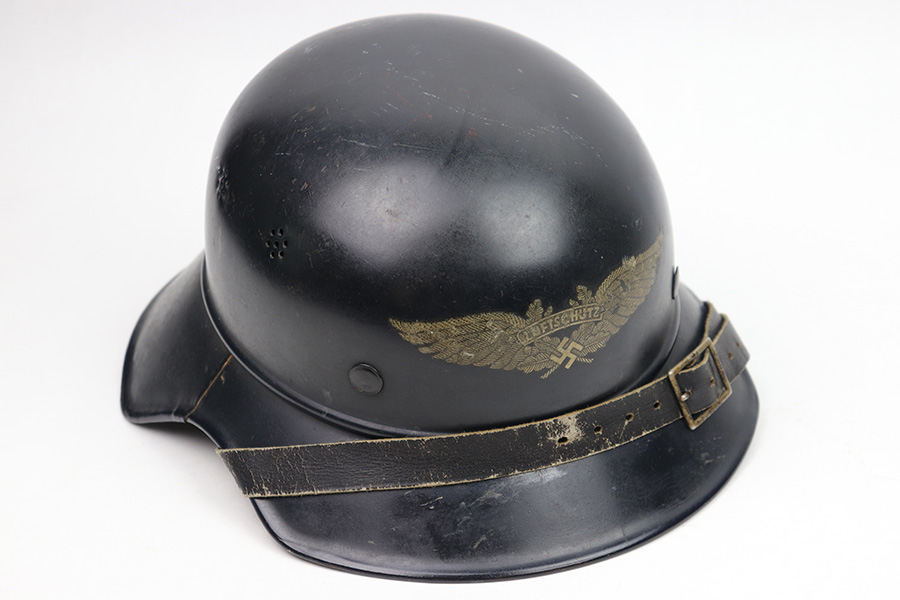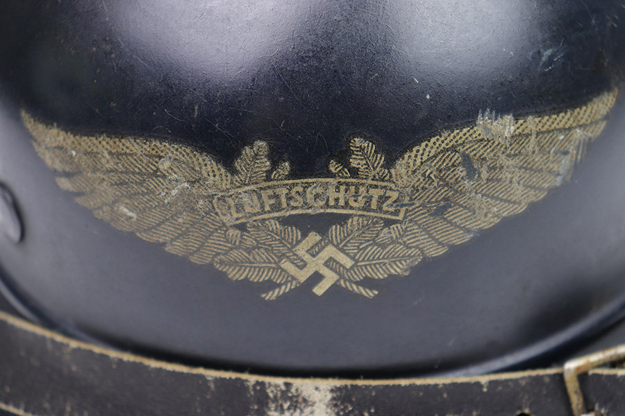 1/10/23 – This is an original 3 piece Luftschutz Gladiator style helmet from WW2. The helmet is in great condition. The exterior shell has a Luftschutz logo on the front that has some mild scuffs and surface wear but no major issues. About 95% of the decal is intact. The shell has no dents and minimal surface wear. Most of the original paint is in excellent condition with minimal paint loss. The interior shell is stamped “R L 2 38/29”. The leather liner is in great condition. An original leather chinstrap is still attached as well.