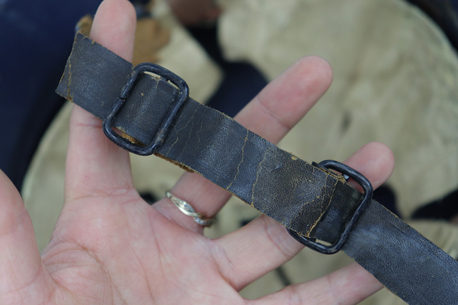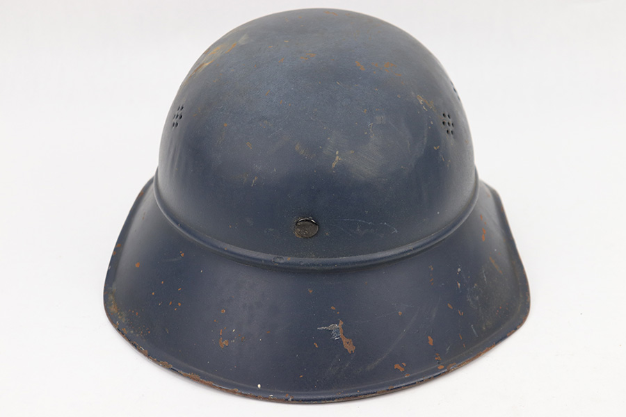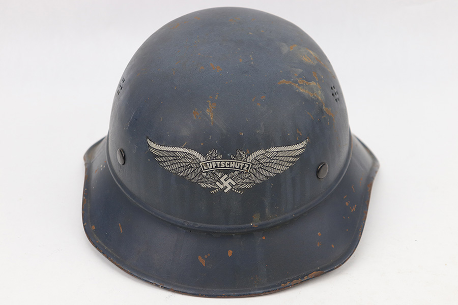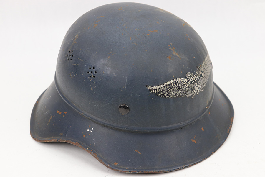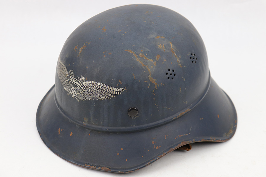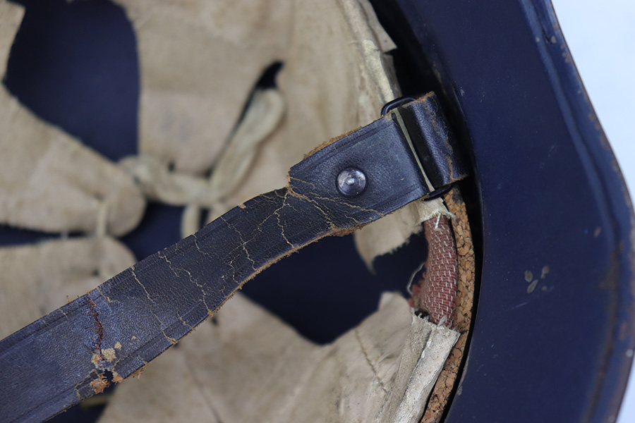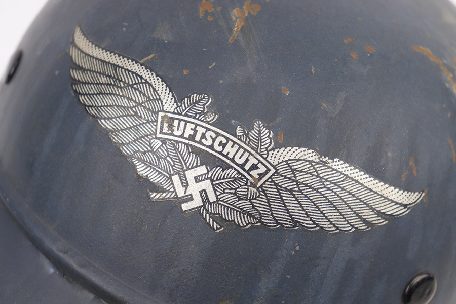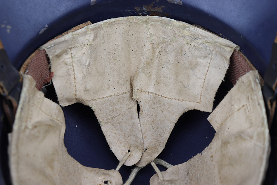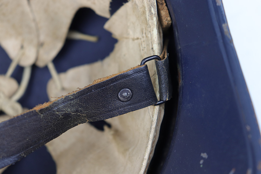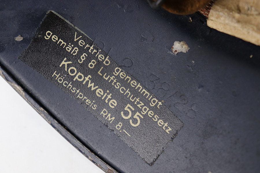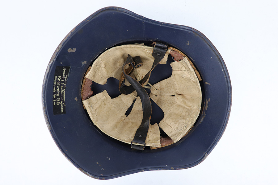 4/21/23 – This is an original Luftschutz Gladiator helmet from WW2. The helmet is 3 piece construction on the outer shell. The exterior features an excellent Luftschutz logo that’s in about 97% overall condition. There are no dents, and most of the original paint is still intact, with a few light scuffs and small areas of surface patina. The original liner shows some aging and surface cracking but is still completely intact. The original leather chinstrap is still attached and intact as well, with some surface cracking and a few small rips in the leather.