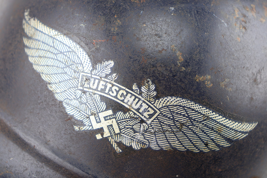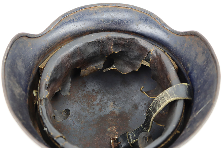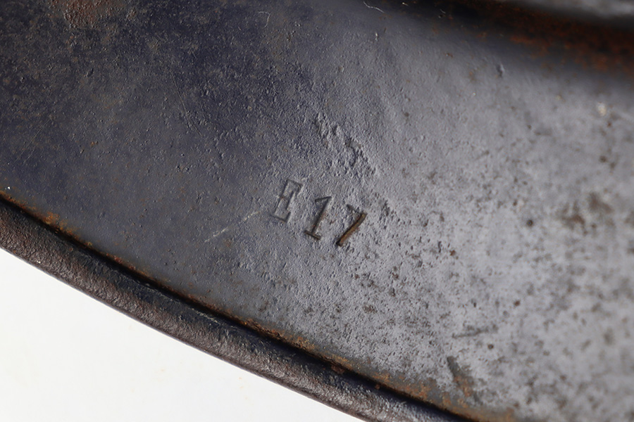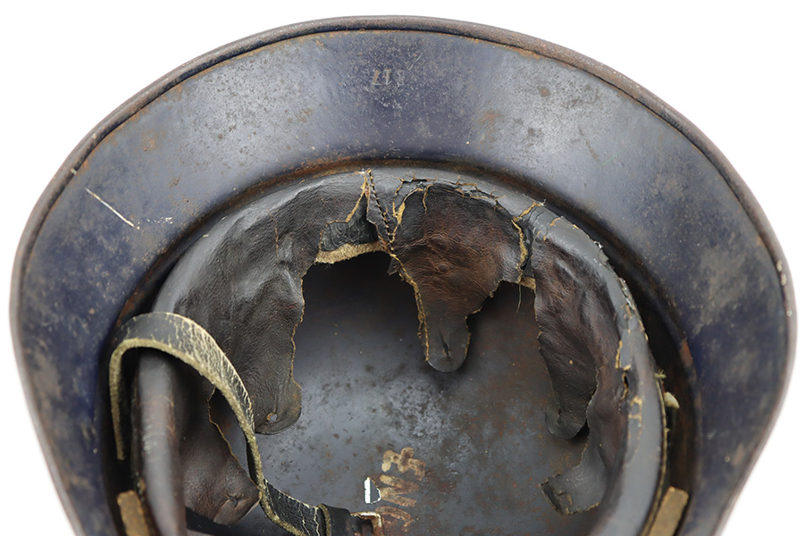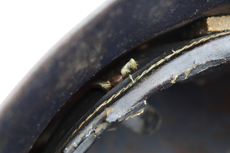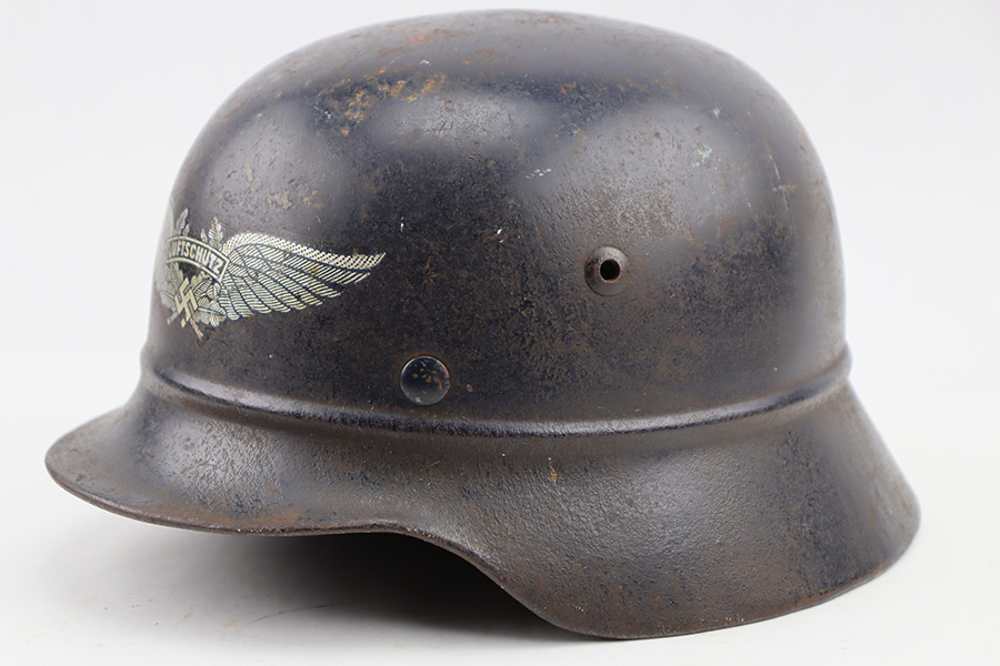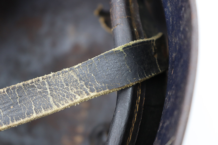 9/22/23 – This is a WW2 M35 Beaded Luftschutz helmet. The helmet is in good condition with an external Luftschutz logo in the front of the shell that’s in about 96+% condition. There’s one or two small blemishes on the wings of the logo, but overall excellent condition. The shell has some mild surface patina and speckling discoloration but the condition is great overall throughout the exterior with most of the original paint still intact. No dents in the shell. The interior of the shell is serial lot numbered and maker / size stamped “I.S. 64”. The leather liner is cracked, dry, and stiff throughout. Portions of the leather are broken and missing, and the cracking is significant. Half of the original chin strap is attached, while the other half is missing. Priced accordingly.