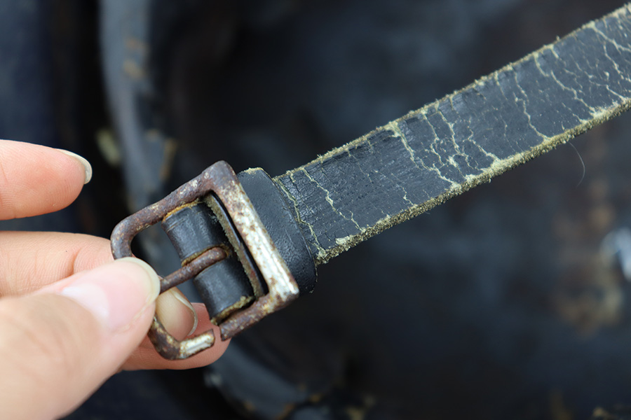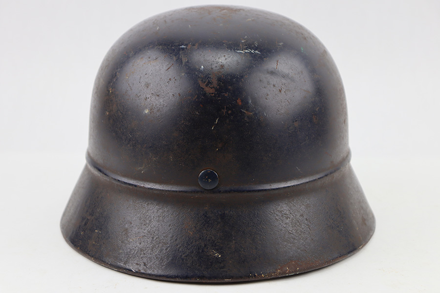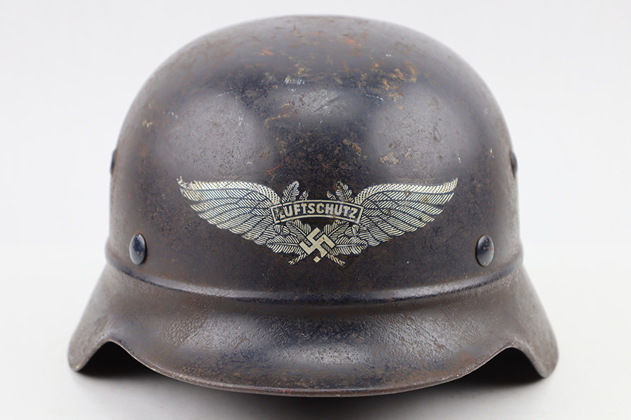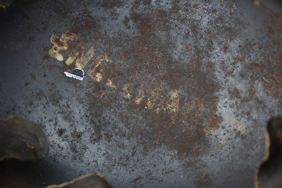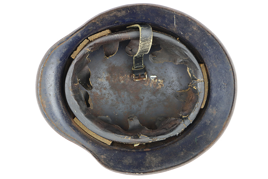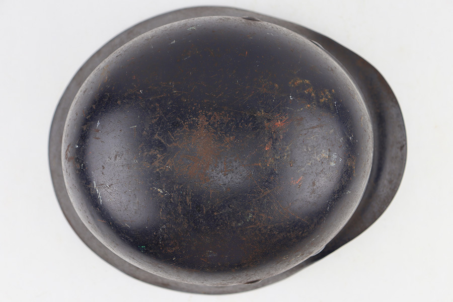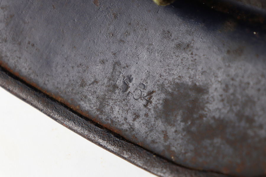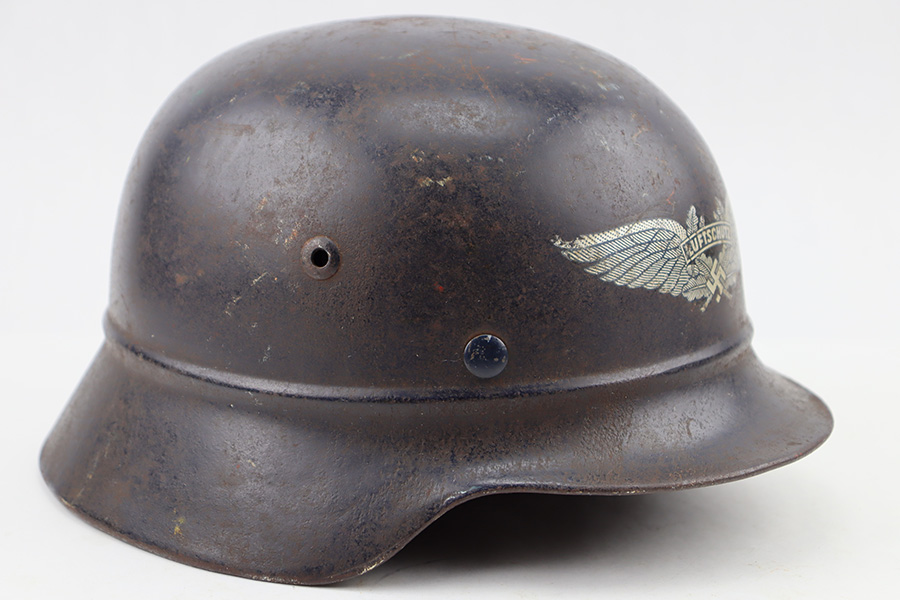 9/22/23 – This is a WW2 M35 Beaded Luftschutz helmet. The helmet is in good condition with an external Luftschutz logo in the front of the shell that’s in about 96+% condition. There’s one or two small blemishes on the wings of the logo, but overall excellent condition. The shell has some mild surface patina and speckling discoloration but the condition is great overall throughout the exterior with most of the original paint still intact. No dents in the shell. The interior of the shell is serial lot numbered and maker / size stamped “I.S. 64”. The leather liner is cracked, dry, and stiff throughout. Portions of the leather are broken and missing, and the cracking is significant. Half of the original chin strap is attached, while the other half is missing. Priced accordingly.