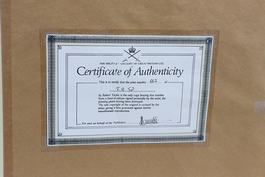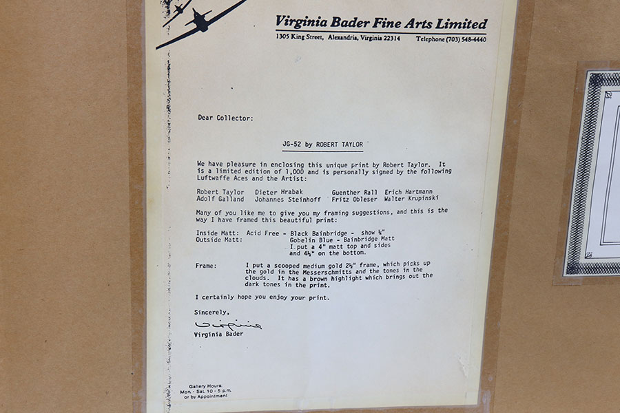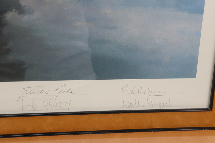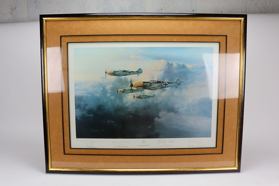 6/9/21 – As featured on our YouTube channel, this is an autographed and numbered limited edition painting. Signed by a group of WW2 Luftwaffe Ace pilots. Only 1000 ever produced. Excellent overall condition.