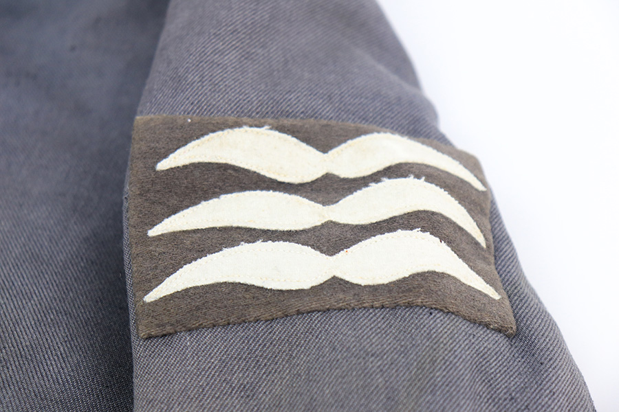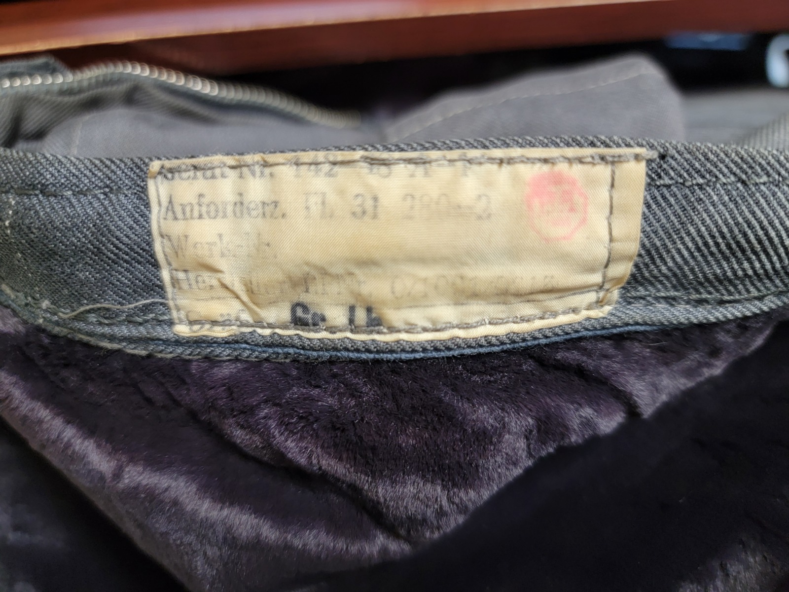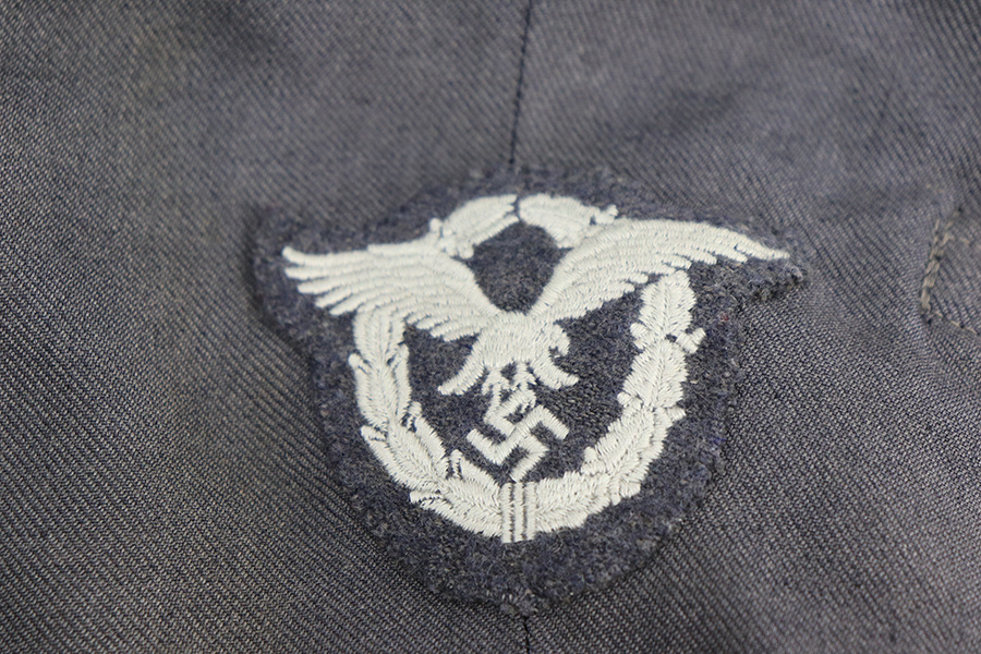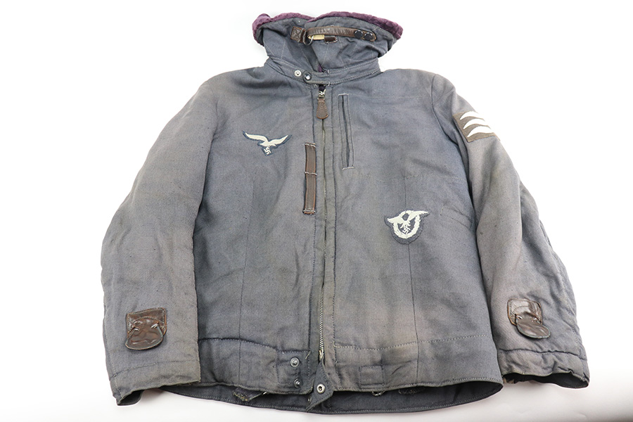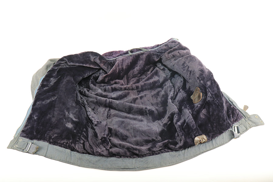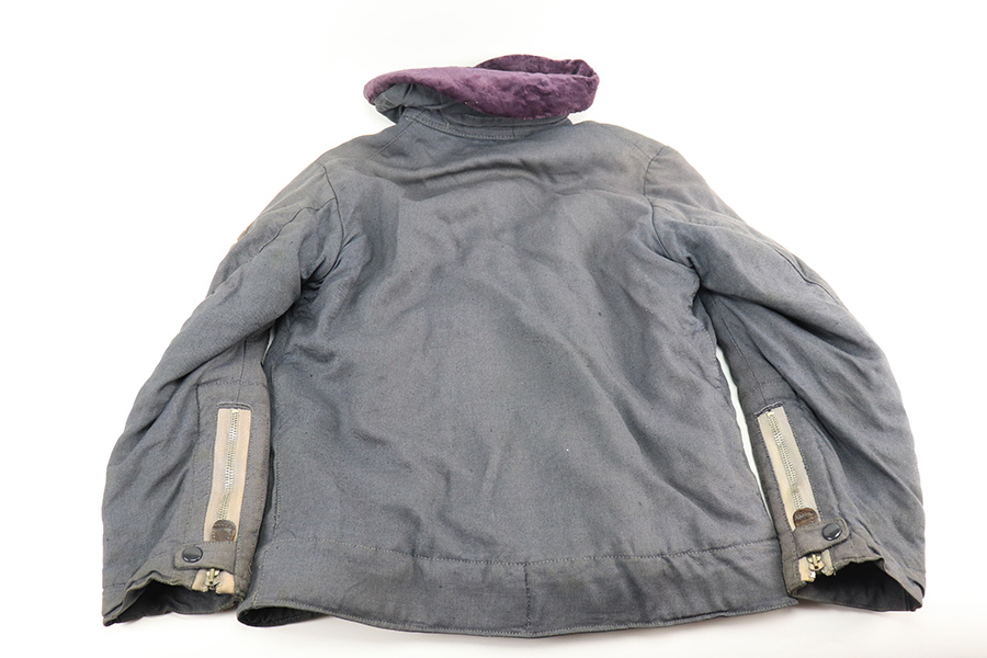 12/10/21 – This is an original Luftwaffe Aviation jacket in great overall condition. Constructed from dark gray twill and a purple lining. The right breast has a Luftwaffe eagle and the left breast has a cloth pilot badge. The left shoulder has a three-eagle rank patch as shown. All of the patches are in great to excellent condition. Connection points for main aircraft power and a pair of heated gloves (not included). This example is noted in the book “Uniforms and Traditions of the Luftwaffe, Vol. 3” by Angolia.