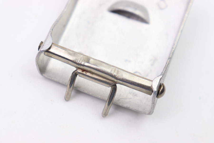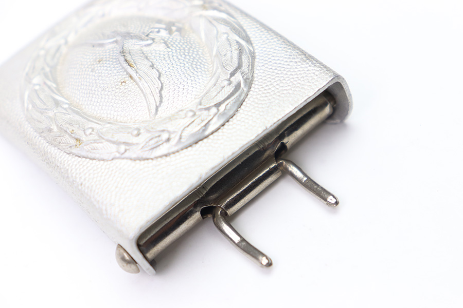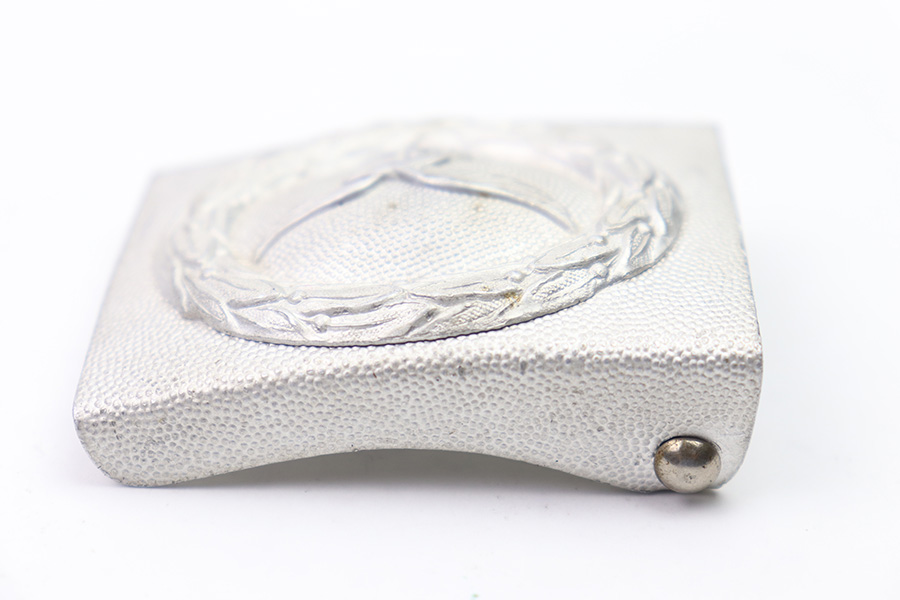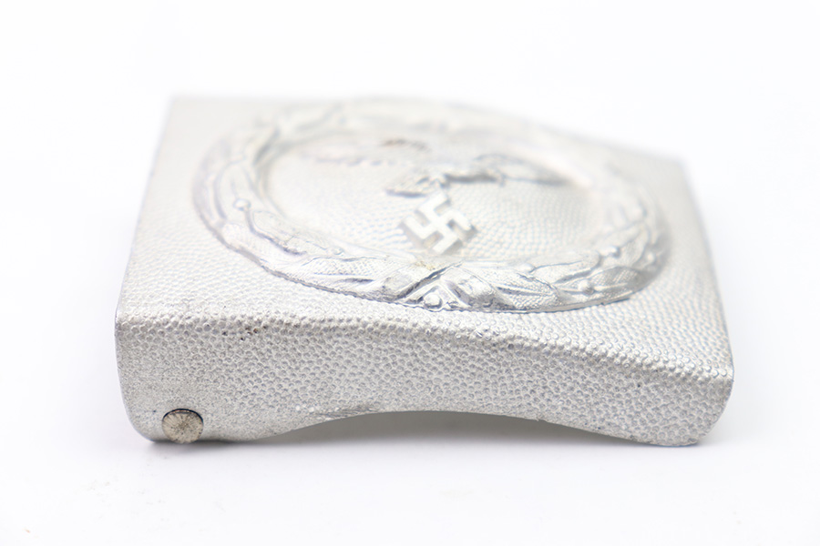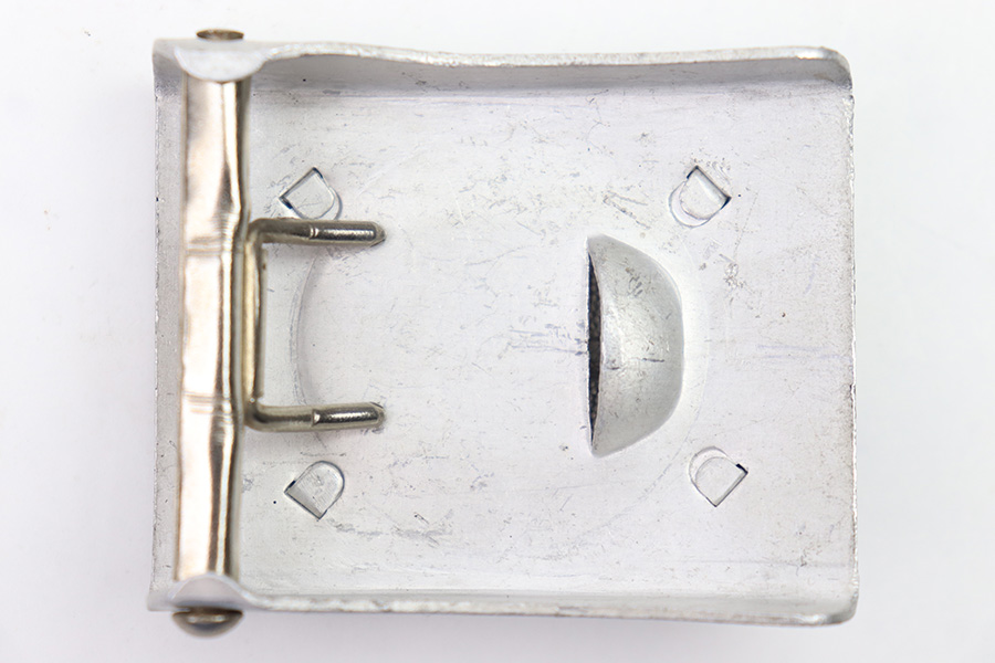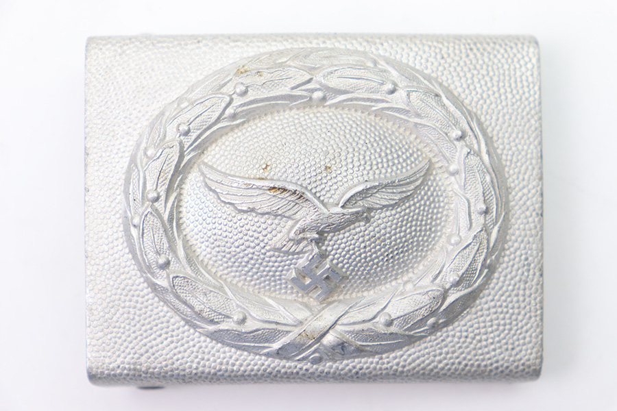 10/14/22 – This is an original Luftwaffe belt buckle from WW2. The buckle is a transitional style aluminum buckle with an early style interior hook, but a wartime style eagle on the front. The buckle is in great condition with minimal wear and patina. No markings or stamps.