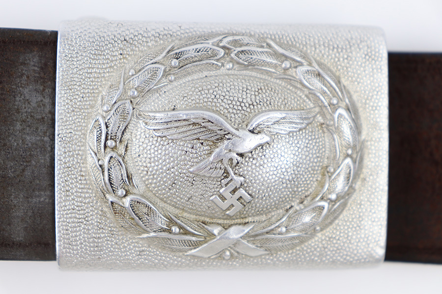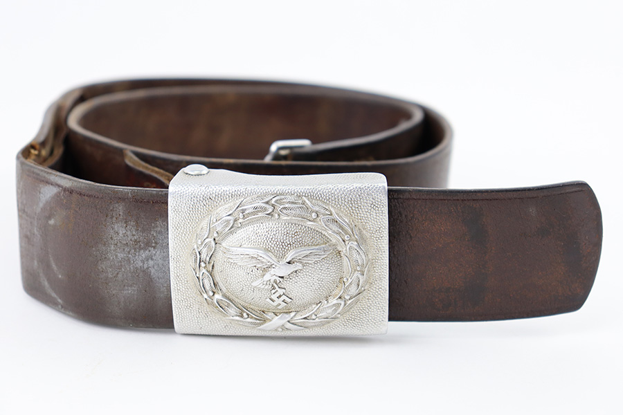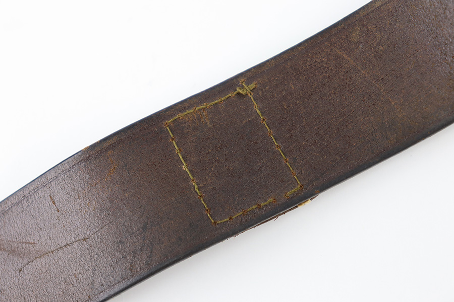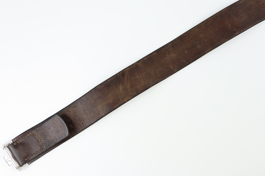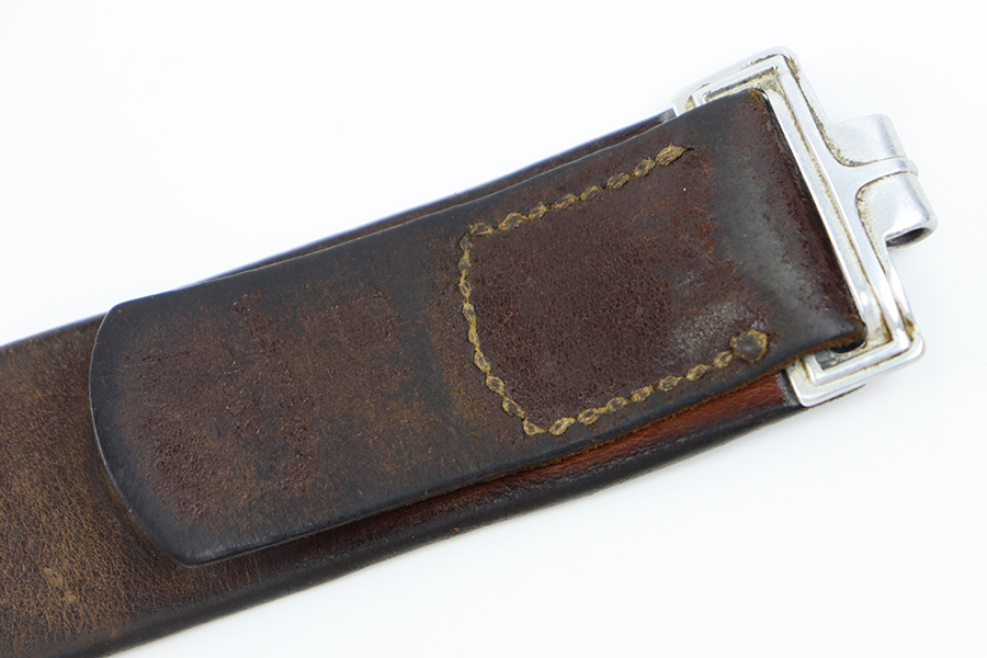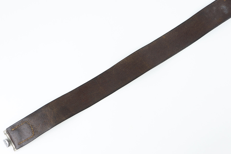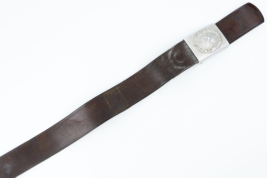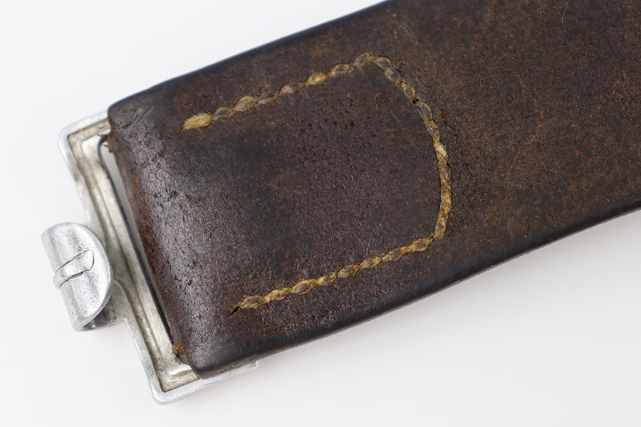 10/10/23 – This is an original WW2 German Luftwaffe uniform belt & buckle. The buckle is aluminum and in great condition with light patina throughout and some rub wear around the high-points (like the eagle face and breast). The interior facing side of the buckle is maker stamped “C.T.D.”. The leather tab attached to the buckle is 1939 dated and maker stamped as well. The leather belt is in great condition, but the leather size-adjustment tab is resewn to the main body of leather. The rest of the stitching throughout is original. The leather is size marked “85” on one end, and the closure-hooked end is both maker stamped and dated. The maker is “Gebruder & Sparfeld” with a 1939 date underneath. A very nice, well marked example.