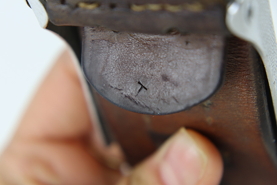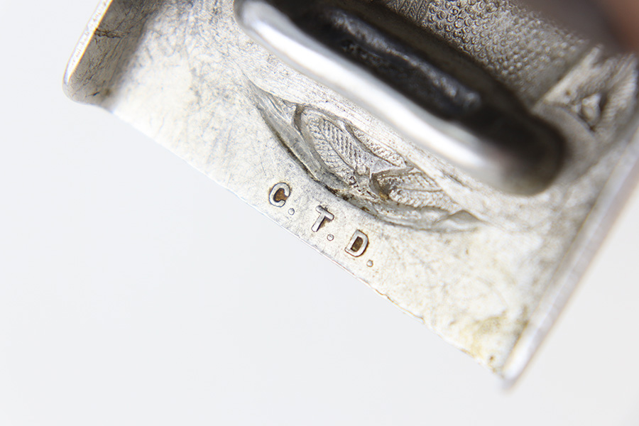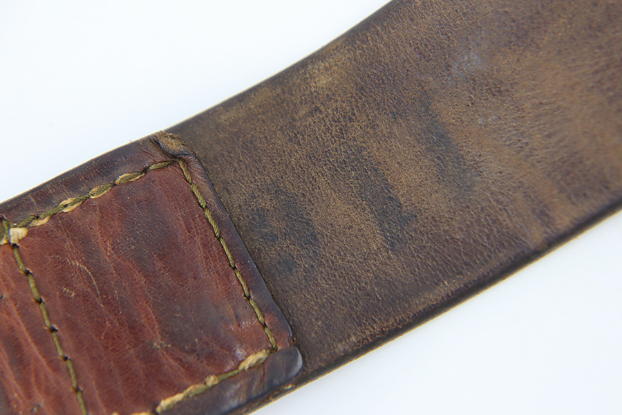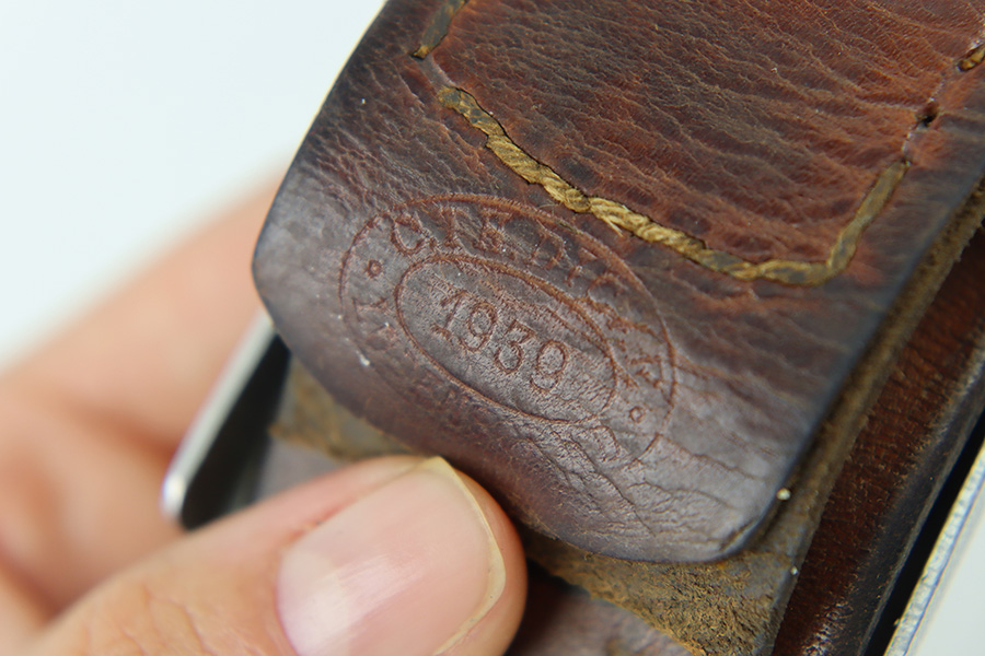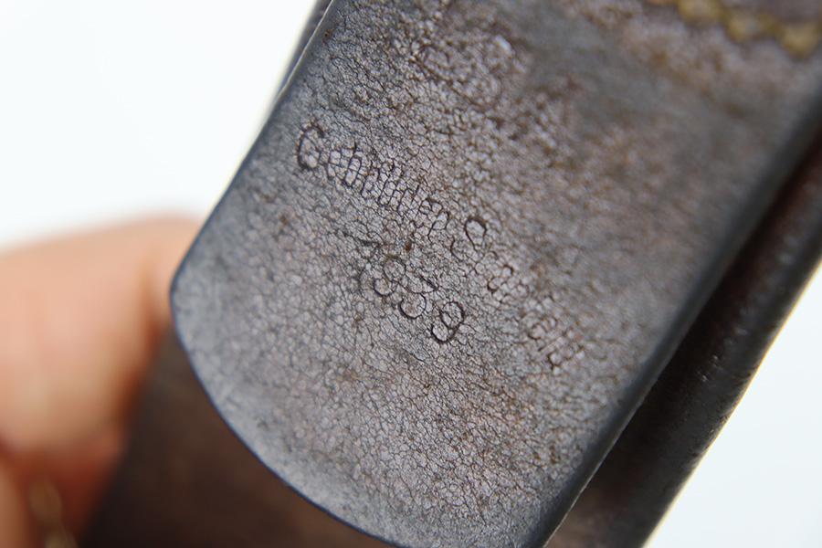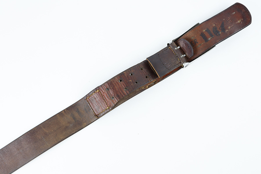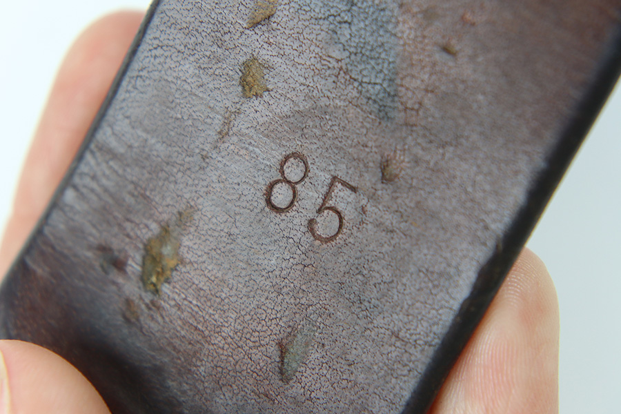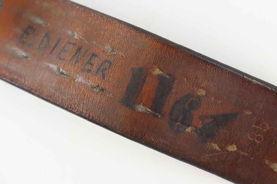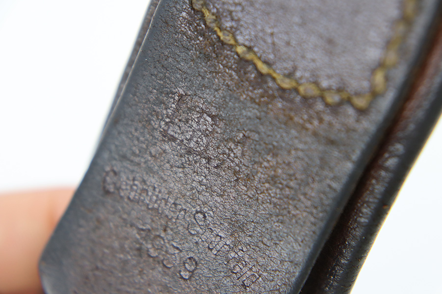 10/10/23 – This is an original WW2 German Luftwaffe uniform belt & buckle. The buckle is aluminum and in great condition with light patina throughout and some rub wear around the high-points (like the eagle face and breast). The interior facing side of the buckle is maker stamped “C.T.D.”. The leather tab attached to the buckle is 1939 dated and maker stamped as well. The leather belt is in great condition, but the leather size-adjustment tab is resewn to the main body of leather. The rest of the stitching throughout is original. The leather is size marked “85” on one end, and the closure-hooked end is both maker stamped and dated. The maker is “Gebruder & Sparfeld” with a 1939 date underneath. A very nice, well marked example.