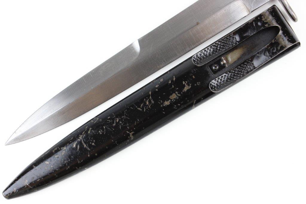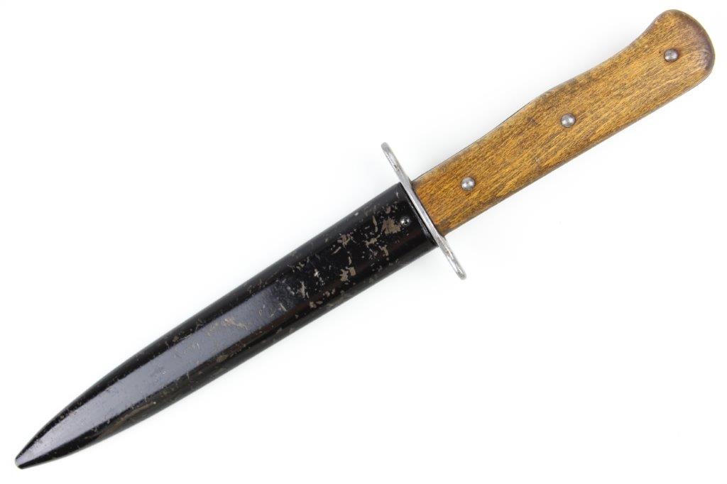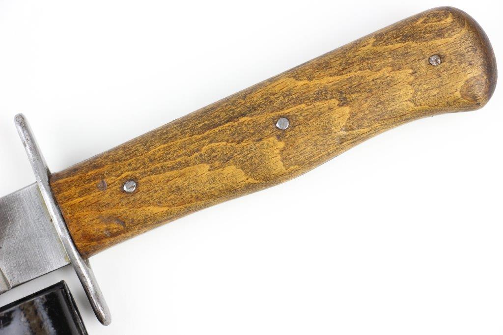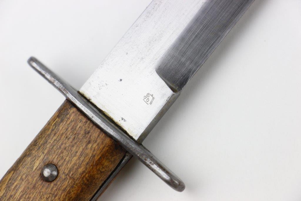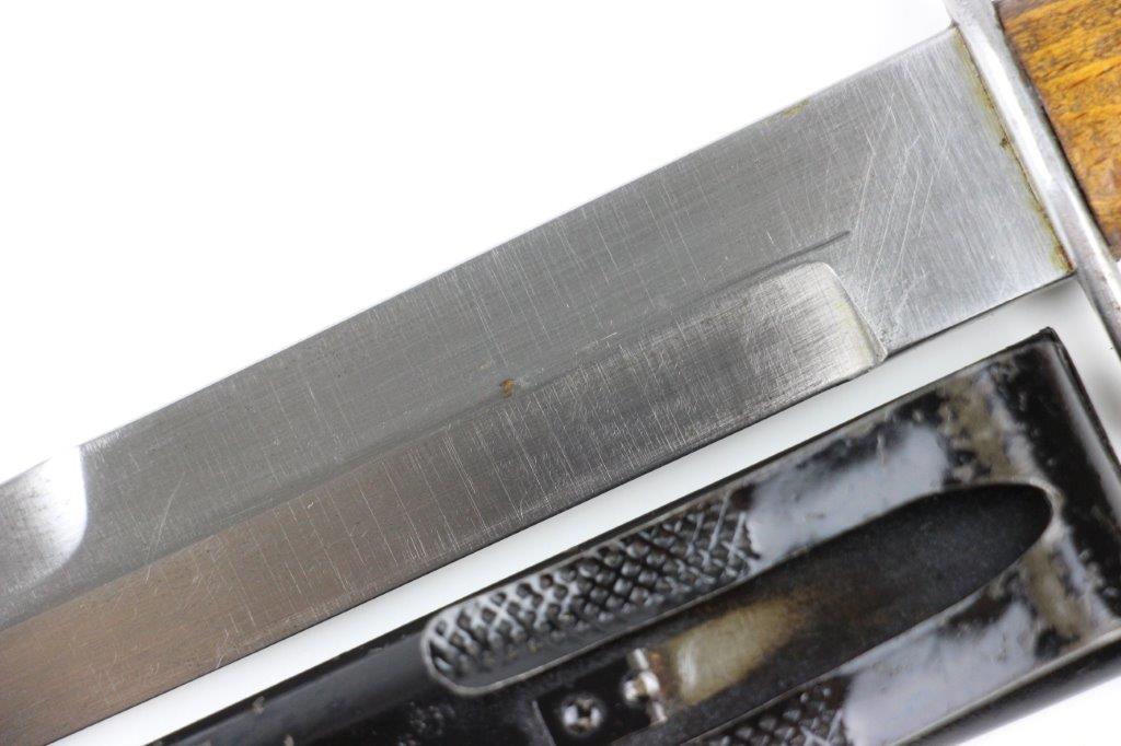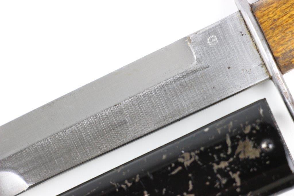 2/14/24 – This is an original WW2 Luftwaffe Boot Knife. The blade is in excellent condition with visible cross graining, minimal surface wear, and an unsharpened edge. There’s a small Luftwaffe proof stamp at the base of the blade, with no other markings. Very nice naturally aged wood handle with no cracks or chips. Comes with an original black painted scabbard.