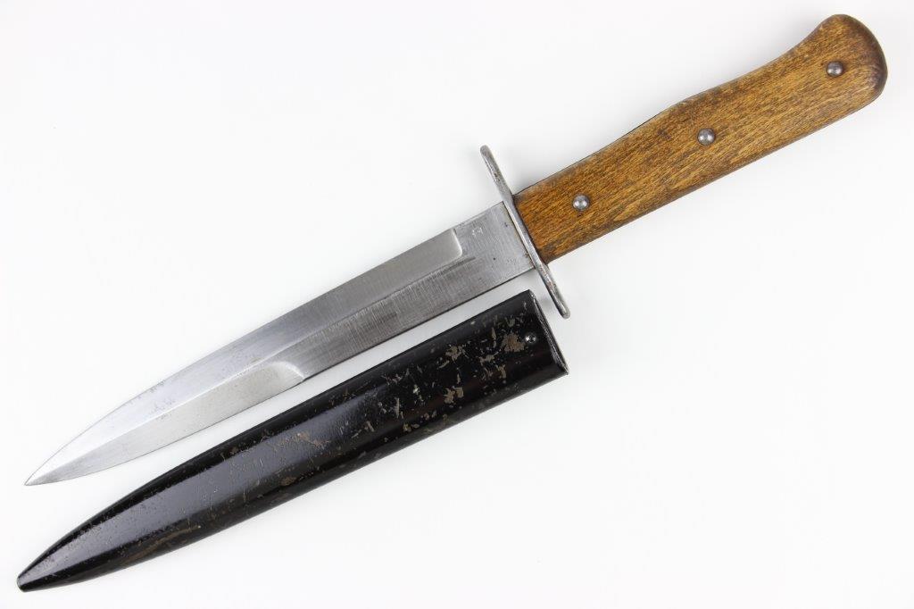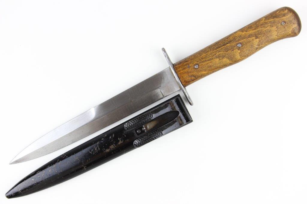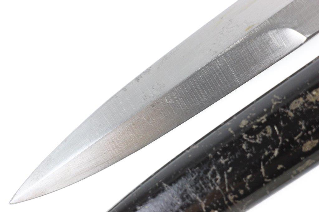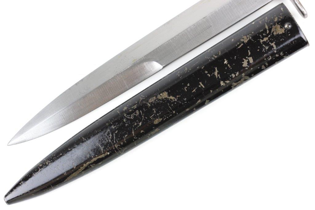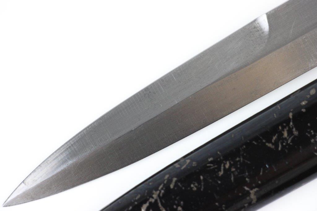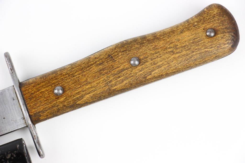 2/14/24 – This is an original WW2 Luftwaffe Boot Knife. The blade is in excellent condition with visible cross graining, minimal surface wear, and an unsharpened edge. There’s a small Luftwaffe proof stamp at the base of the blade, with no other markings. Very nice naturally aged wood handle with no cracks or chips. Comes with an original black painted scabbard.