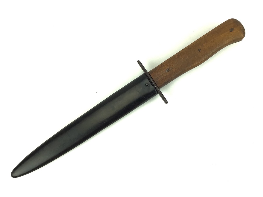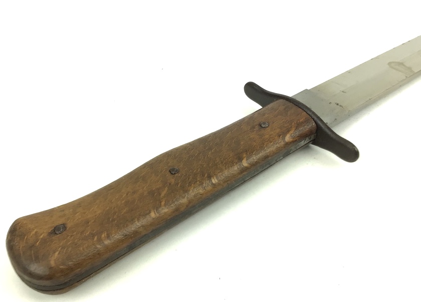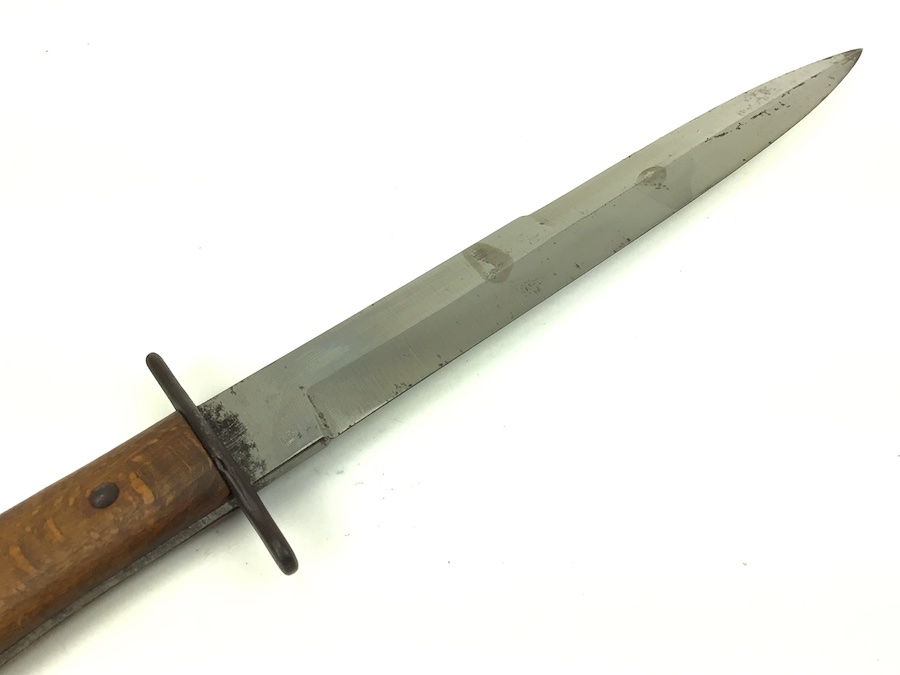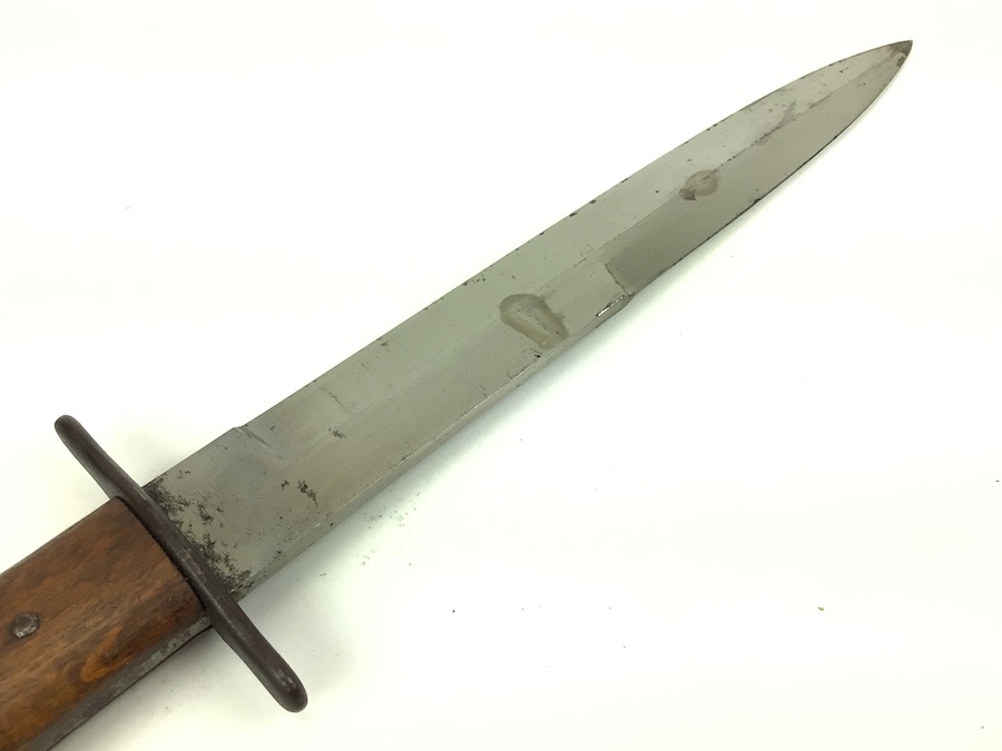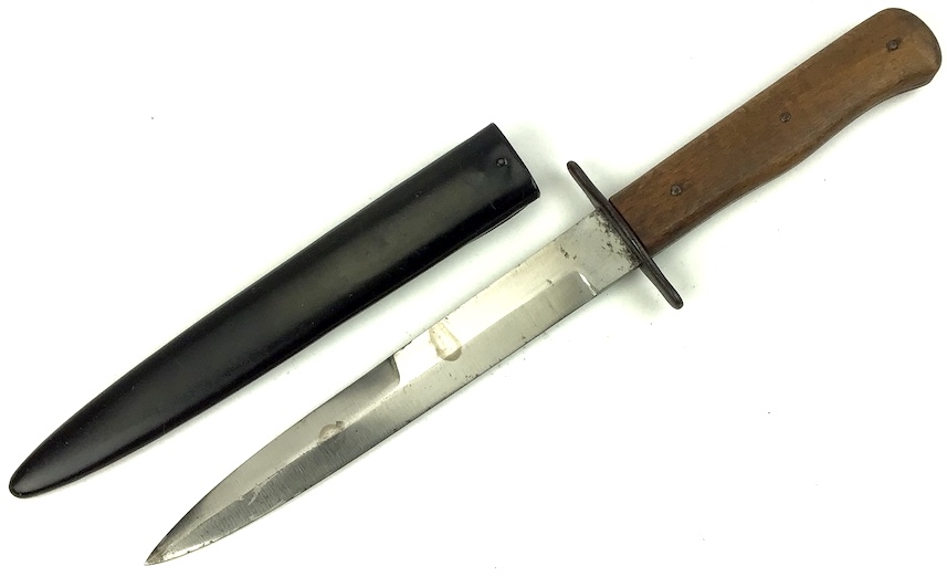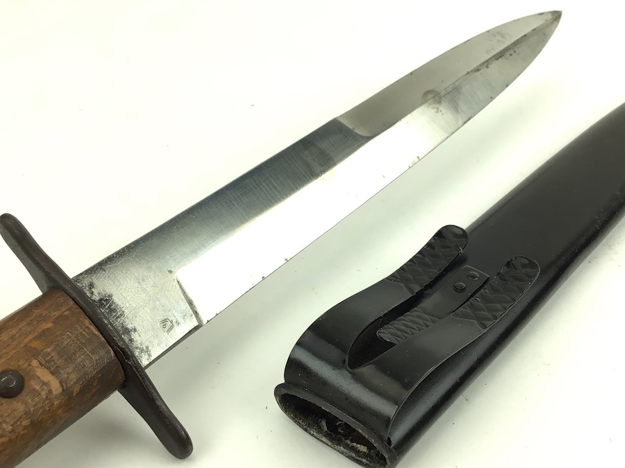 8/5/21 – This is an original WW2 era German Luftwaffe Boot Knife. The knife is 11.5 inches in total length (when in scabbard). The blade is 6.75 inches and in good shape. No evidence of sharpening. Some minor wear and surface marks, but this is normal aging and use wear. The base of the blade is droop winged eagle / 6 proofed. There are no other markings. The wood handle is in great shape, as well as the scabbard.