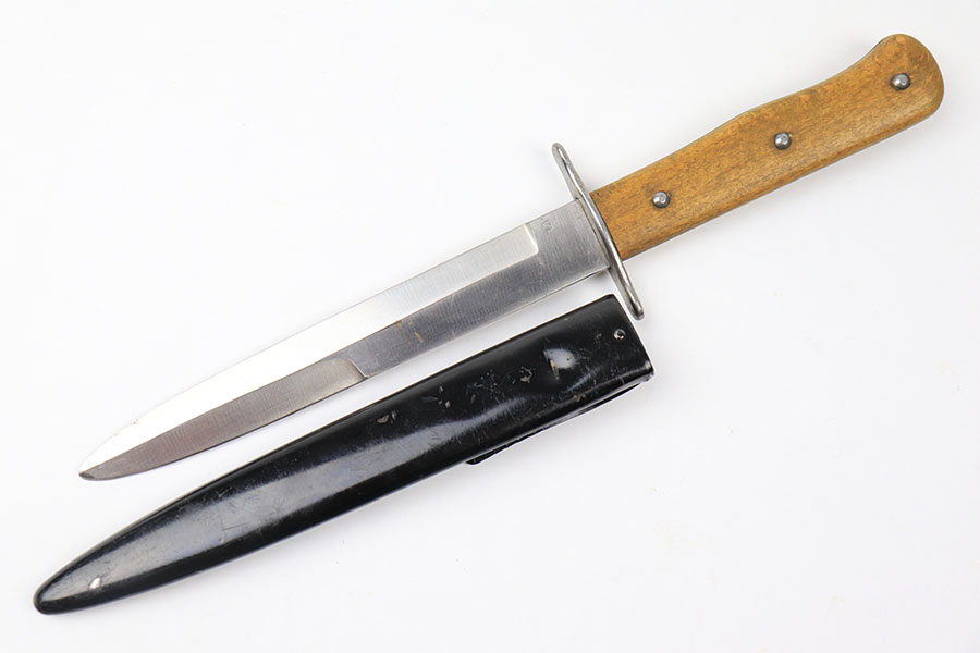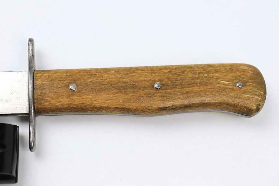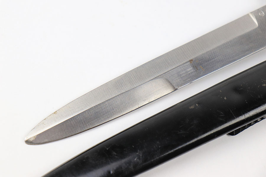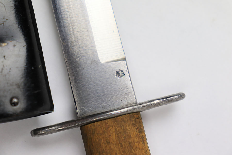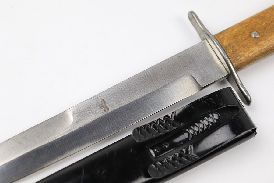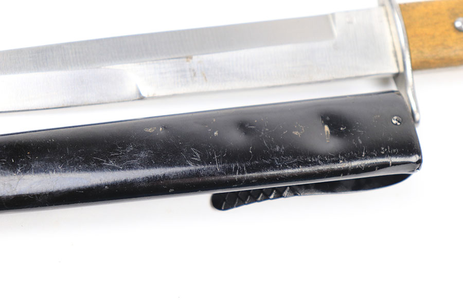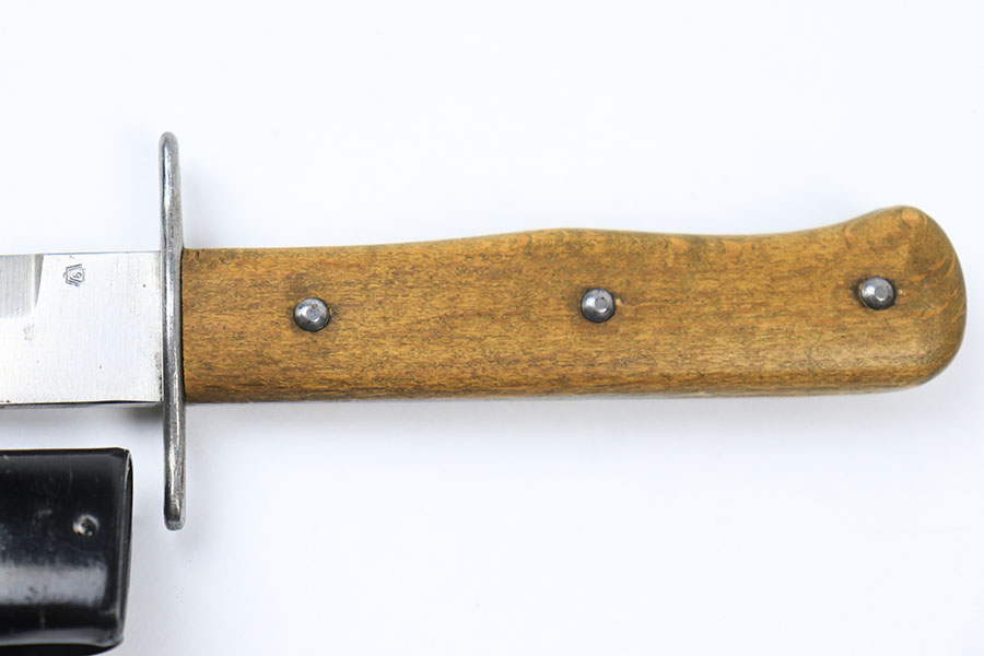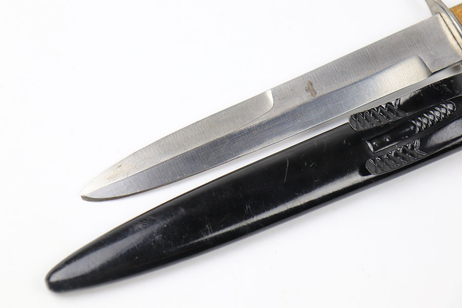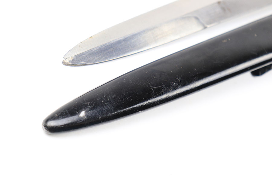 8/16/21 – This is an original Luftwaffe Boot Knife from WW2. The knife is in great overall condition with a very clean blade. The blade has an eagle 6 Luftwaffe proof stamp and no other markings. The tip of the blade appears to have some mild sharpening from previous use. There’s excellent cross graining on the blade. The wood handle has no cracks or chips. Despite a few minor dents in the scabbard, the overall condition is great as well with most of the black paint in tact.