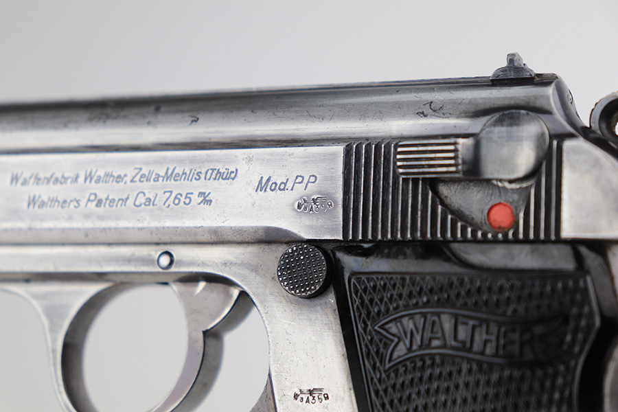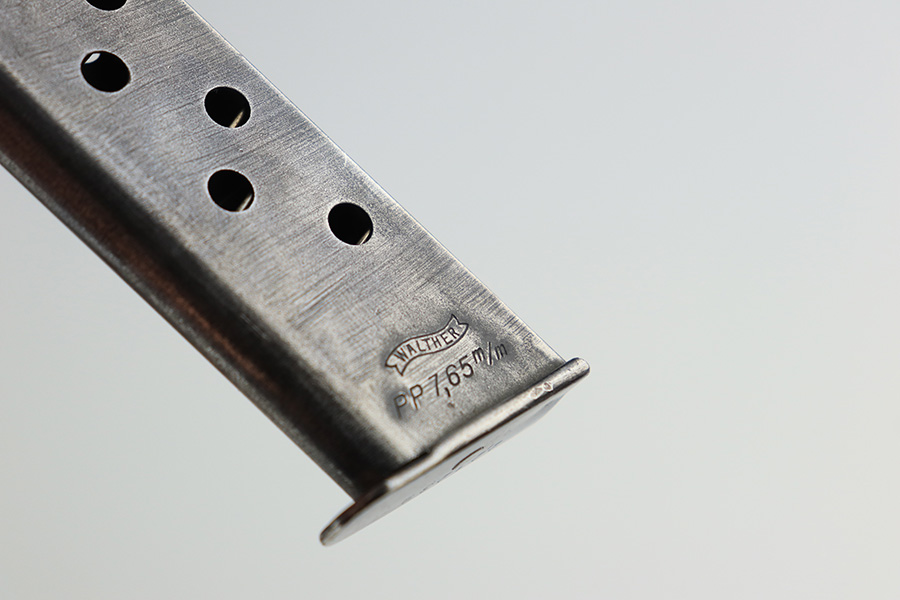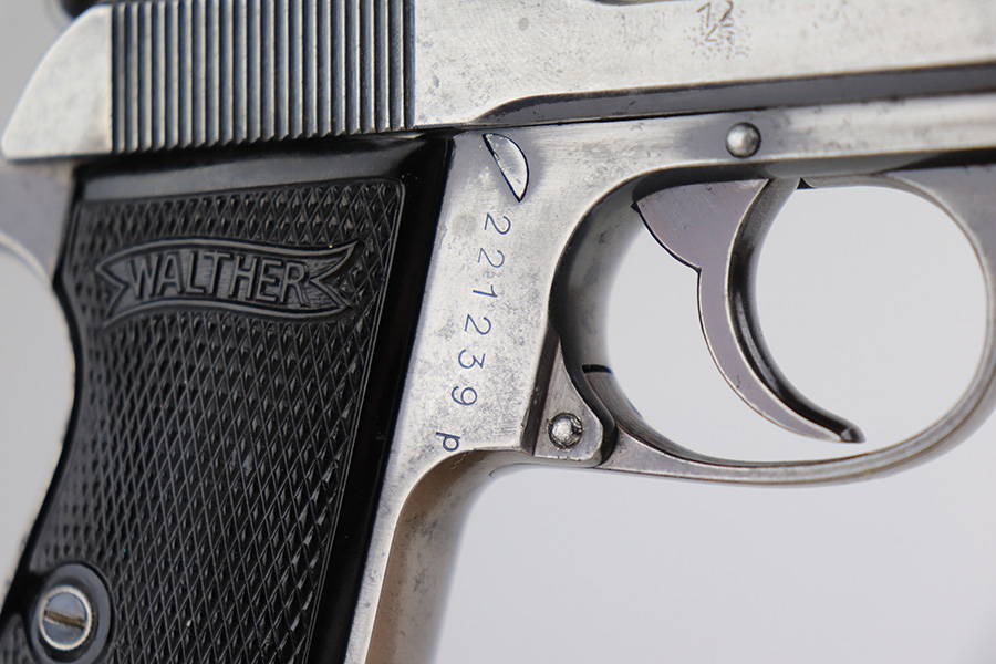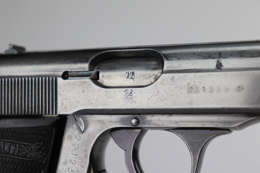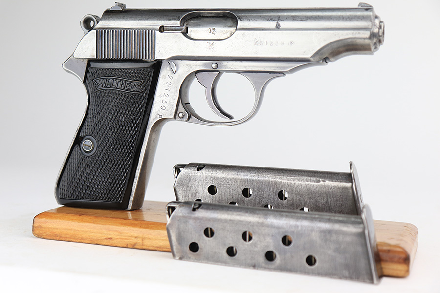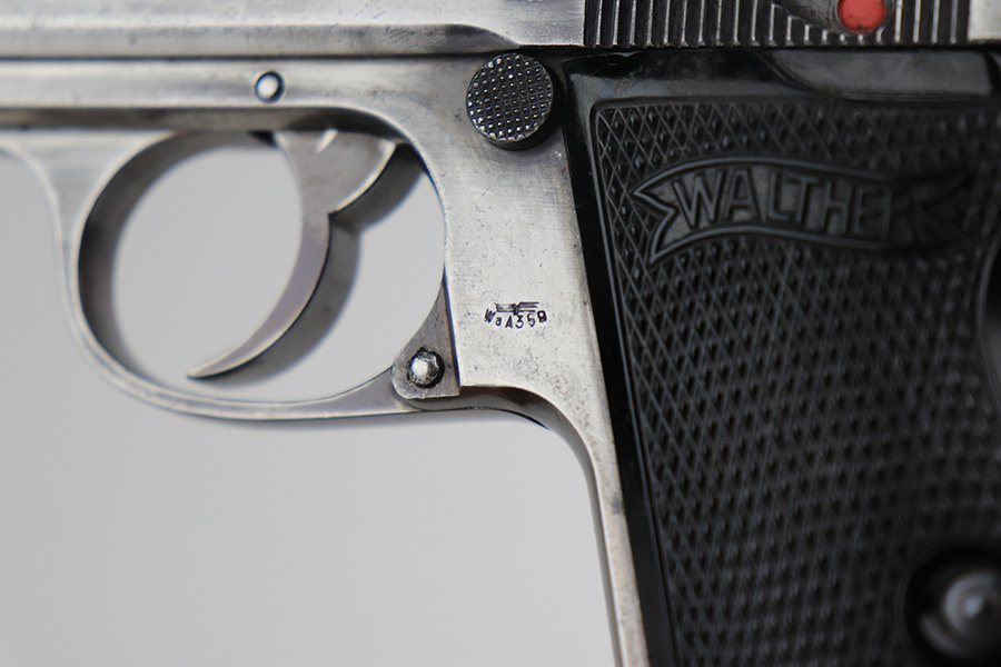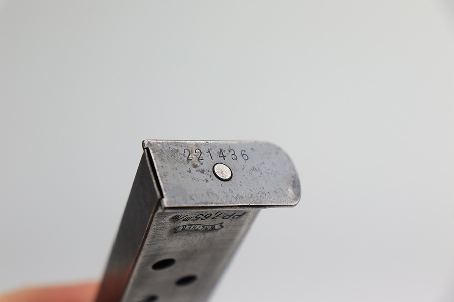 3/10/22 – This is a nice example of a Walther PP that issued to the Luftwaffe in 1941. The gun is all matching, has the proper “Waffen 359” Nazi military acceptance proofs on the slide and frame, and is in the correct serial number range for a Luftwaffe-issued gun. It comes with one original matching-numbered magazine and another magazine that is not matching but is very close (also in the Luftwaffe serial range). The gun has lost virtually all of its original bluing. There are tiny dots of oxidation here and there, most noticeable around the muzzle. Comes with nice period-correct black bakelite grips. Mint bore.