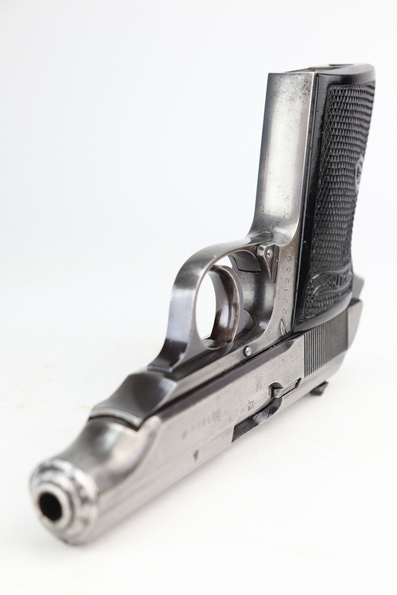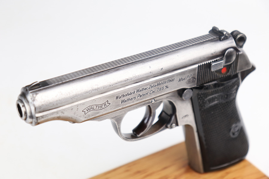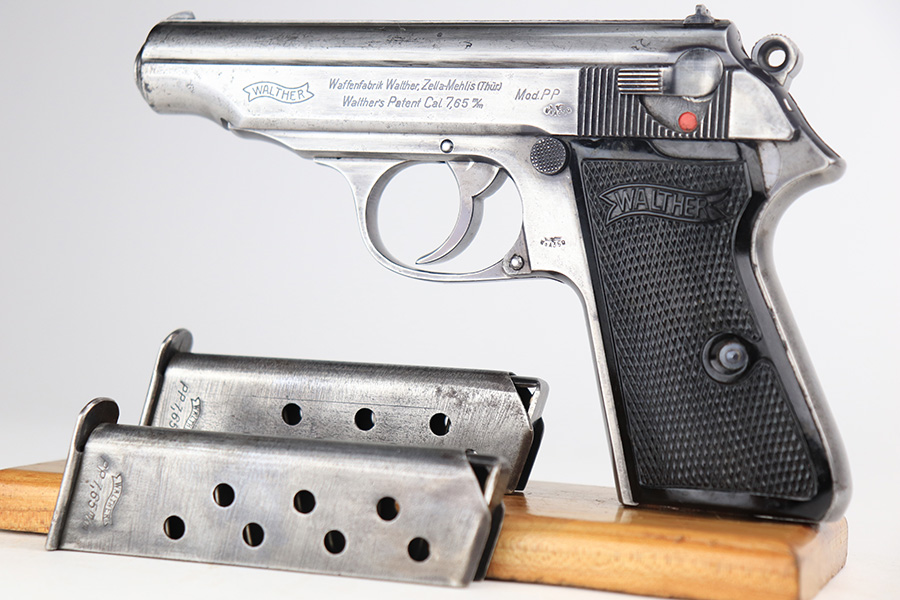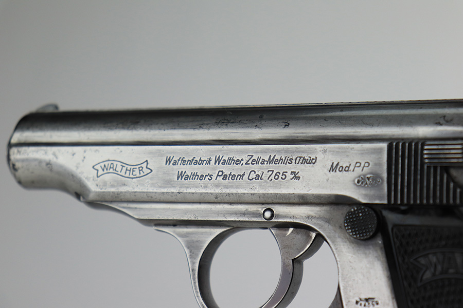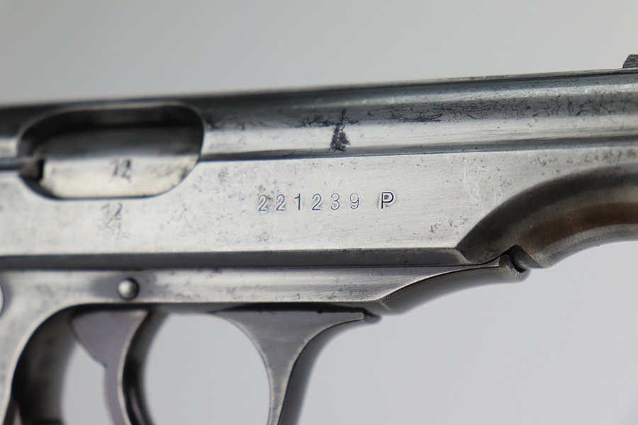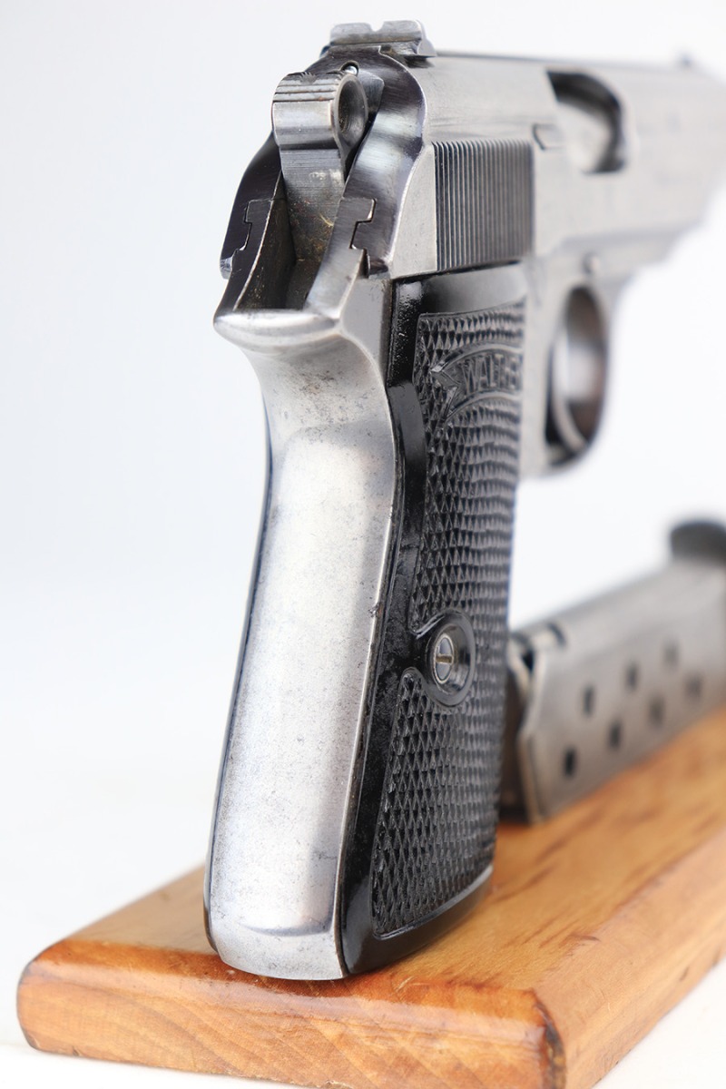 3/10/22 – This is a nice example of a Walther PP that issued to the Luftwaffe in 1941. The gun is all matching, has the proper “Waffen 359” Nazi military acceptance proofs on the slide and frame, and is in the correct serial number range for a Luftwaffe-issued gun. It comes with one original matching-numbered magazine and another magazine that is not matching but is very close (also in the Luftwaffe serial range). The gun has lost virtually all of its original bluing. There are tiny dots of oxidation here and there, most noticeable around the muzzle. Comes with nice period-correct black bakelite grips. Mint bore.