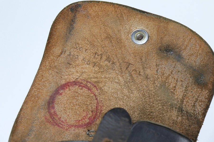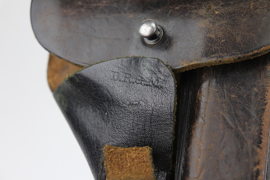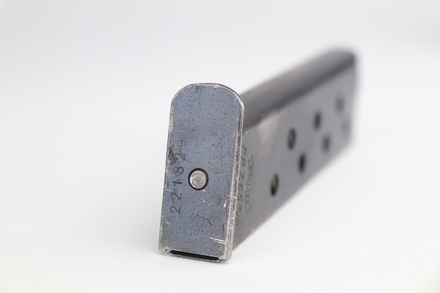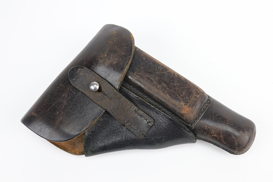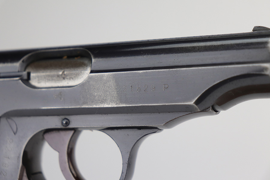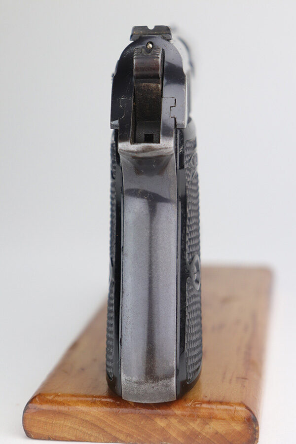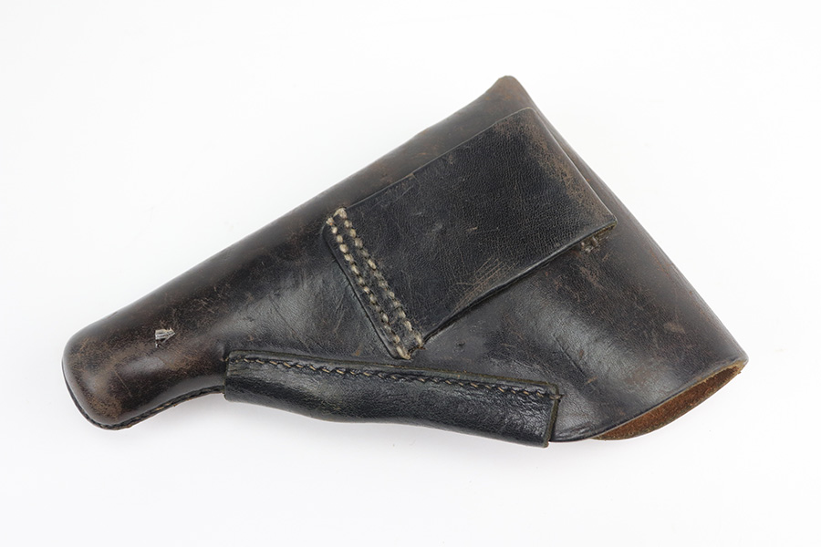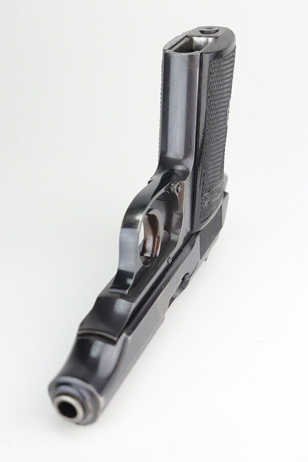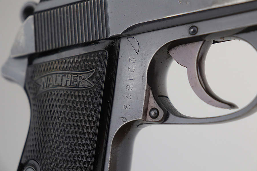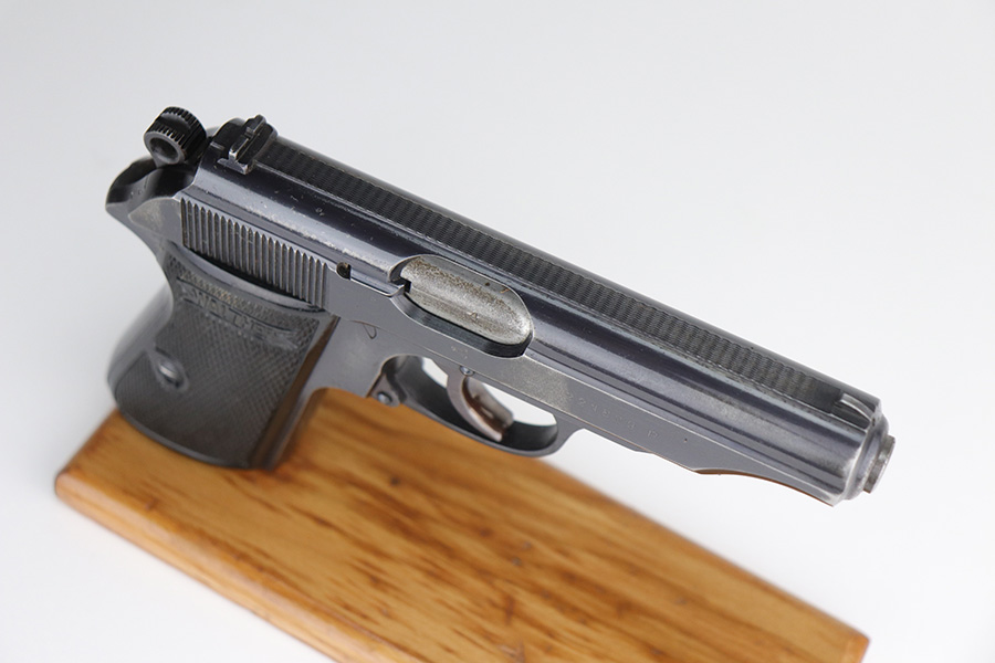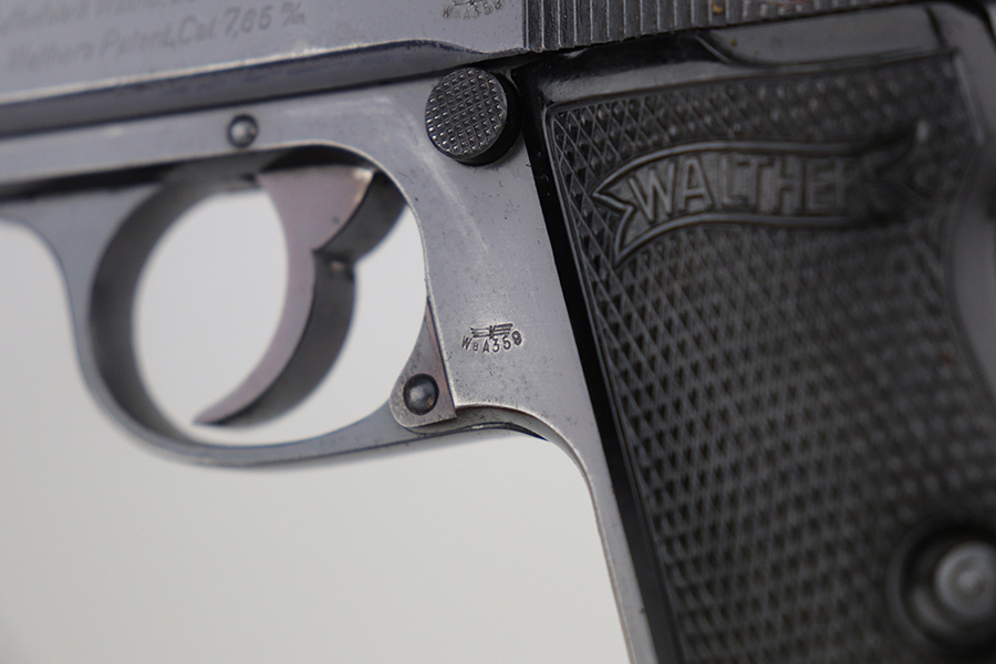 11/23/21 – This is a very nice example of a Walther PP issued to the Luftwaffe in 1941. It is all matching, has the proper “Waffen 359” Nazi military acceptance proofs on the frame and slide, and comes with one original matching-numbered magazine. It comes as a rig with a nice period-correct Akah holster. It has retained about 90% of its original high polish finish. There is minor wear on the high edges of the slide and around the muzzle. There are also areas of wear on the underside of the trigger guard, at the base of the back strap, on the right side of the slide, right side of the frame, right rear of the slide, and on the round edges of the slide. Some very minor freckling on the grip straps. Comes with excellent period-correct grips. Mint bore.