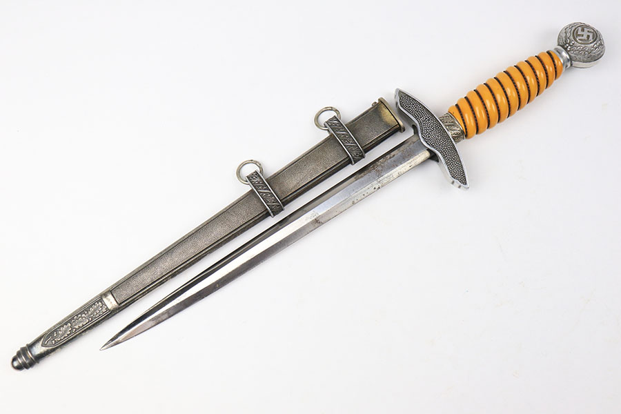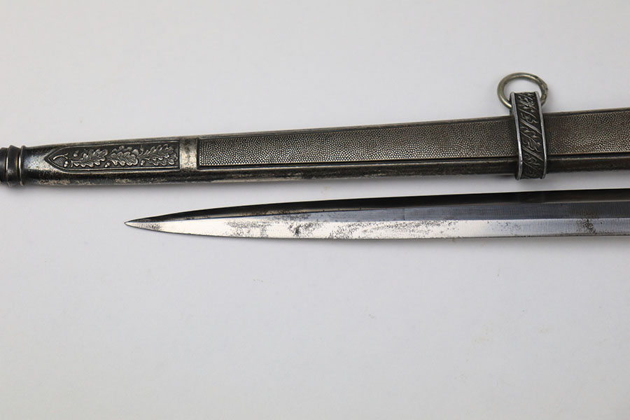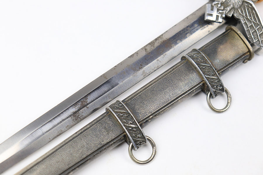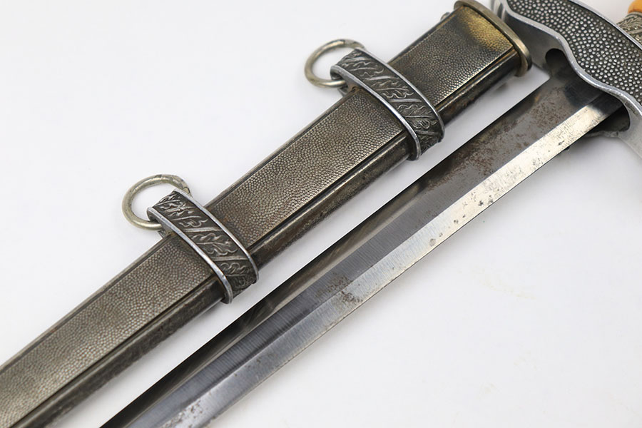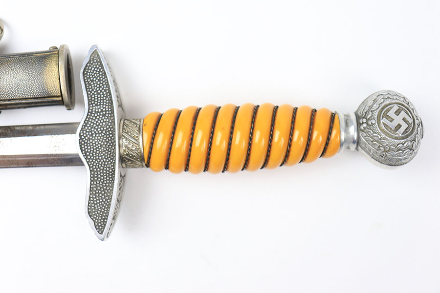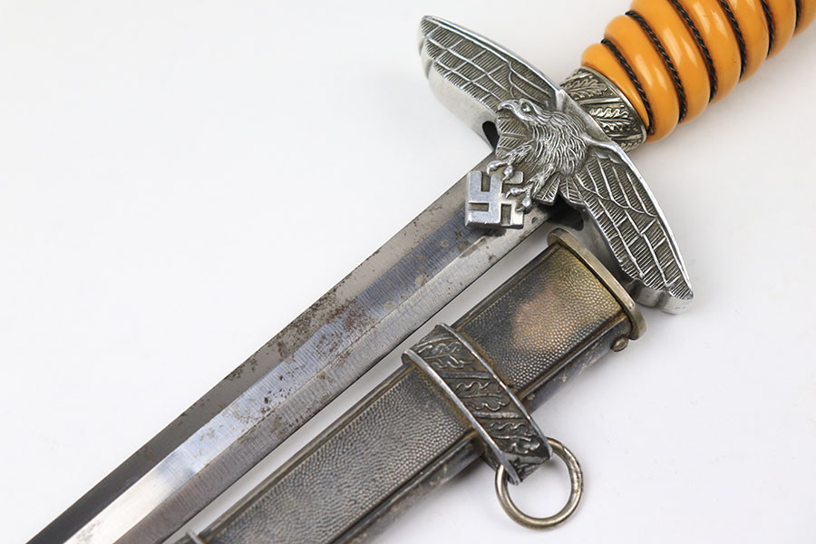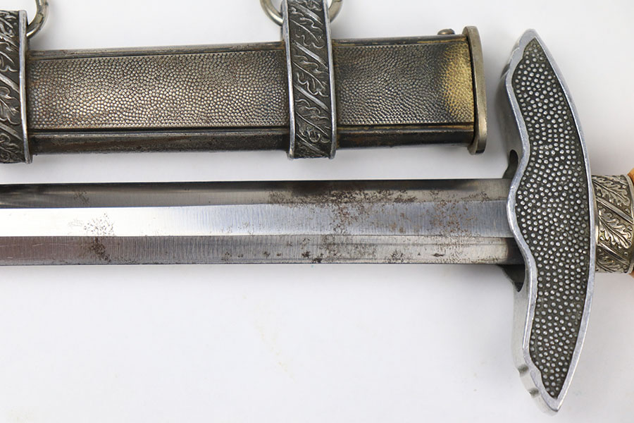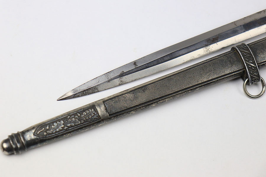 8/10/21 – This is an original Luftwaffe dagger from WW2. The dagger is in good overall condition with some light spotty surface oxidation throughout the blade. There is no maker stamp, but there’s excellent cross graining. The hand guard and pommel have some light patina but are generally in great shape. There are no cracks or chips in the bakelite handle. There’s some mild discoloration on the scabbard, but no dents or major issues.