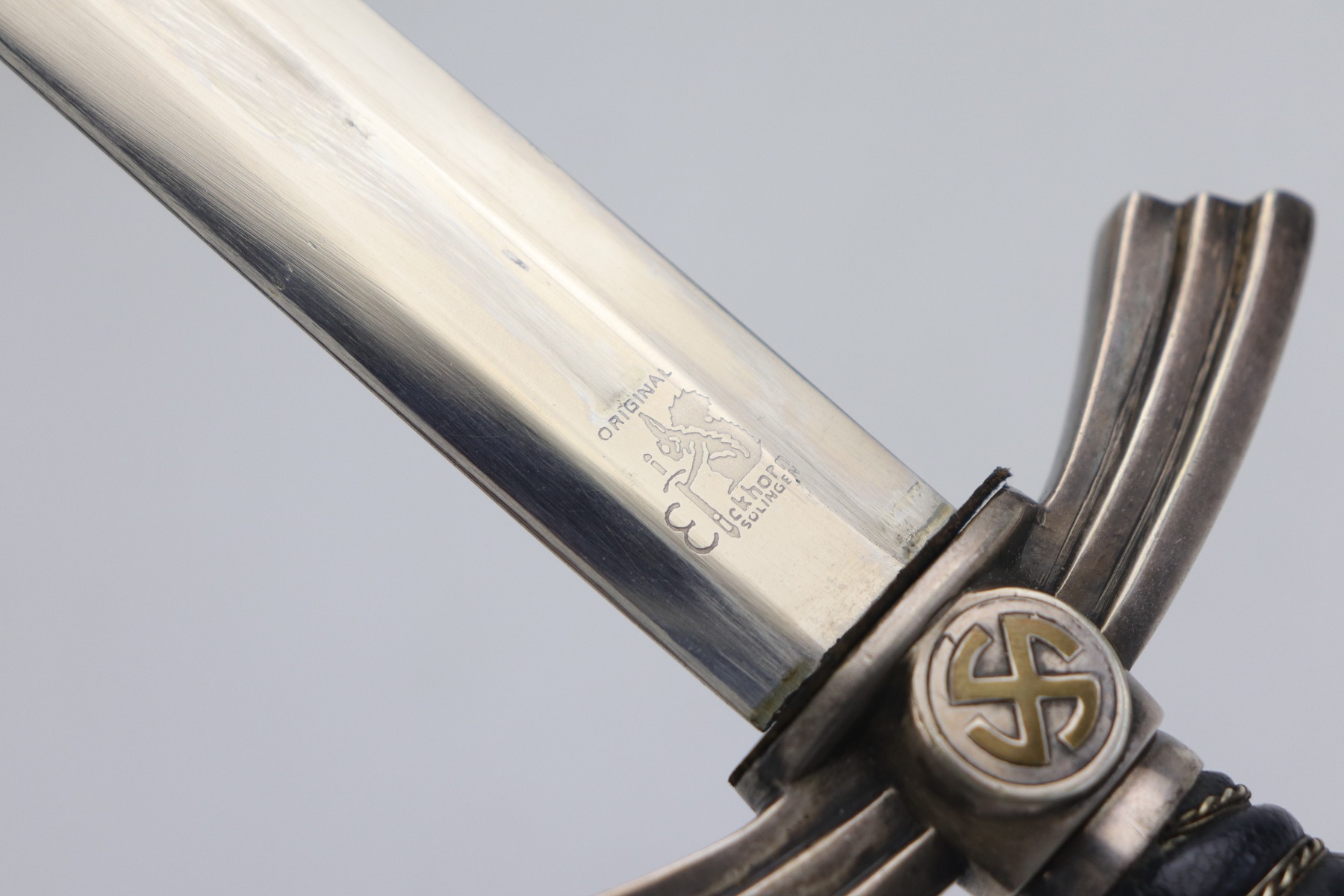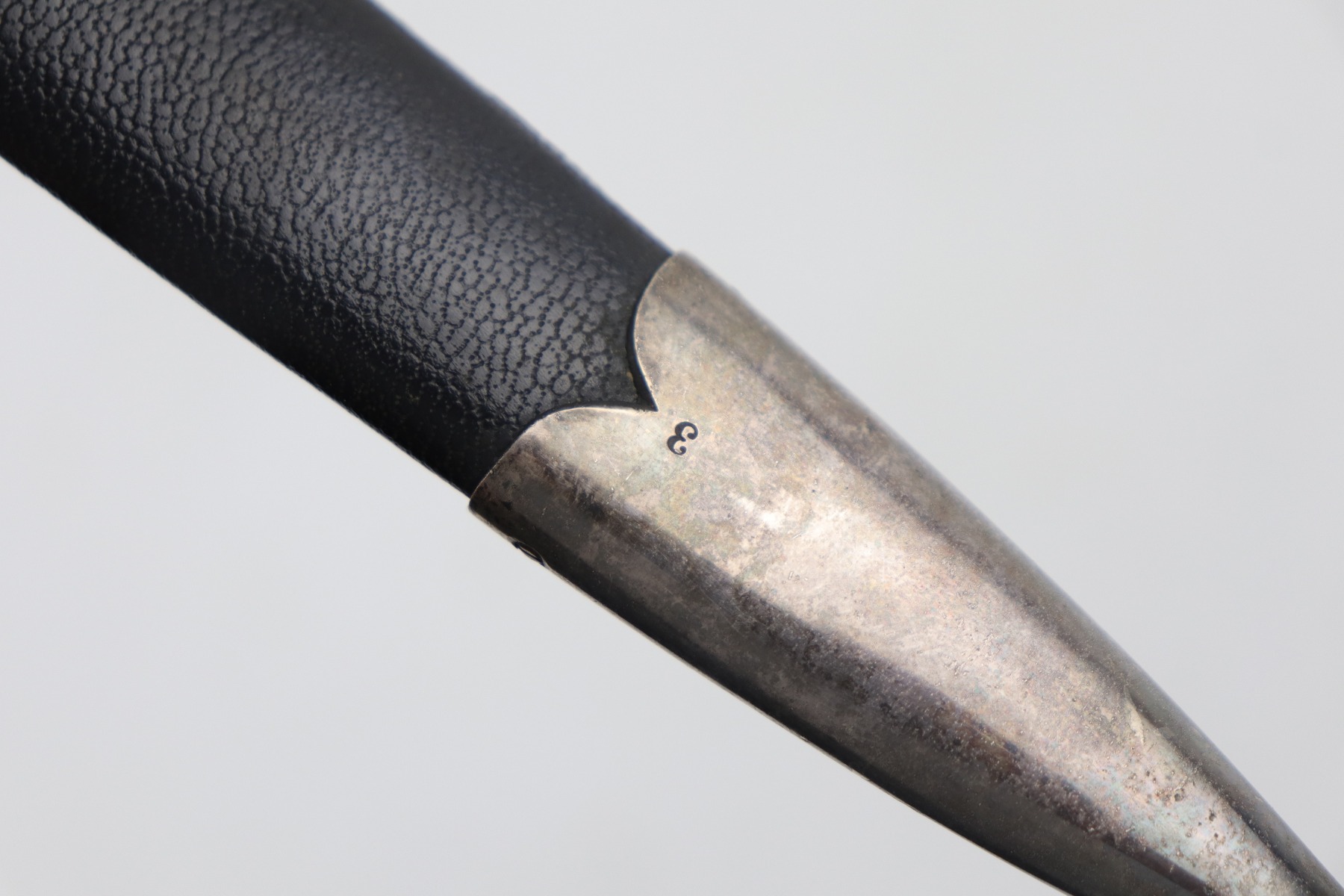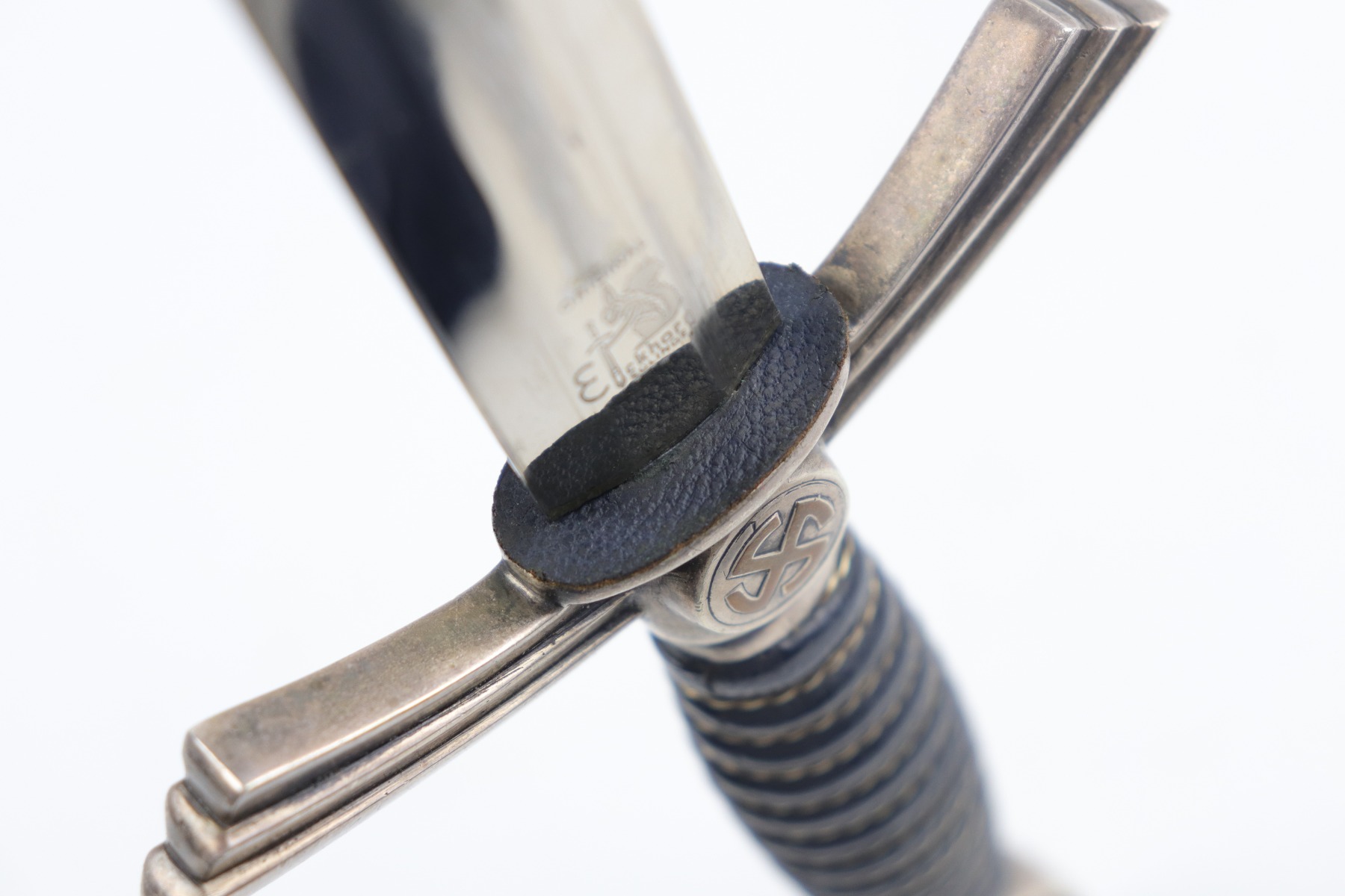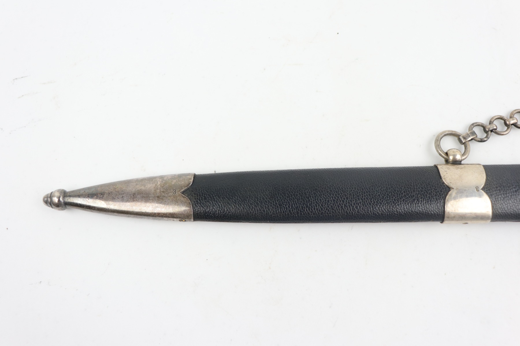 7/24/20 – This is an excellent 1st Model Luftwaffe issued dagger. The maker is Eickhorn. This early dagger has an unusual stamped “3” on each scabbard component. All parts of the dagger: wire-wrapped grip, scabbard leather, chain hanger, and brass swastikas are in excellent condition. The blade has a needle point and was never changed.