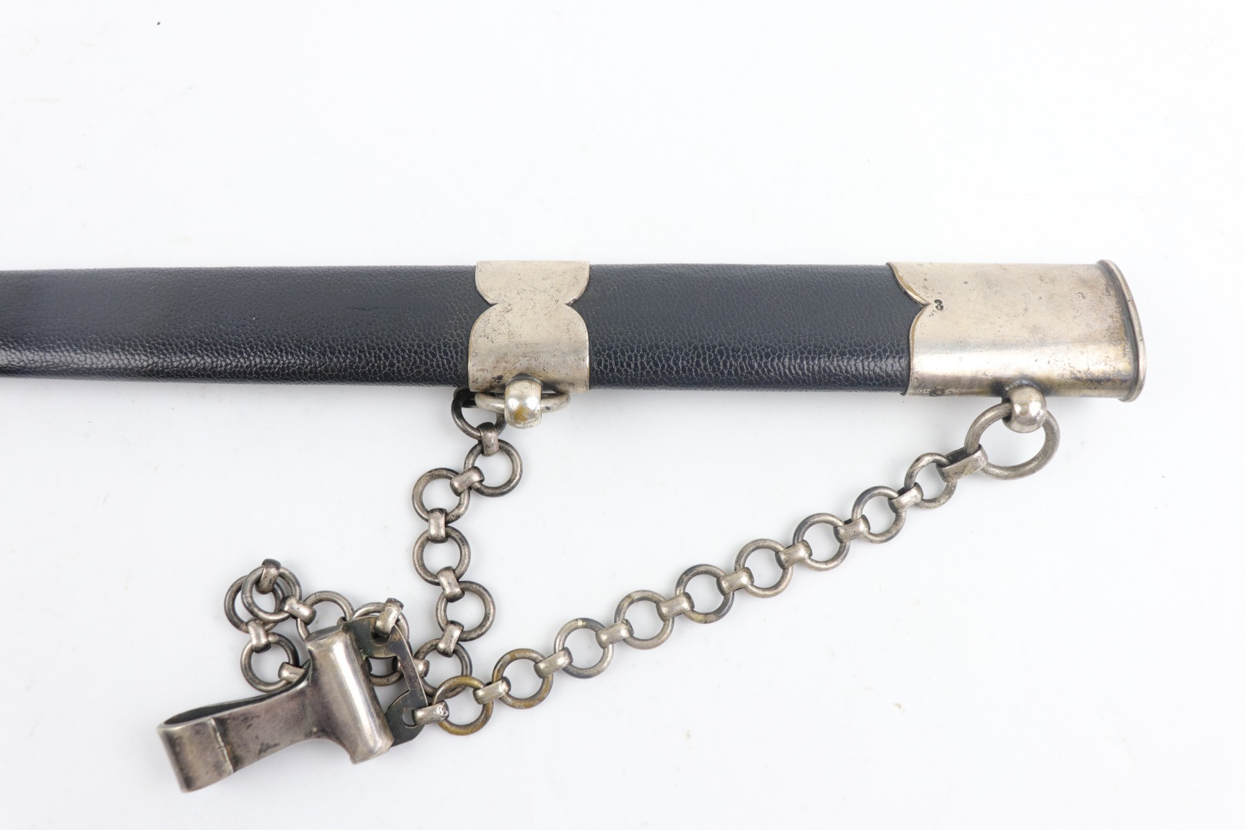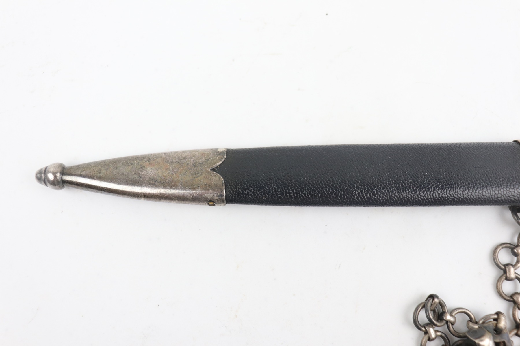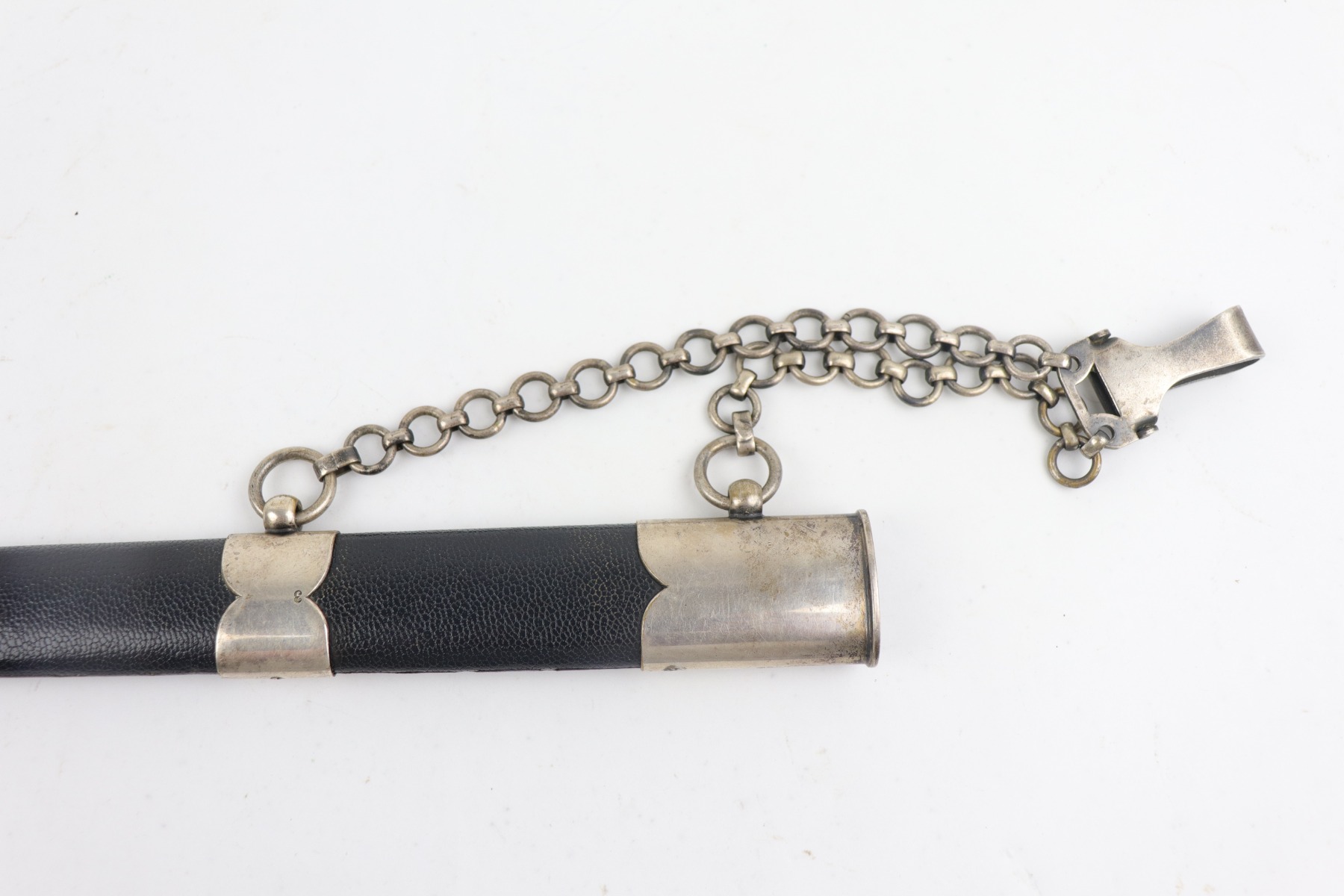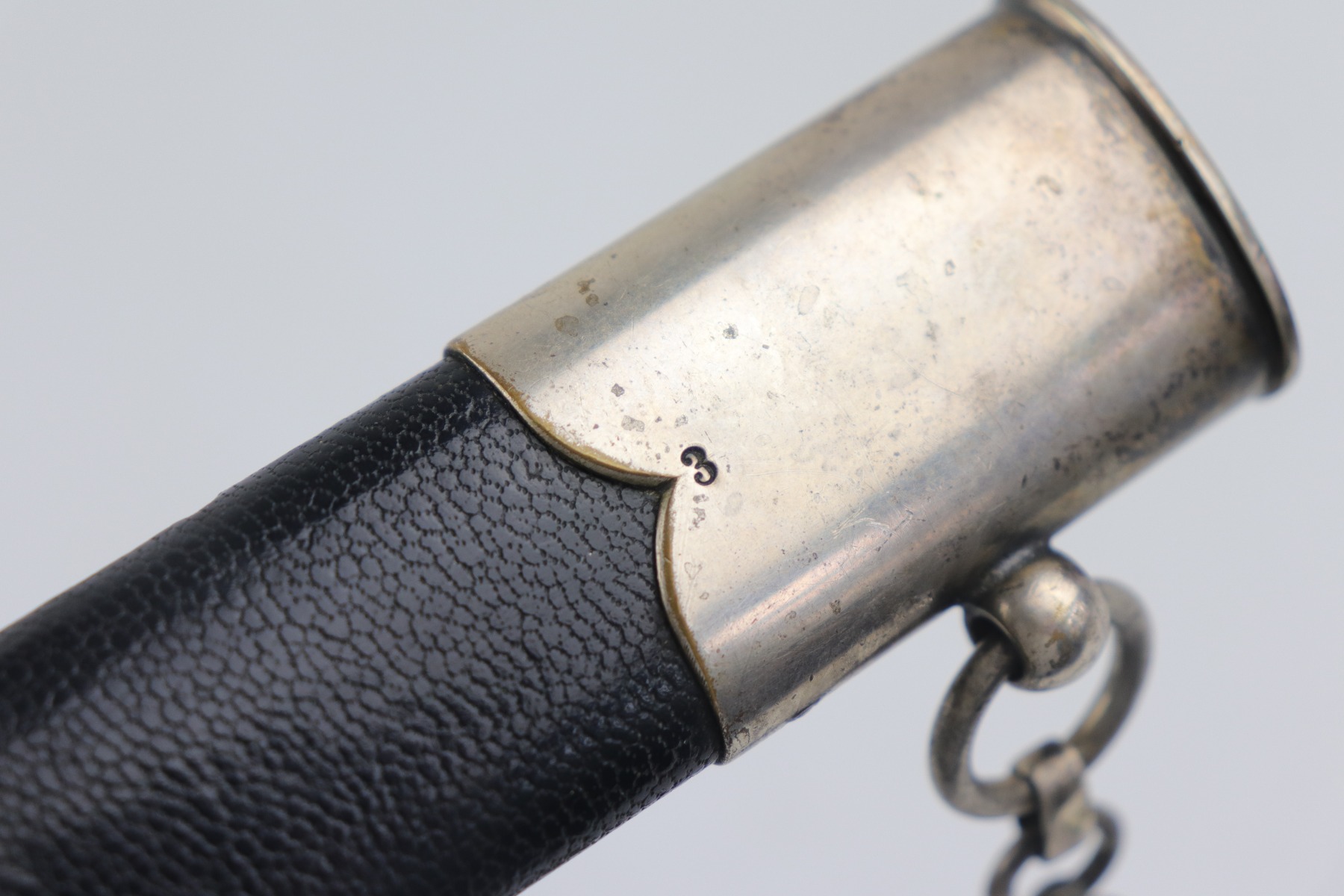7/24/20 – This is an excellent 1st Model Luftwaffe issued dagger. The maker is Eickhorn. This early dagger has an unusual stamped “3” on each scabbard component. All parts of the dagger: wire-wrapped grip, scabbard leather, chain hanger, and brass swastikas are in excellent condition. The blade has a needle point and was never changed.