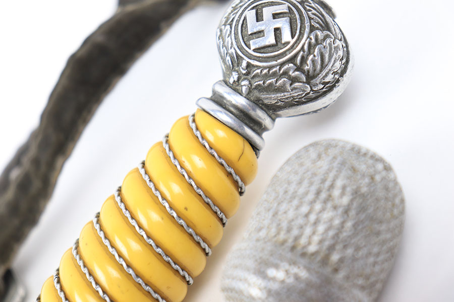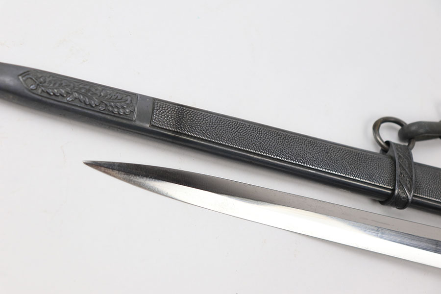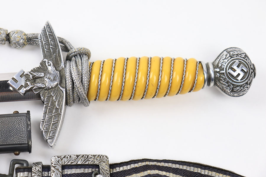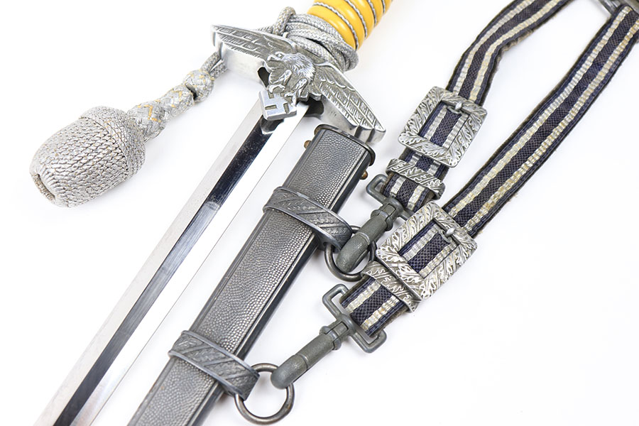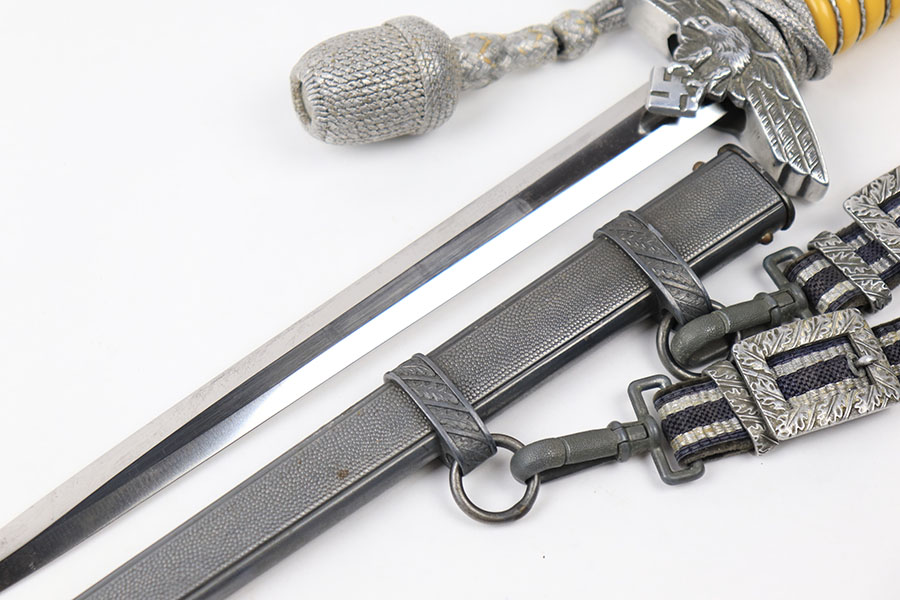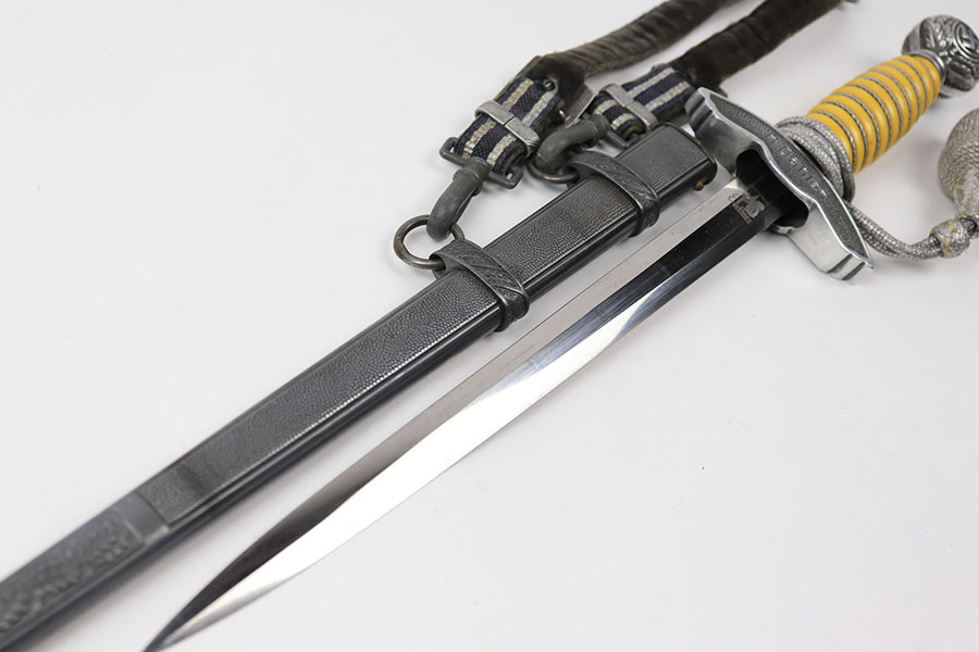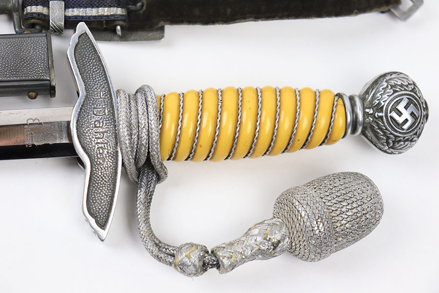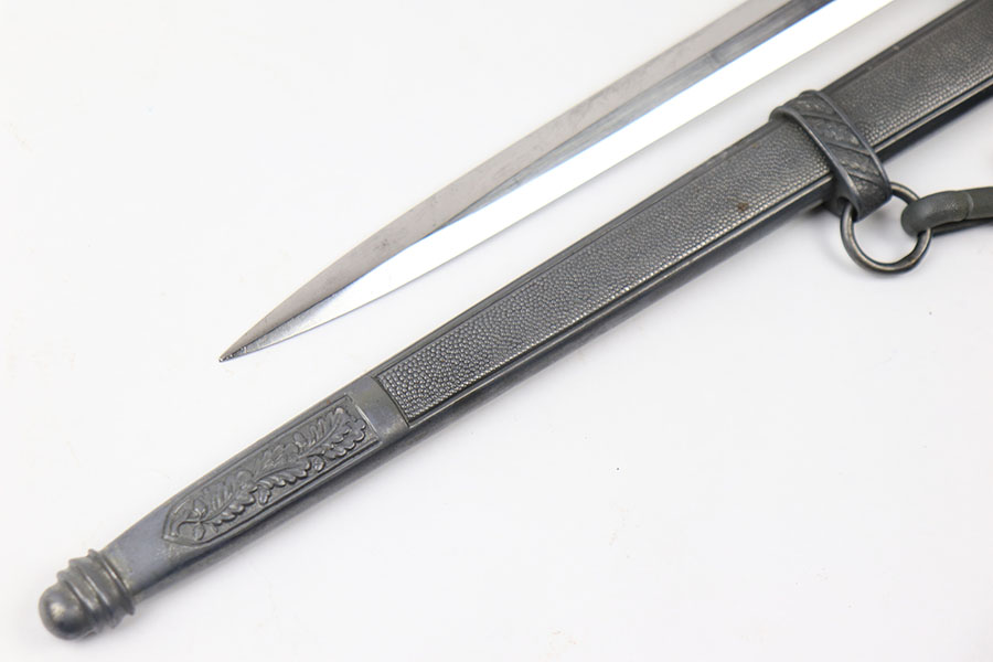 7/9/21 – This is an original Luftwaffe dagger, complete with portepee and hanger. The dagger is also named, a fairly rare feature found on the reverse of the hand guard. The blade is excellent and very clean with an Eickhorn maker stamp. The scabbard has no dents or issues. There are a few small chips in the grip – most namely at the top near the pommel. The portepee and hanger are excellent. A very nice collector’s dagger.