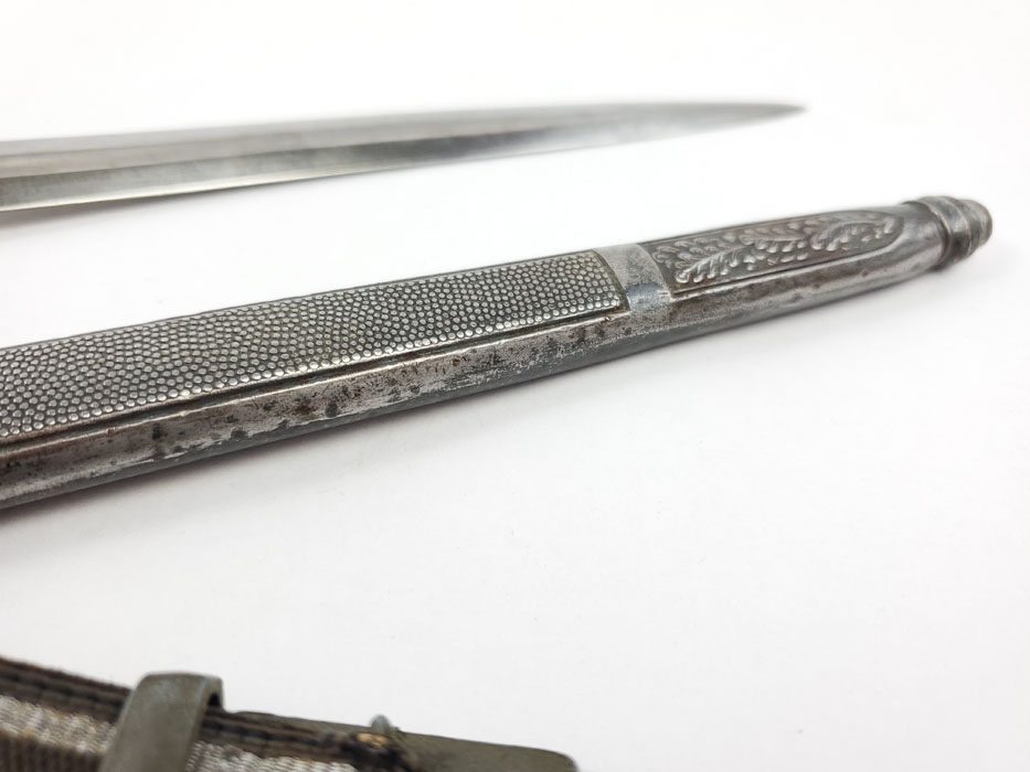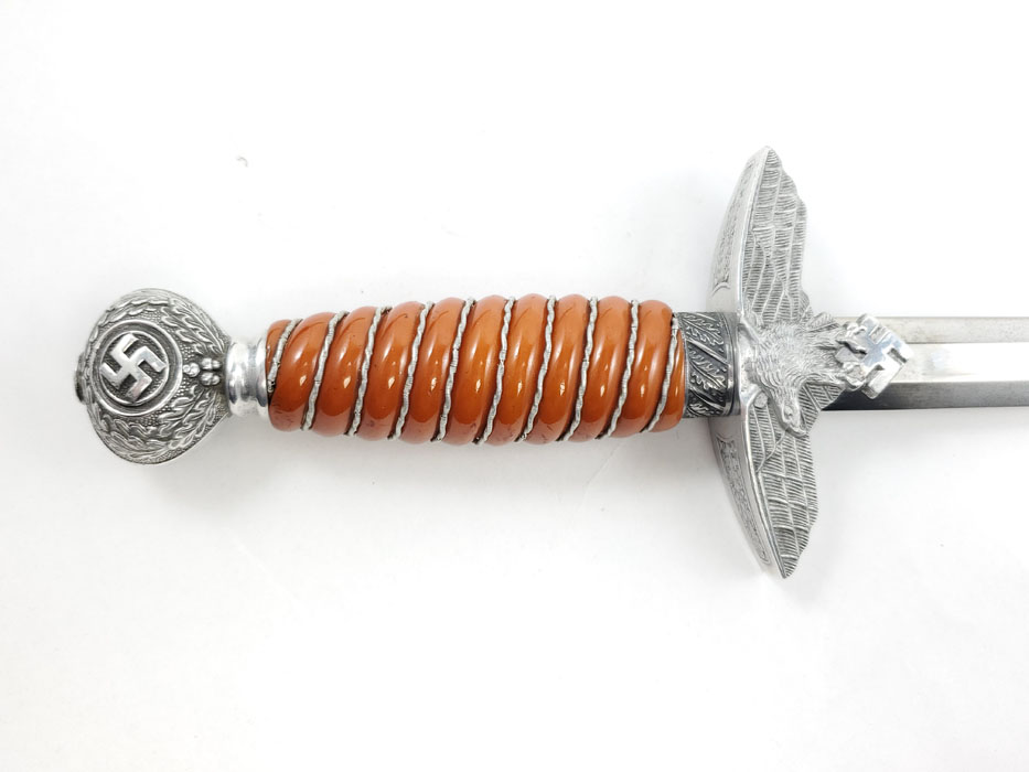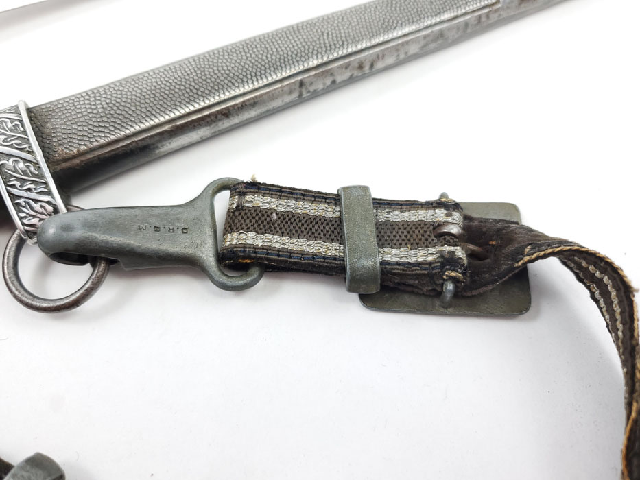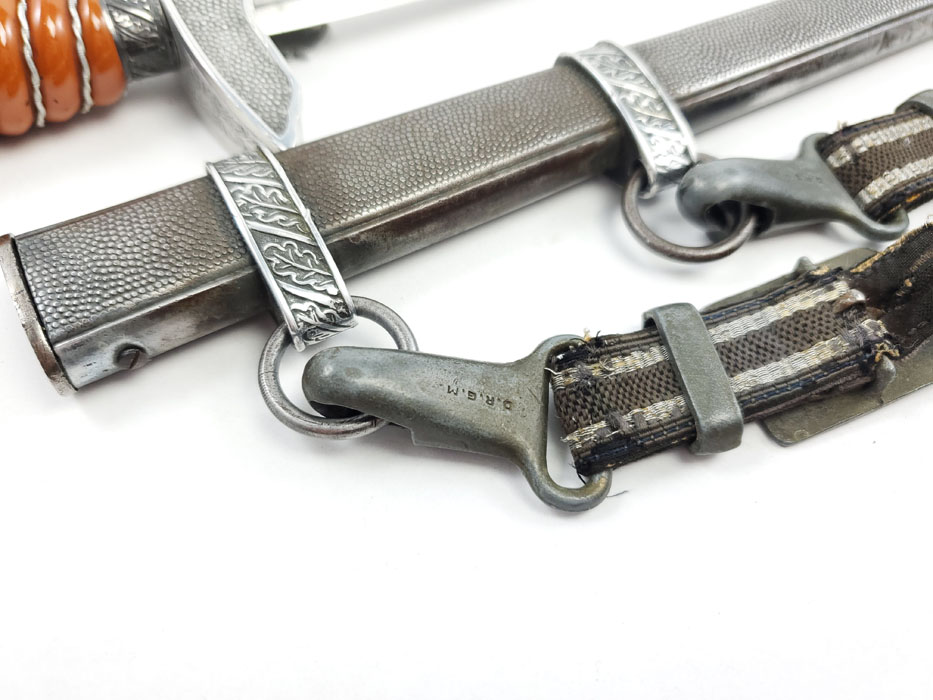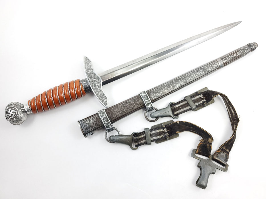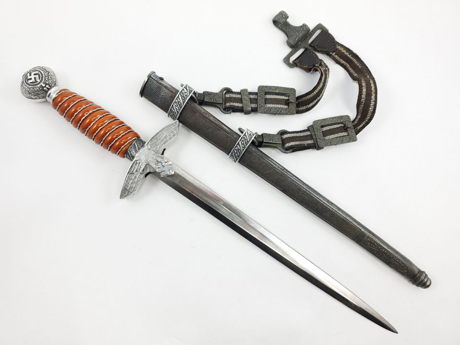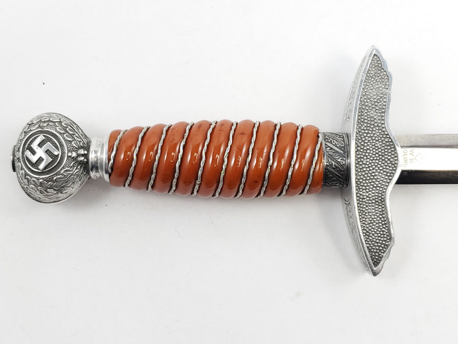 4/17/20 – This is an original Luftwaffe dagger from WW2, complete with the original scabbard and hanger. The dagger has a dark orange handle with tight wiring and no cracks or chips, only a few very small discolored scuffs. The blade has light oxidation throughout, which is mostly speckled gray spots, but they aren’t very dark. The reverse side of the blade is WKC maker stamped. The scabbard has no dents or major issues. The hanger has light fraying in a few areas but is completely in tact. Each clip is D.R.G.M. stamped, and there’s a RZM maker stamp on the hanger-end, with U.E. 10 stamped as well – see photos. The hanger-end doesn’t stay shut on its’ own.