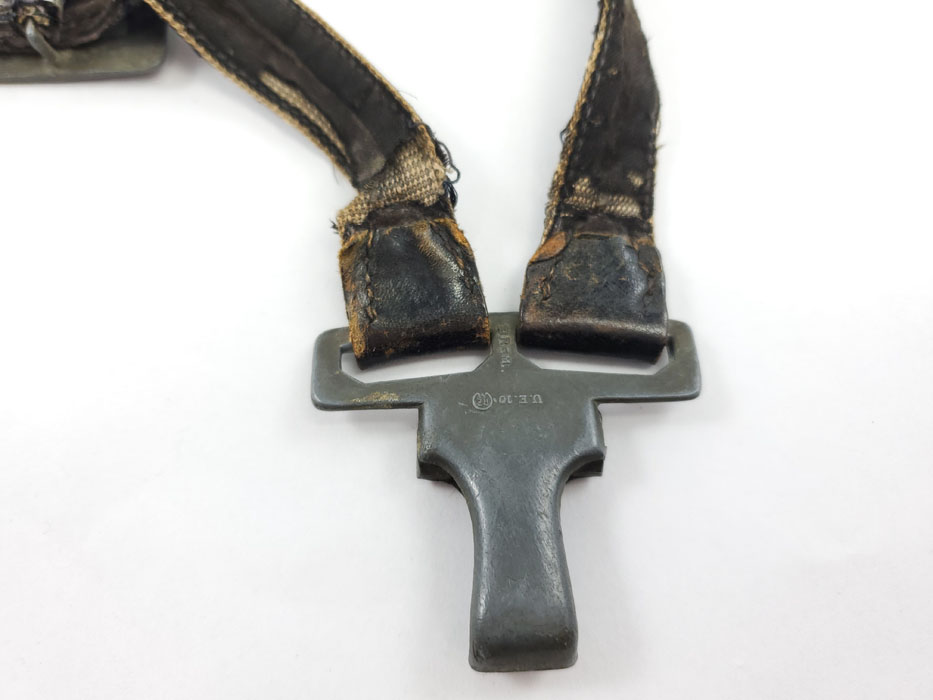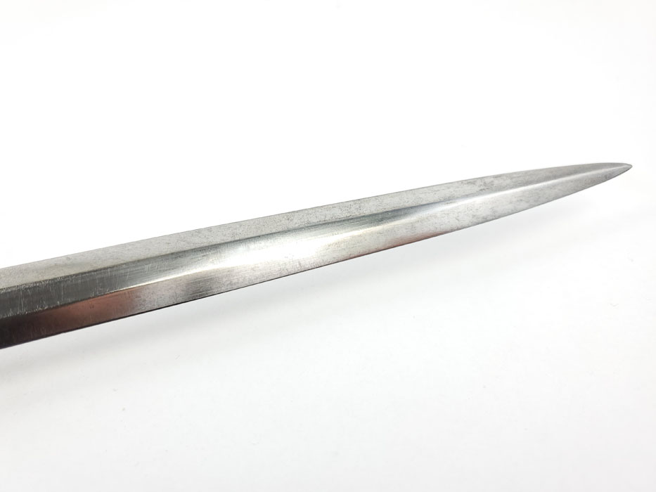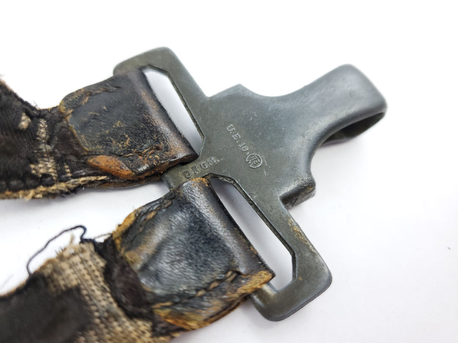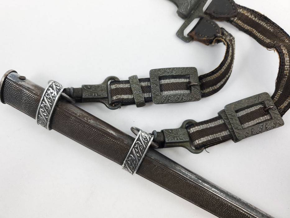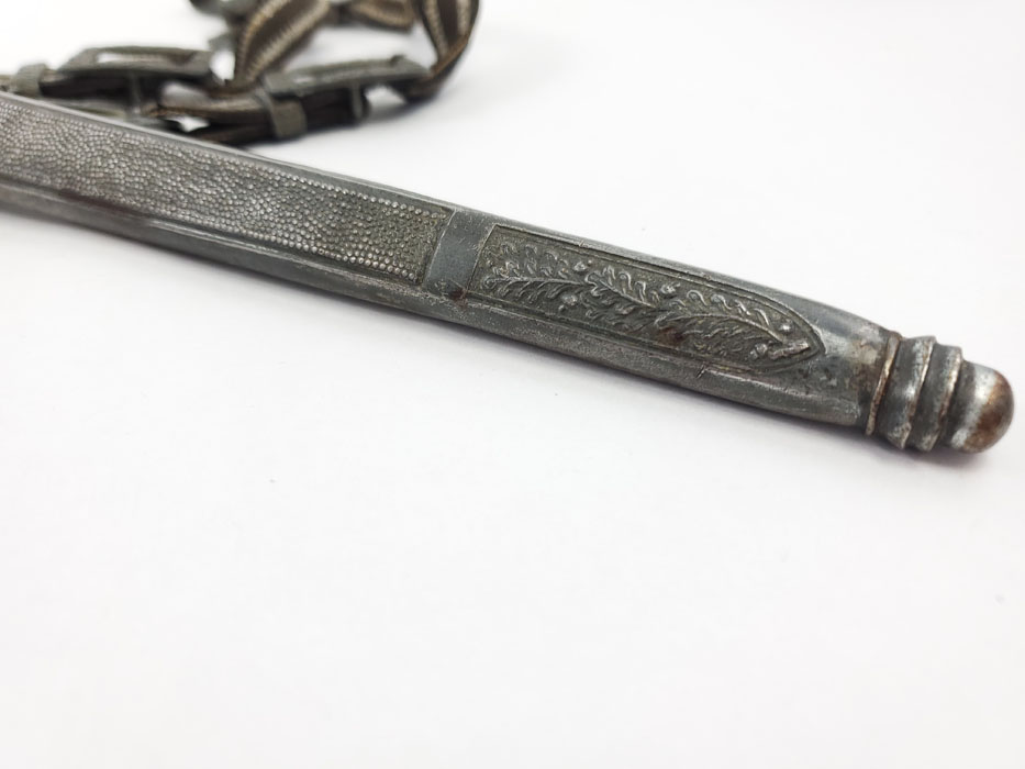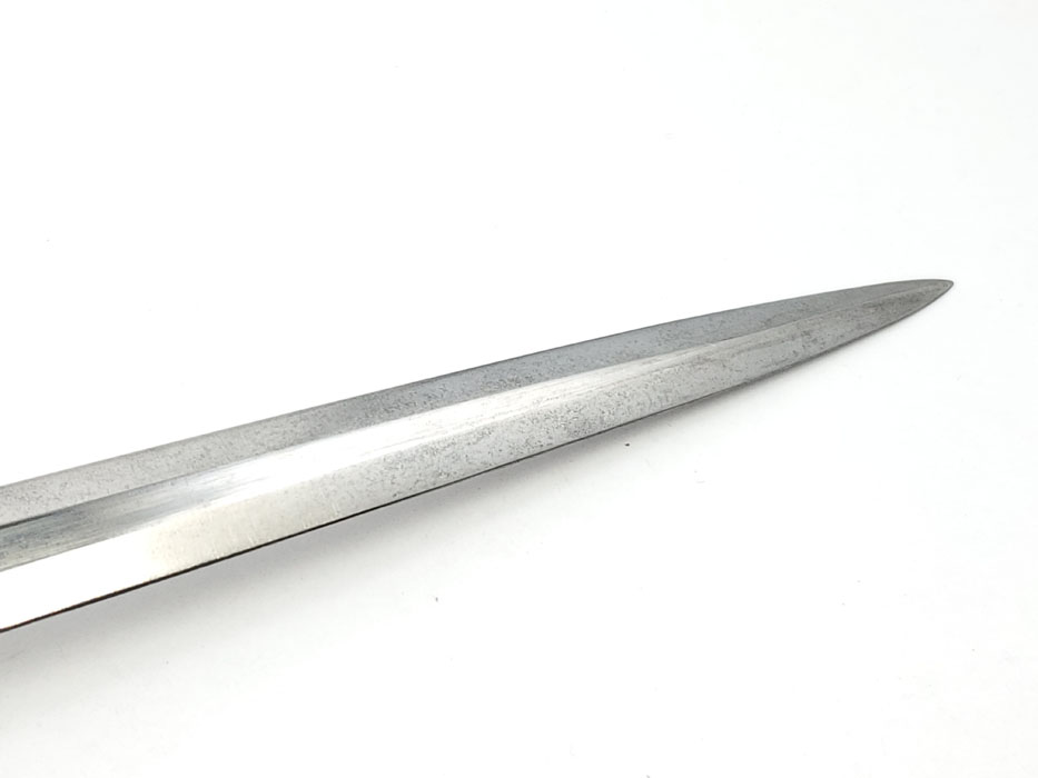 4/17/20 – This is an original Luftwaffe dagger from WW2, complete with the original scabbard and hanger. The dagger has a dark orange handle with tight wiring and no cracks or chips, only a few very small discolored scuffs. The blade has light oxidation throughout, which is mostly speckled gray spots, but they aren’t very dark. The reverse side of the blade is WKC maker stamped. The scabbard has no dents or major issues. The hanger has light fraying in a few areas but is completely in tact. Each clip is D.R.G.M. stamped, and there’s a RZM maker stamp on the hanger-end, with U.E. 10 stamped as well – see photos. The hanger-end doesn’t stay shut on its’ own.