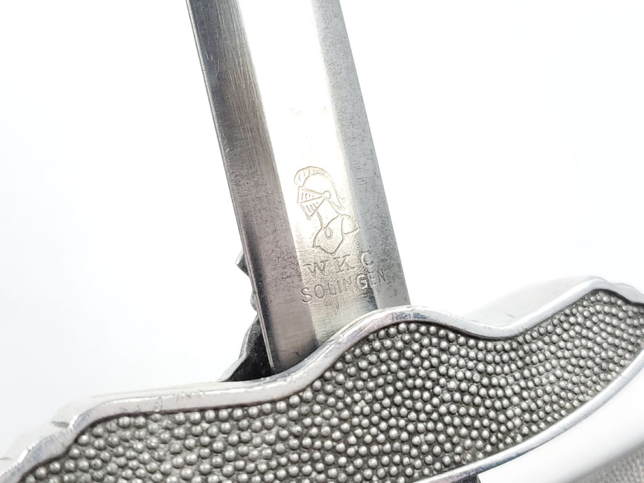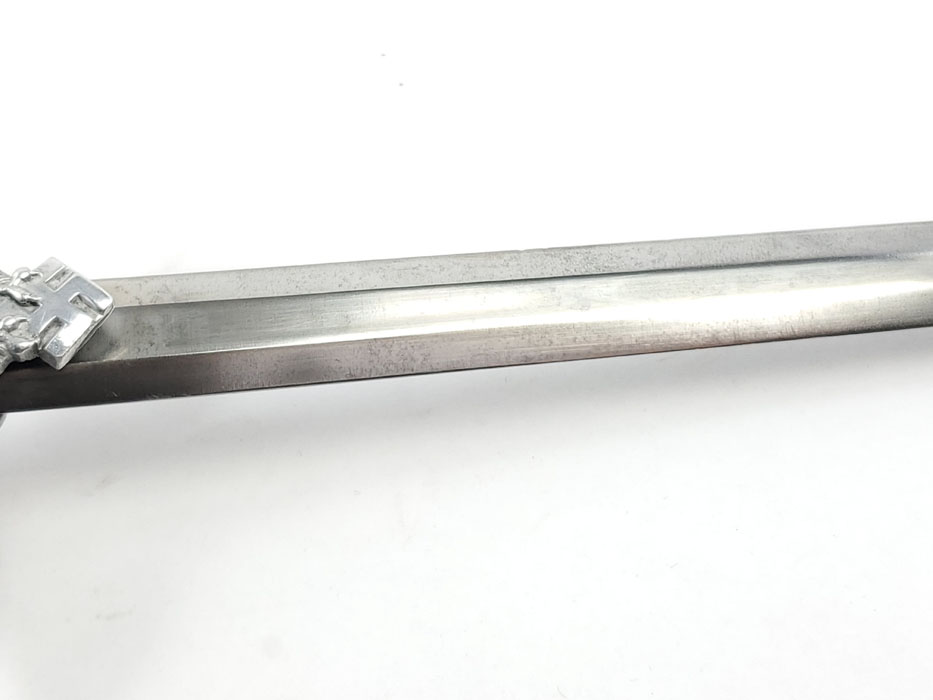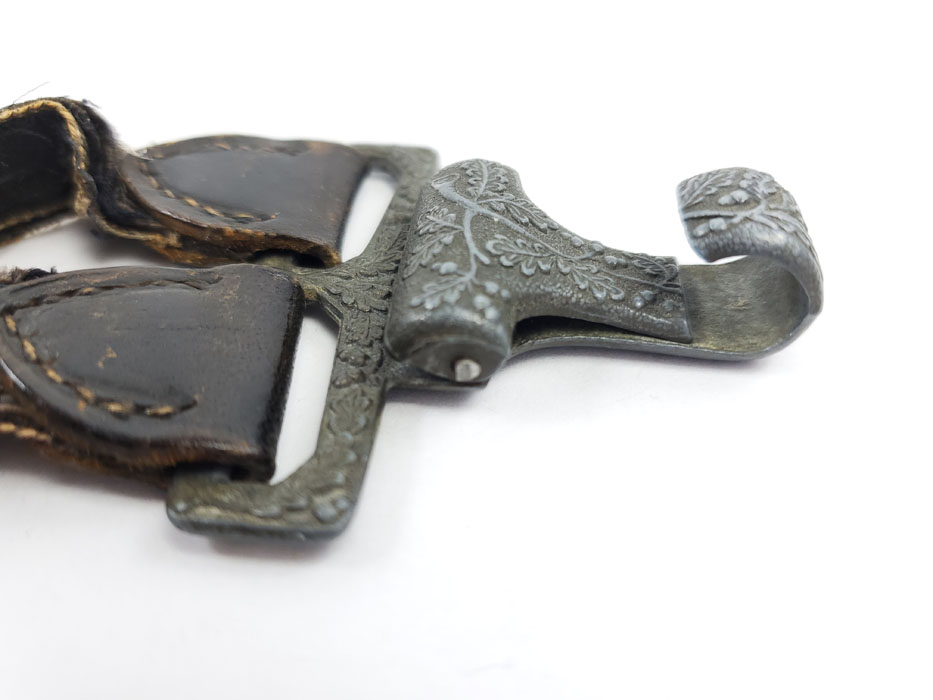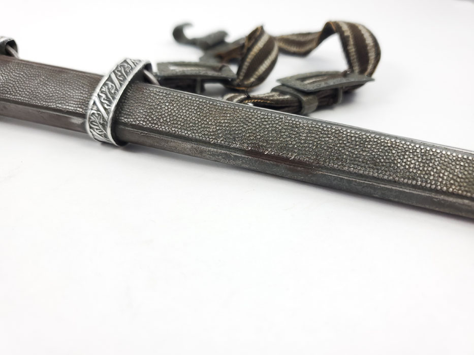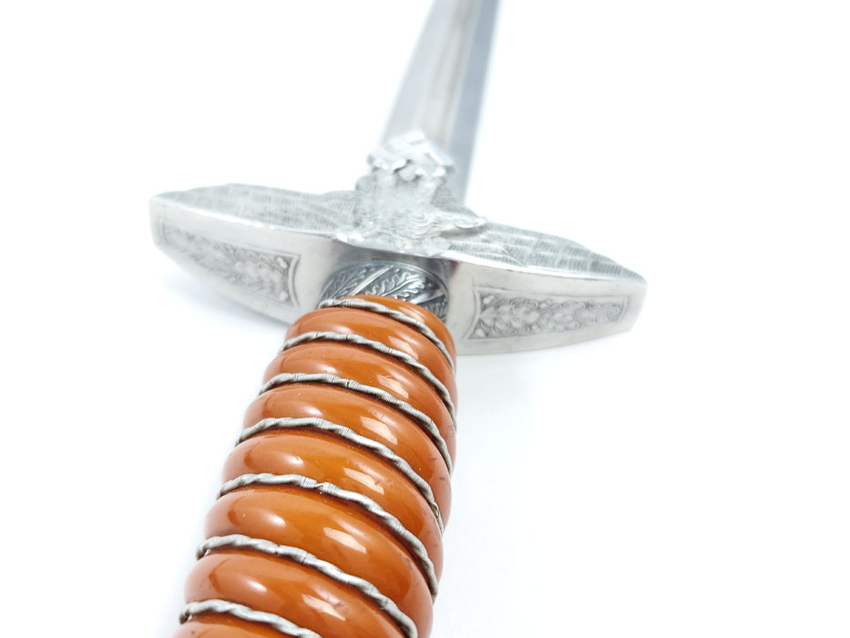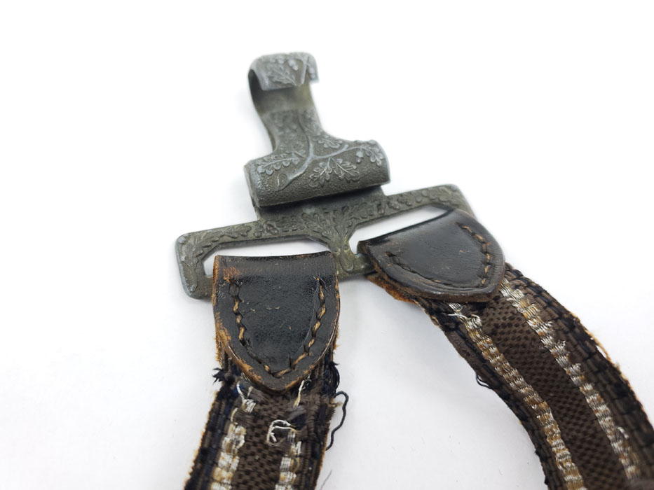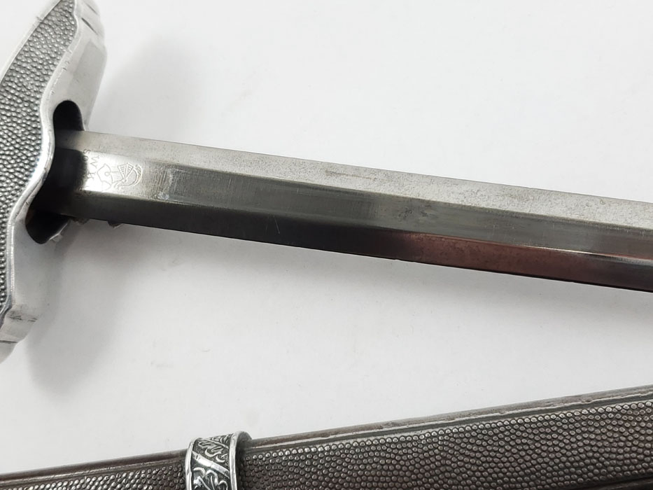 4/17/20 – This is an original Luftwaffe dagger from WW2, complete with the original scabbard and hanger. The dagger has a dark orange handle with tight wiring and no cracks or chips, only a few very small discolored scuffs. The blade has light oxidation throughout, which is mostly speckled gray spots, but they aren’t very dark. The reverse side of the blade is WKC maker stamped. The scabbard has no dents or major issues. The hanger has light fraying in a few areas but is completely in tact. Each clip is D.R.G.M. stamped, and there’s a RZM maker stamp on the hanger-end, with U.E. 10 stamped as well – see photos. The hanger-end doesn’t stay shut on its’ own.
