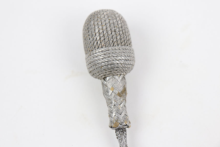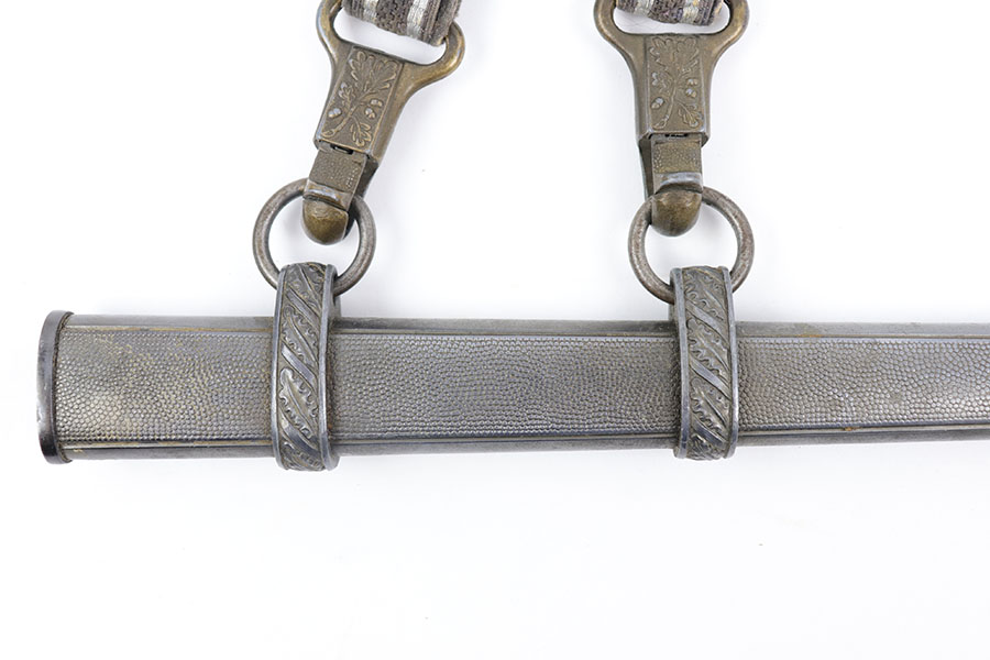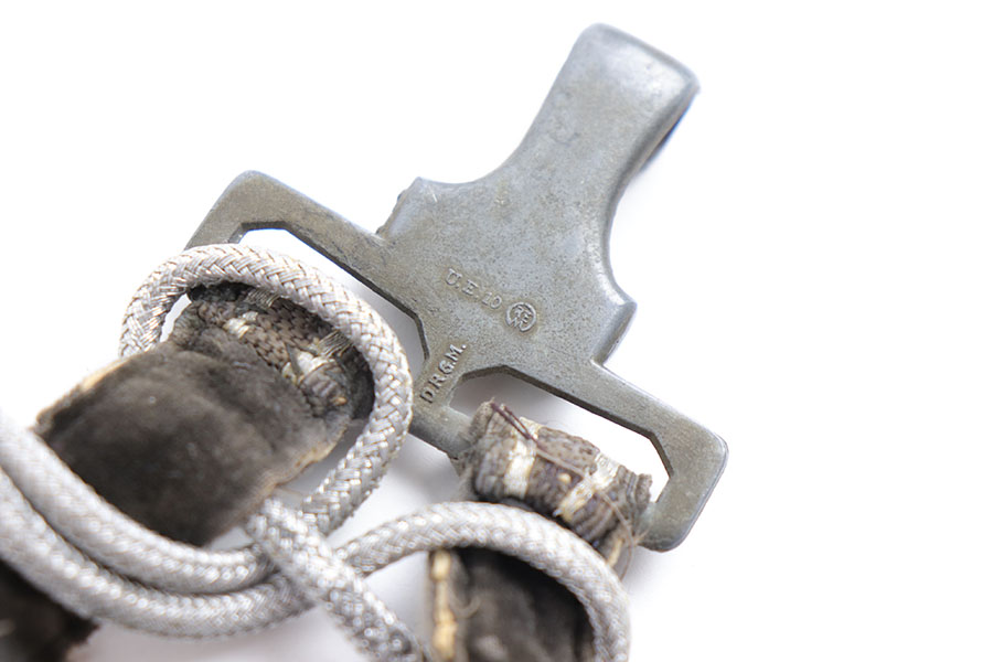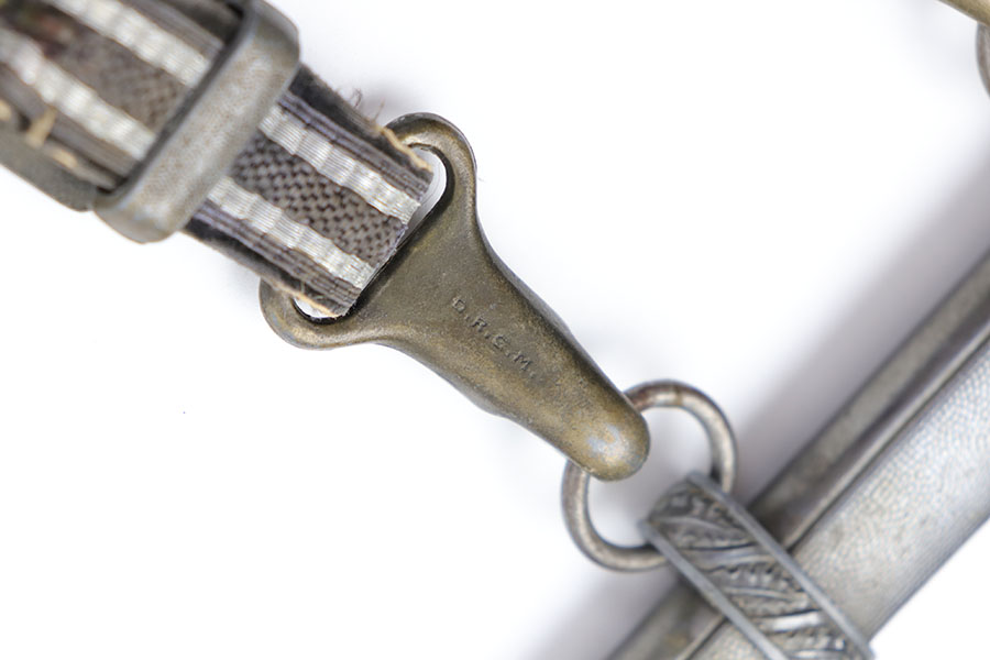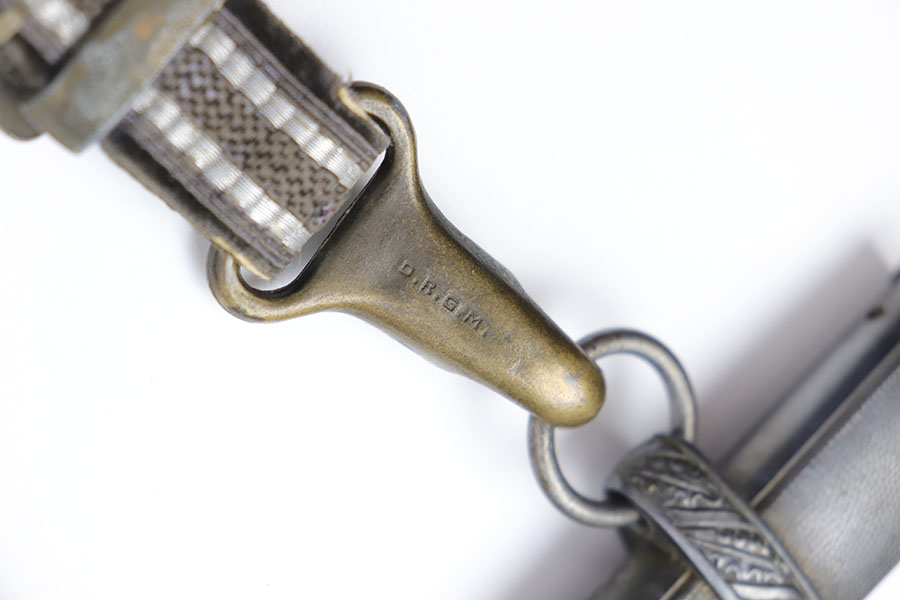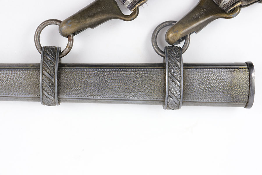 8/20/19 – This is an original Eickhorn Luftwaffe dagger, complete with a hanger & portepee. This is known as the 2nd model, made during WW2. The dagger has an excellent handle with no cracks or chips. The pommel has nice original gold finish in the logo. The blade itself has some very light oxidation / speckling in a few spots, but overall very clean and excellent. Eickhorn maker marking on one side. The scabbard has no dents or notable flaws. The hanger is RZM maker stamped, and each hook on the scabbard-attaching end is D.R.G.M. stamped. The portepee is in great condition with minimal fraying. All original and authentic.