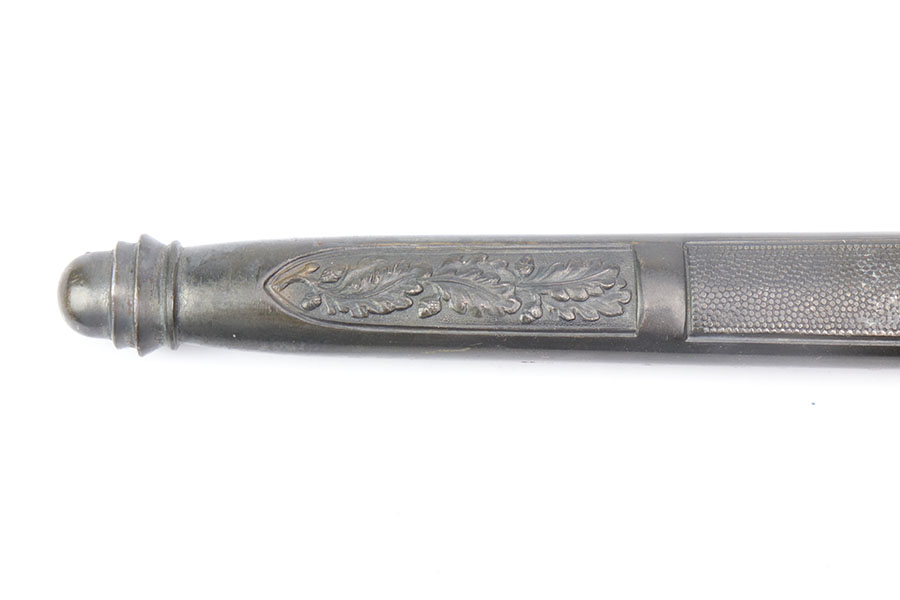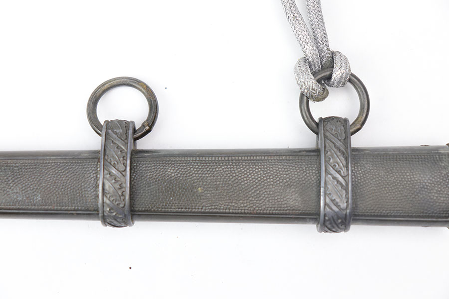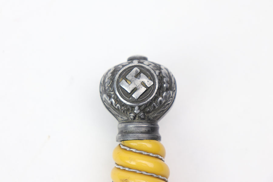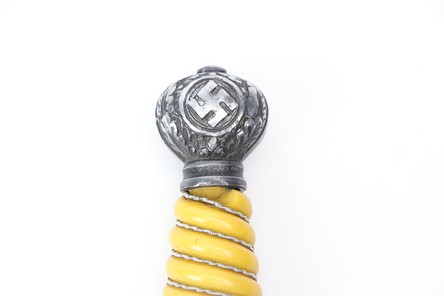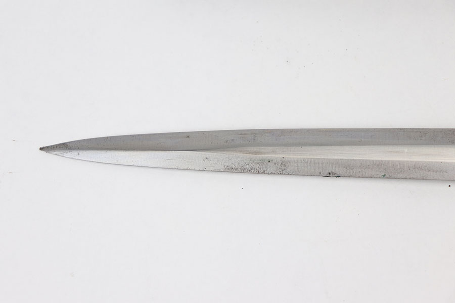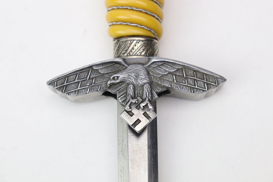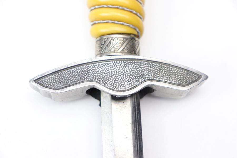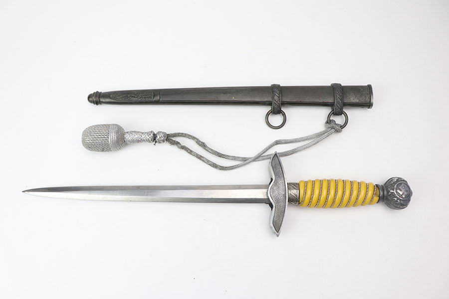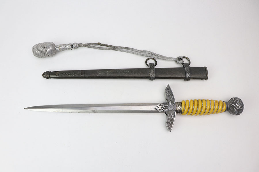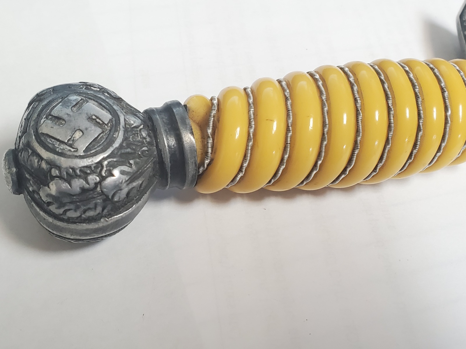8/17/20 – This is an original 2nd model Luftwaffe dagger with an original portepee. The dagger has no maker stamp, but there is evident cross graining on the blade. The blade is relatively clean with only a few specs of oxidation and light scabbard wear. The yellow bakelite handle has one small chip near the pommel. Metal fixtures are tight on the handle. The scabbard has darkened with patina but has no dents and is otherwise excellent. There is some light fraying on the rope of the portepee, but the knot is tight.