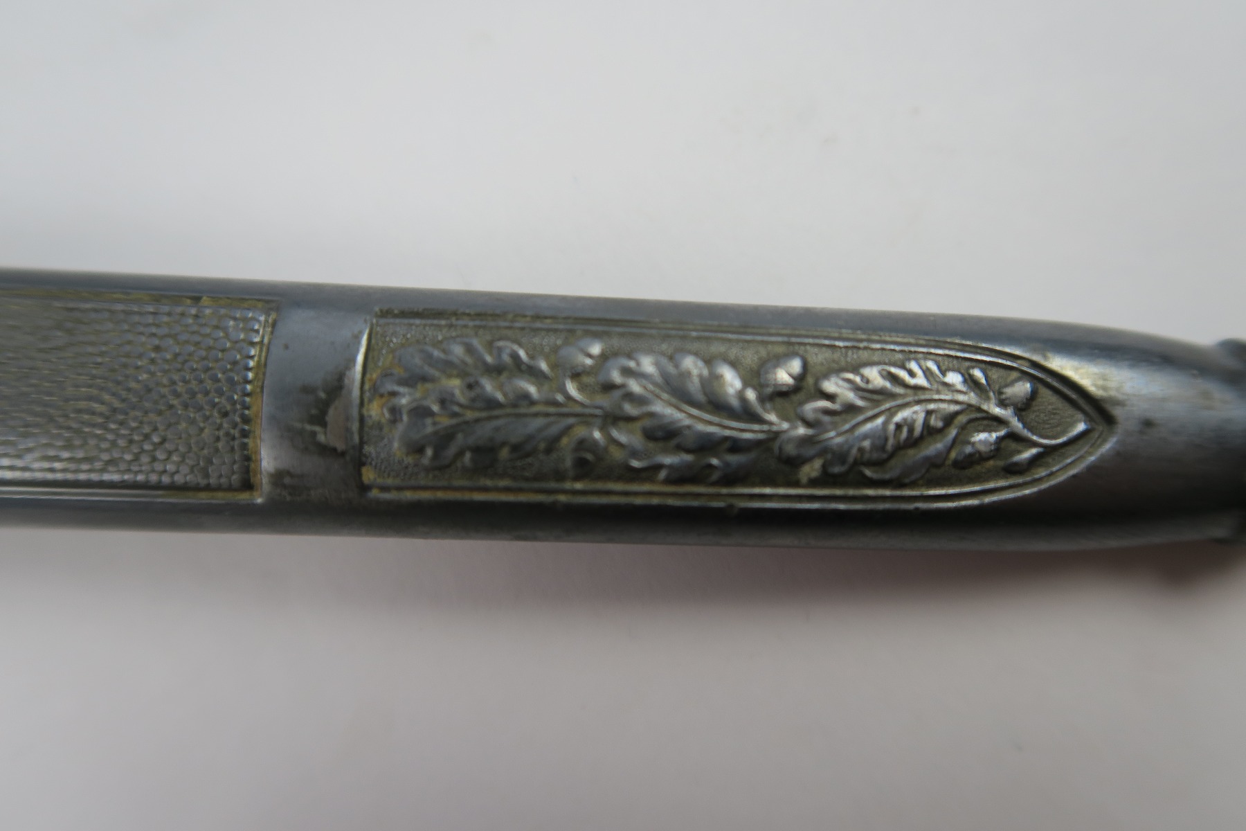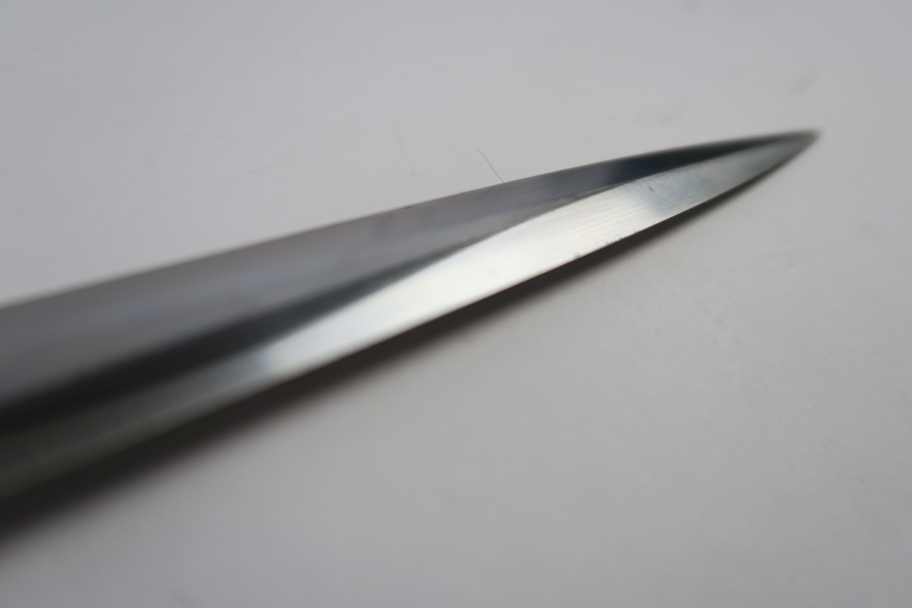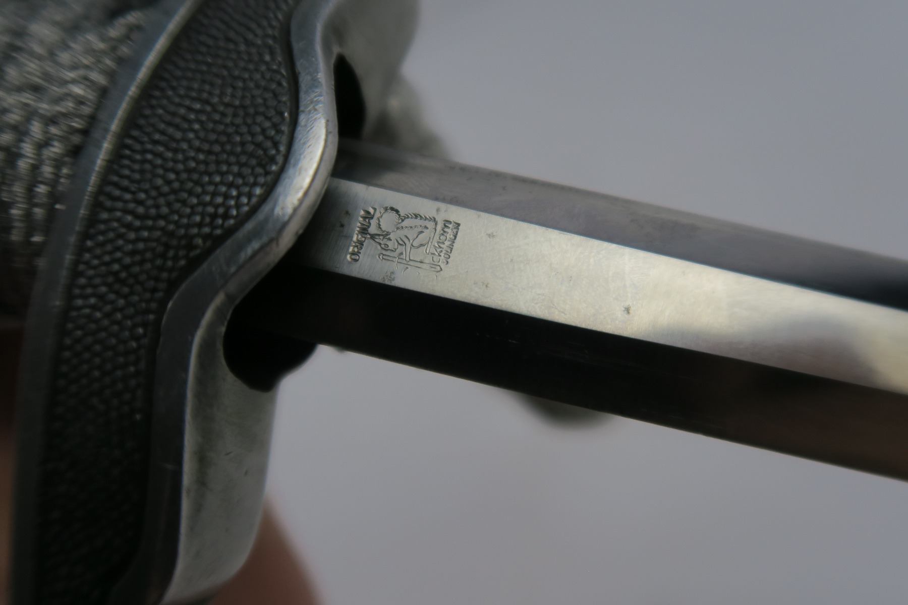 4/26/18 – This is an original WW2 Nazi Luftwaffe dagger, complete with the original scabbard, hanger, and portepee. The blade is Eickhorn maker stamped and in beautiful condition with minimal wear from being sheathed. There is very light wear on the blade, and no dark wear spots. The scabbard is also excellent with minor wear towards the tip of the scabbard. The handle of the dagger is minty with no cracks or chips. The hanger is also excellent with an RZM and maker stamp as well. There is minimal fraying on the hanger. Guaranteed all original.