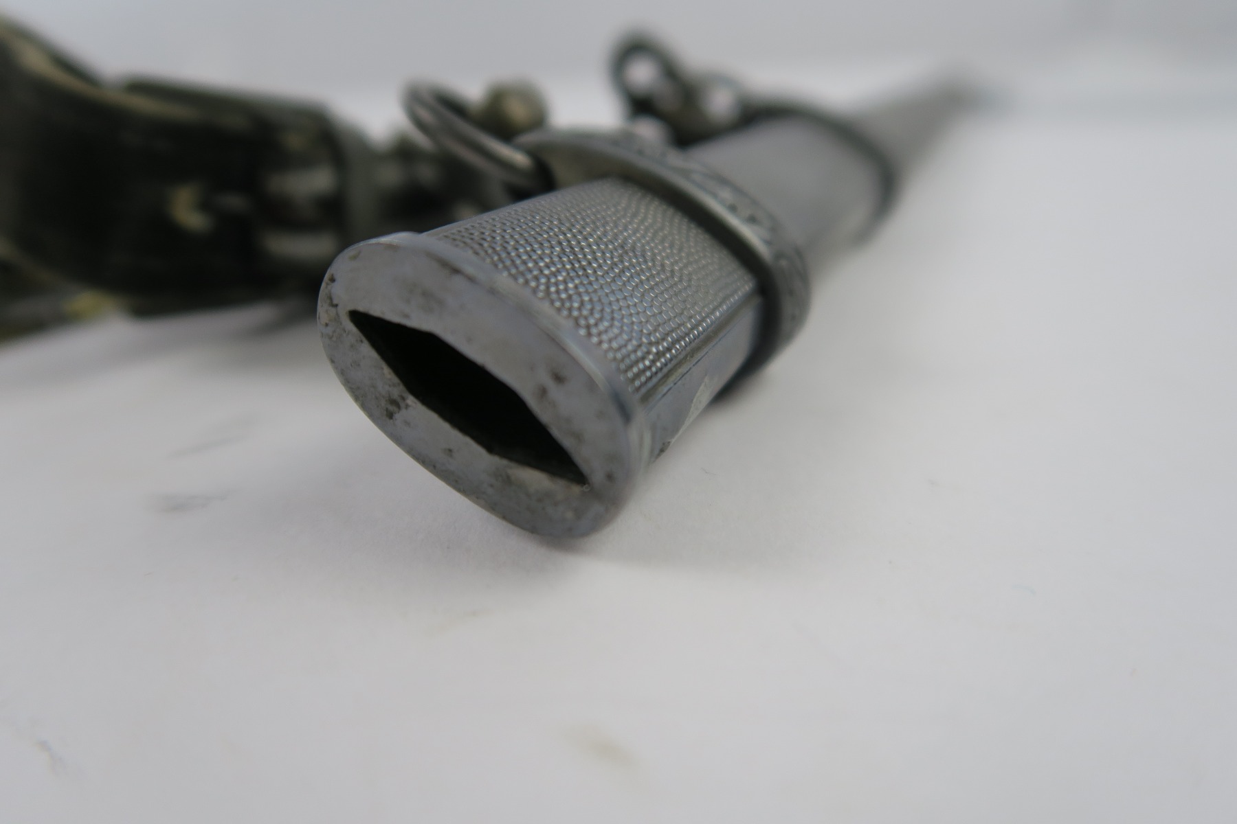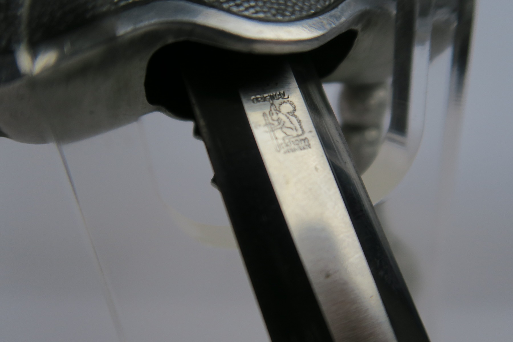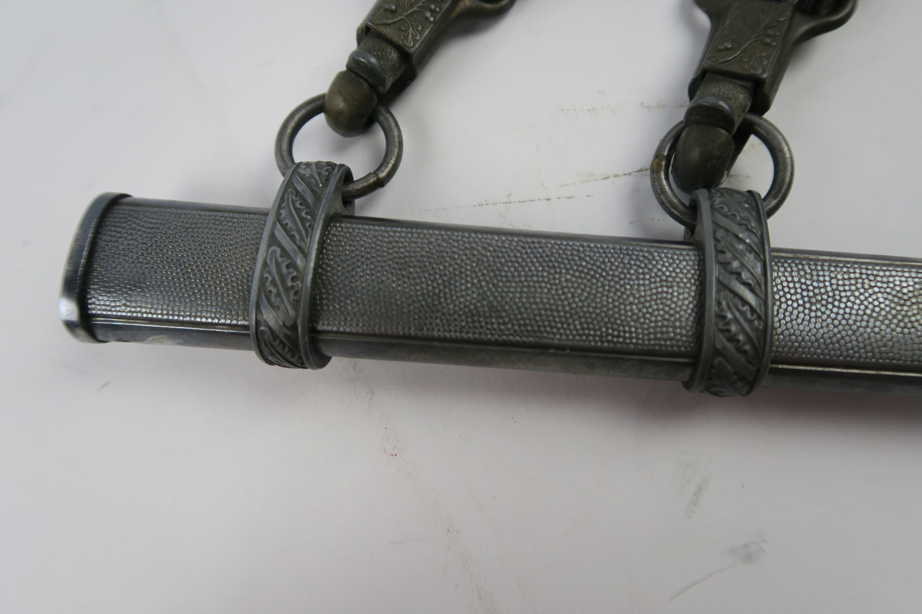 4/26/18 – This is an original WW2 Nazi Luftwaffe dagger, complete with the original scabbard, hanger, and portepee. The blade is Eickhorn maker stamped and in beautiful condition with minimal wear from being sheathed. There is very light wear on the blade, and no dark wear spots. The scabbard is also excellent with minor wear towards the tip of the scabbard. The handle of the dagger is minty with no cracks or chips. The hanger is also excellent with an RZM and maker stamp as well. There is minimal fraying on the hanger. Guaranteed all original.