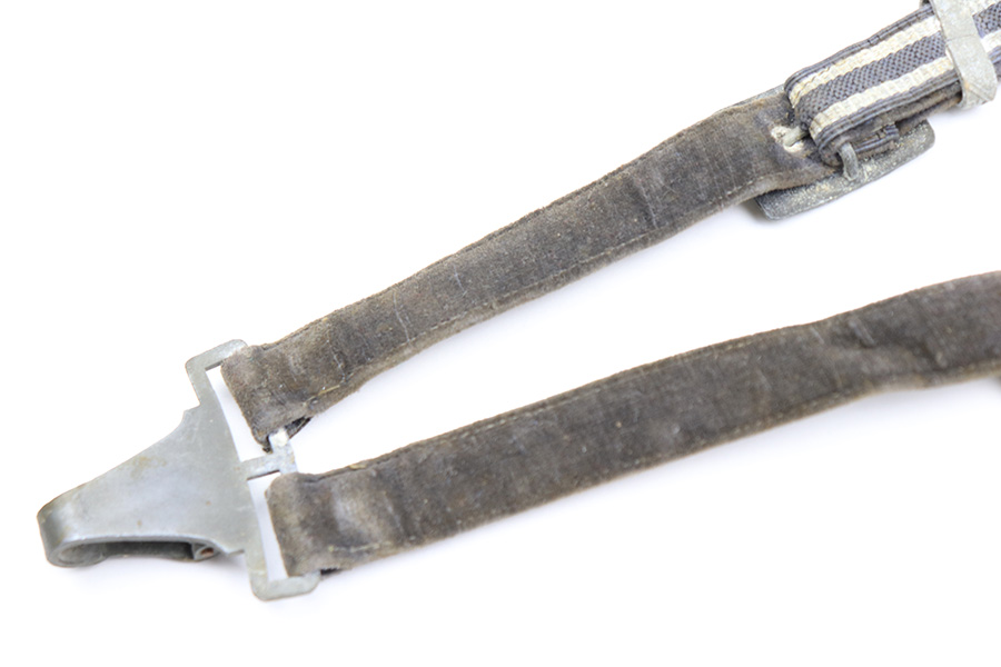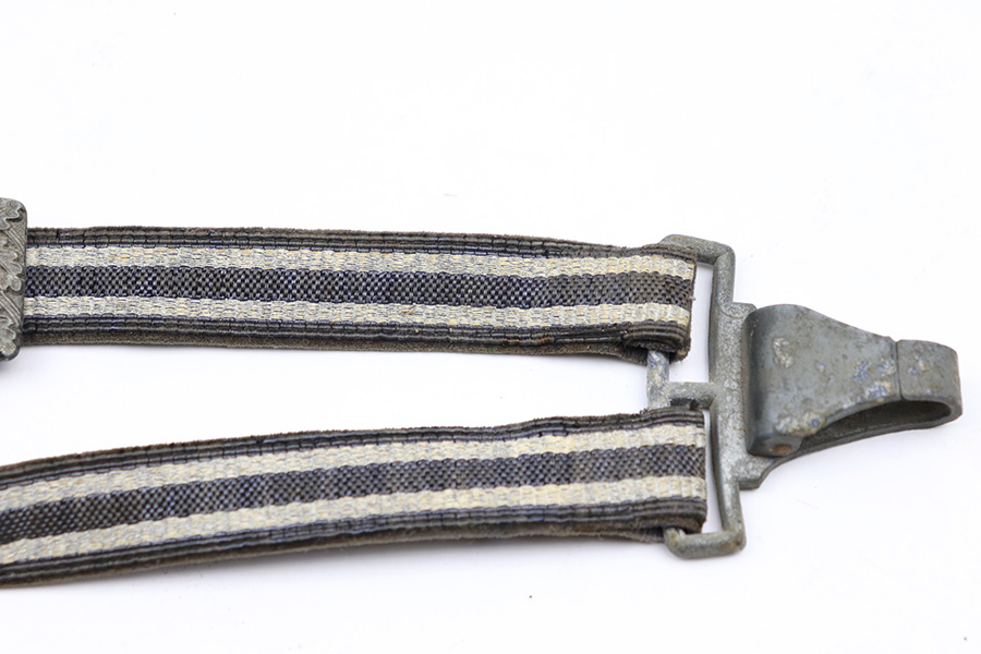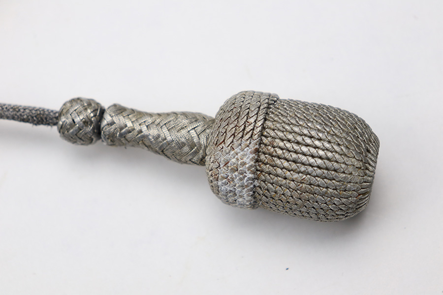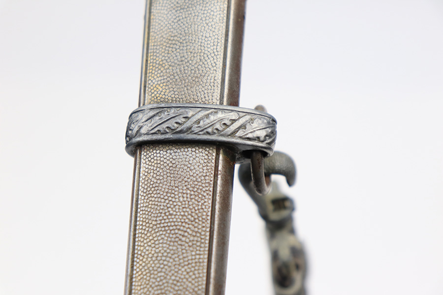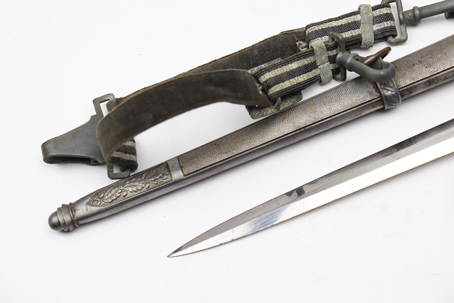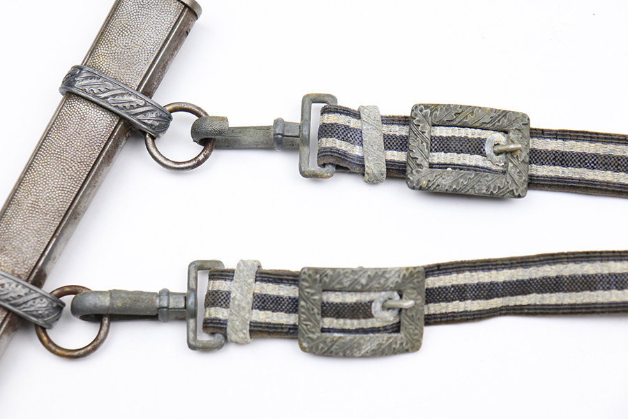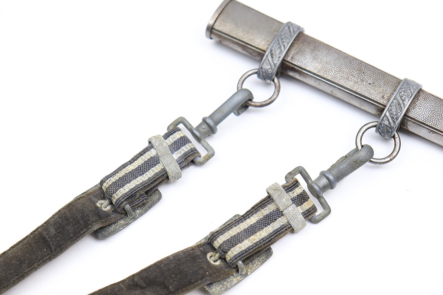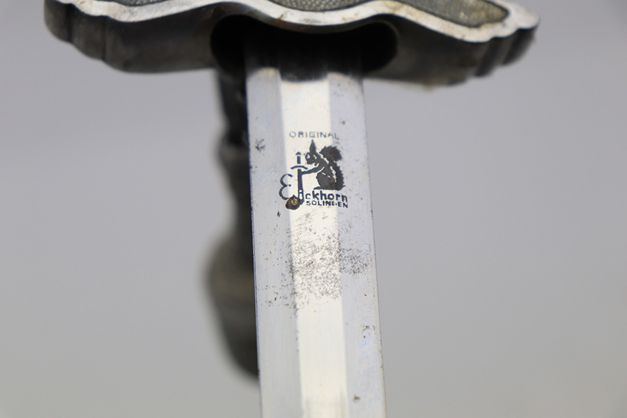 4/13/22 – This is an original 2nd model Luftwaffe dagger with an original hanger and portepee. The dagger blade is in great overall condition with a maker stamp by Eickhorn. There is some dark speckling and mild wear on either side of the blade, but no signs of sharpening or major issues. The handle is excellent with a very nice hand guard and pommel. The portepee has some mild fraying on the cord but the knot is tight. There is some mild, dark staining on the knot. The hanger has part of the upper clip missing, so the hanger doesn’t fully attach to the scabbard, but the rest of the hanger is in great condition. The scabbard has some mild surface patina but no rust or pitting.