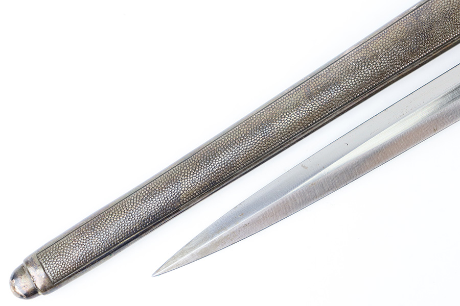 9/6/23 – This is an original WW2 production 2nd model Luftwaffe dagger. The dagger comes with an original scabbard, portepee and hanger. The dagger blade is well marked with a “SMF” maker stamp and logo on the backside of the blade. Above this maker marking is a Luftwaffe proof stamp, droop winged eagle/5. The blade shows light surface scratches and buff marks, along with speckling surface patina and discoloration. The edges are unsharpened and free of nicks or dents. The hand guard ahs very nice detail and some traces of original finish but mostly a natural aged look. The portepee is tight and clean throughout; excellent overall. The bakelite handle has no cracks or chips and a nicely wrapped silver chording. The pommel is excellent, maintaining the original gold coloring in the swastika and a great amount of original finish. Some typical high edge wear. The scabbard retains some of the original finish and is excellent overall. The hanger is in excellent condition as well, with a leather tab attached and “DRGM” stamped on the hanger clip.