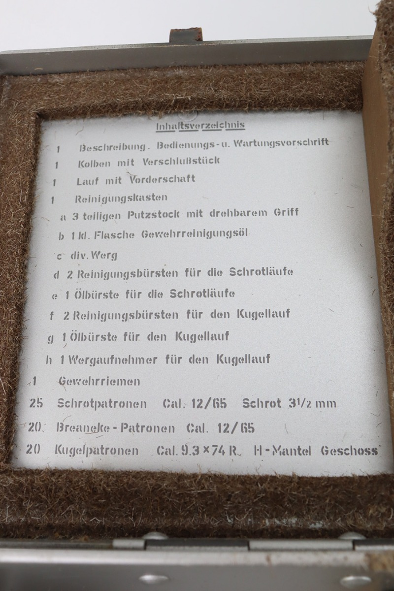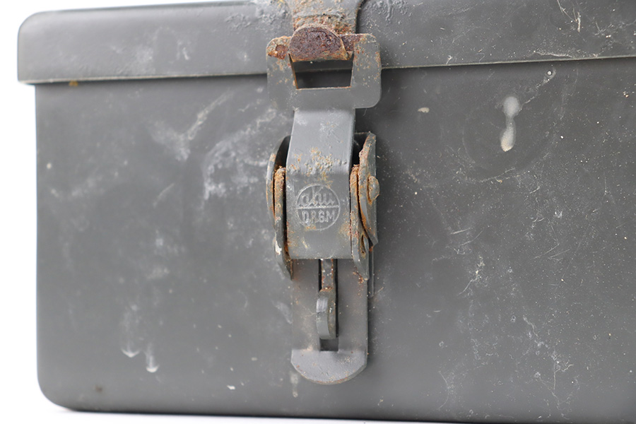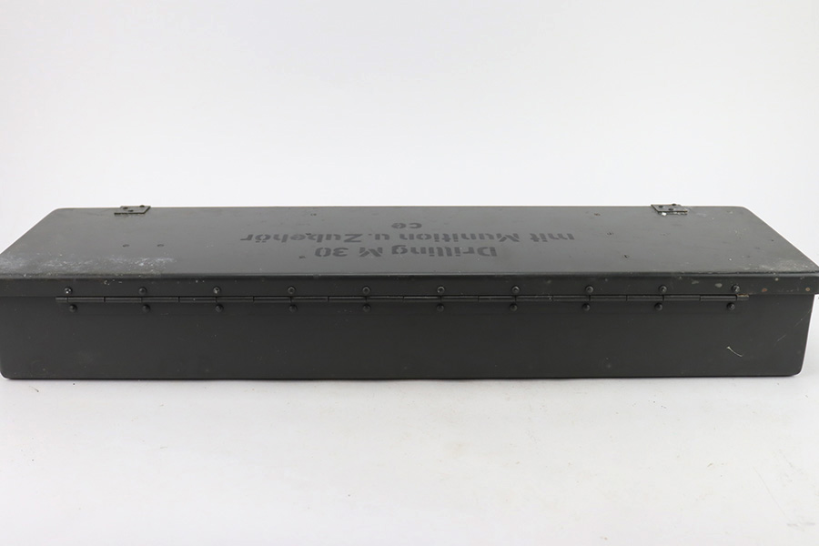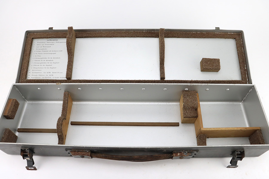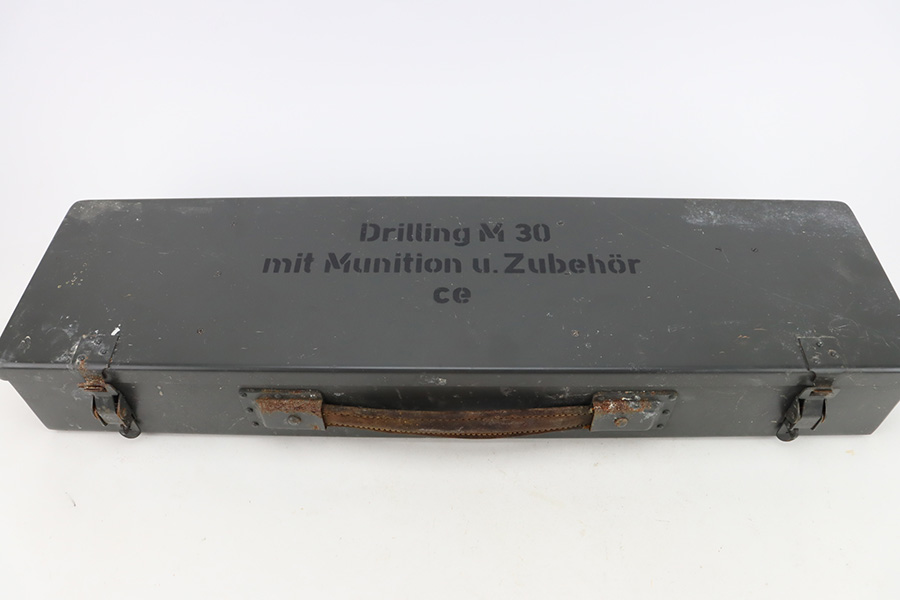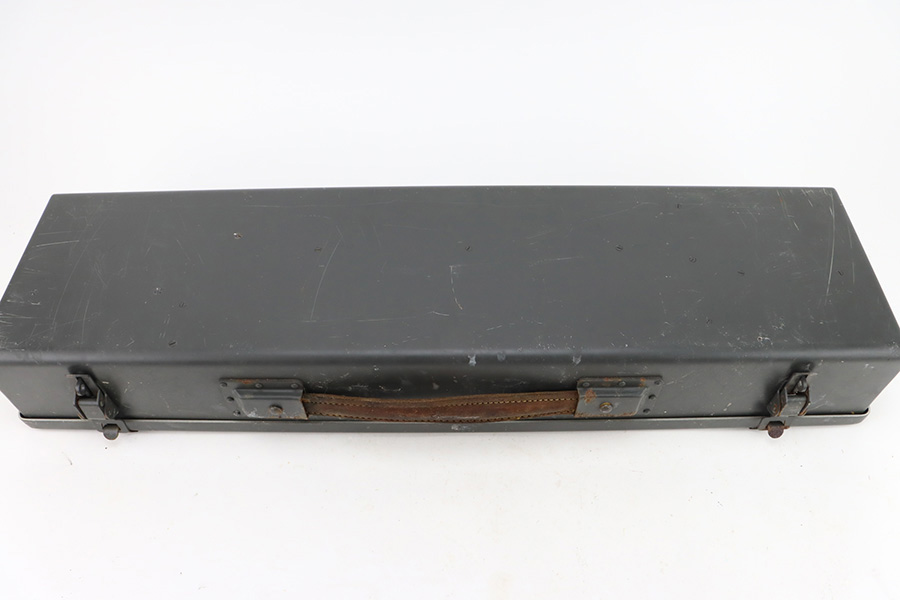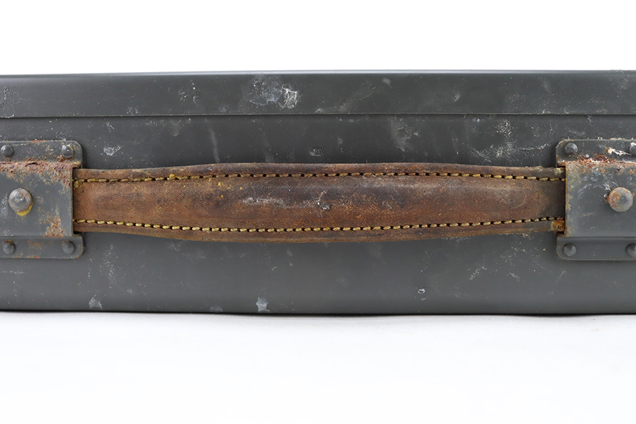 1/3/24 – This a metal case for a Luftwaffe Drilling M30 shotgun/rifle. “Eagle L2” Luftwaffe proofed on the base, under the leather carrying handle. This particular case has the proper military gray painted finish with clear markings. There are fairly light scratches and handling marks throughout and areas of noticeable corrosion and surface rust around the fittings. The leather carrying handle is fairly nice but a little dry. We believe the inside of the case may have been partially restored.